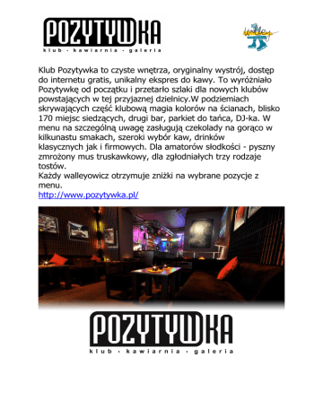 Klub Pozytywka to czyste wnętrza, oryginalny wystrój, dostęp do internetu gratis, unikalny ekspres do kawy. To wyróżniało Pozytywkę od początku i przetarło szlaki dla nowych klubów powstających w tej przyjaznej dzielnicy.W podziemiach skrywających część klubową magia kolorów na ścianach, blisko 170 miejsc siedzących, drugi bar, parkiet do tańca, DJ-ka. W menu na szczególną uwagę zasługują czekolady na gorąco w kilkunastu smakach, szeroki wybór kaw, drinków klasycznych jak i firmowych. Dla amatorów słodkości - pyszny zmrożony mus truskawkowy, dla zgłodniałych trzy rodzaje tostów. Każdy walleyowicz otrzymuje zniżki na wybrane pozycje z menu. http://www.pozytywka.pl/