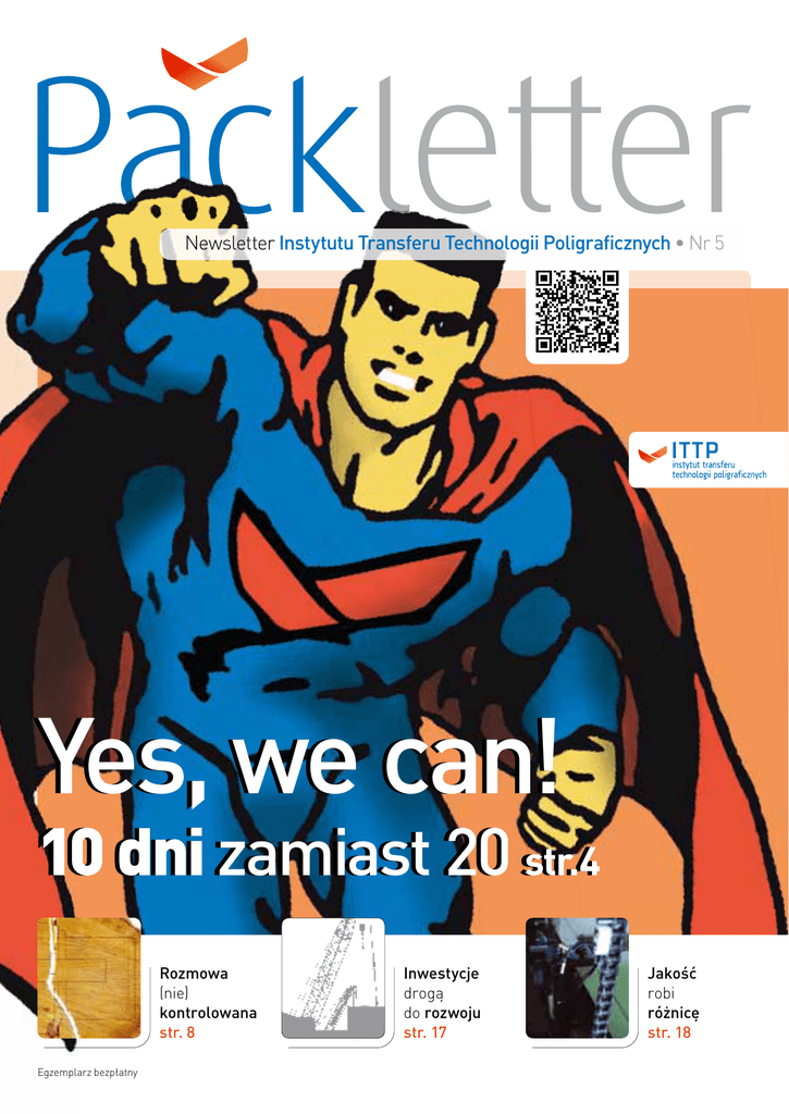 Newsletter Instytutu Transferu Technologii Poligraficznych • Nr 5 Yes, we can! 10 dni zamiast 20 str.4 str.4 Rozmowa (nie) kontrolowana str. 8 Egzemplarz bezpłatny Inwestycje drogą do rozwoju str. 17 Jakość robi różnicę str. 18 Wybierz jakość Japońskie automaty sztancujące najwyższej jakości Wyłączny dystrybutor marki Sanwa w Polsce www.ittp.com.pl 2 W numerze Od redakcji Temat numeru Alternatywa, która się opłaca ................................ 4 Wydarzenia Więcej, lepiej, Packletter! Chcesz więcej zarabiać na produkcji poligraficznej, wzmacniając rentowność swojej firmy? Chcesz lepiej, efektywniej prowadzić swą działalność? Jeśli odpowiedzi są twierdzące, to z pewnością Packletter jest dla Ciebie! Jeśli natomiast nie interesują Cię powyższe korzyści – zapewne nie jesteś z branży... Dlaczego więcej? Bo począwszy od tego numeru będziemy ukazywać się w nakładzie 4000 egzemplarzy. Fakt ten cieszy nas tym bardziej, że to Wy – nasi Czytelnicy, daliście nam bodziec do tego, żeby nieustannie doskonalić formę naszego newslettera, a przez to zyskując Waszą aprobatę i zainteresowanie, „wypłynąć z nim na szersze wody” z tak dużym nakładem. Dlaczego lepiej? Bo żyjemy w świecie, który wymusza na nas ciągły postęp zgodnie z powiedzeniem, że kto stoi w miejscu, ten się cofa. I nie ma w tym nic złego, jeśli pamięta się o tym, że ów postęp oznacza lepsze, a nie tylko nowe. Zatem proponujemy Państwu odmieniony, unowocześniony layout, który z pewnością uczyni lekturę jeszcze bardziej przyjemną. Zgodnie z nową nazwą naszego newslettera, areną naszych dociekań i targetowym epicentrum jest sektor produkcji opakowań. Jesteśmy przekonani, że nasza wiedza, nasze rozwiązania technologiczne oraz innowacyjne podejście będzie dla Was – naszych odbiorców – źródłem inspiracji rozwoju własnych biznesów, a tym samym zachętą do współpracy z Instytutem Transferu Technologii Poligraficznych. A gra jest warta świeczki, bo zgodnie z najświeższymi raportami polska poligrafia znajduje się w przededniu znaczących zmian. Prognozy na najbliższą przyszłość są obiecujące, bowiem rok 2010 jawi się jako powrót na ścieżkę stabilnego rozwoju, a na kolejne lata przedsiębiorcy przewidują wzrost sprzedaży oraz rozwój stosowanych technologii, głównie za sprawą innowacji procesowych, które w ostatnich latach wprowadziło aż 61% podmiotów działających w sektorze poligraficznym. Według Ekspertów, nadal będzie postępować wzrost produkcji materiałów opakowaniowych, a co za tym idzie – zwiększenie udziału w rynku poligraficznym produktów fleksograficznych. Na kolejnych stronach znajdziecie Państwo wiele sposobów na presję konkurencji i uplasowanie się w mocnej czołówce polskiej branży opakowaniowej, dlatego nie przedłużając wstępu, zapraszam dalej. Gabriela Prokocka-Kazek redaktor naczelny [email protected] Duran – nieograniczona wyobrażnia ..................................... 11 Super wyobrażnia ........................................ 9 Coś wyobrażnia ........................................ 9 Rozmowa Rozmowa (nie)kontrolowana ............................ 8 Instalacje IPAK doposaża park maszynowy ............................ 13 IML – in-mould labeling w Gdańsku ...................................... 14 Pierwsza Beta w polsce .......................................... 15 Trendy Inwestycje drogą do rozwoju ........................... 17 Technologie 18 Fundusze 22 Jakość robi różnicę ........................ Ostatni dzwonek ........................... Adres redakcji / Wydawca: M.M. Druk Serwis, ul. Piłsudskiego 73, 32-050 Skawina, tel. 012 252 77 77, www.ittp.com.pl • Redakcja: Gabriela Prokocka-Kazek • Opracowanie graficzne: Ziemowit Kościelny • Zdjęcia: Archiwum ITTP • Przedruki i wykorzystywanie w jakiejkolwiek innej formie bez pisemnej zgody Wydawcy – zabronione. Nakład 4000 egz. Temat numeru 10 dni zamiast 20? Czy to możliwe, aby skrócić o połowę standardowy cykl produkcji opakowań? Czy wystarczą do tego dwa urządzenia? Czy można dobrze zarobić na niskich nakładach? Teraz już tak! Odpowiedzią na takie wyzwania są maszyny Gamma i Flatbed Die Cutting, brytyjskiej marki Edale, dające możliwość liniowego połączenia kluczowych procesów technologicznych. Alternatywa, która się opłaca Nowy wymiar w produkcji opakowań W iększość drukarń opakowaniow ych, jak również akcydensow ych tr api obecnie problem „niskonakładowości”. Rynek wydaje się być nieubłagany, a trend do redukcji nakładów staje się w poligrafii rzeczą normalną. Drukarze narzekają, iż rachunek ekonomiczny niestety nie pozwala im spokojnie patrzeć w przyszłość, ponieważ opłacalność produkcji opakowań metodą offsetową w stosunku do poziomu marży, jest coraz niższa. Jak temu zaradzić? Jak sprawić, aby „niskonakładowość” i duża zmienność prac produkcyjna przynosiła drukarniom zyski? Czas to pieniądz! Rozwiązaniem tego typu dylematów może okazać się propozycja, jaką chcieliśmy przedstawić Państwu w tym artykule. Jest to połączenie druku fleksograficznego z roli na rolę na maszynie Gamma (Edale) z płaskim automatem sztancującym tzw. Flatbed Die 4 Cutting Unit „FDC-510”. Dostosowanie parku maszynowego, zgodnie z wymogami rynku, decyduje o konkurencyjności i wpływa na silną pozycję firmy. – Z punktu widzenia technologicznego, jest to rozwiązanie skrojone na dzisiejsze czasy tzn. w jednym przelocie możemy drukować, uszlachetniać, sztancować, tłoczyć, uzyskując finalnie gotowy wykrój wprost do przeniesienia na składarko-sklejarkę i kolejno do pakowania i dystrybucji – mówi Konrad Starościk, menadżer produktu w ITTP. Dodatkową zaletą jest redukcja przestojów i przerw technologicznych, które są nieodzownym zjawiskiem w przypadku produkcji opakowań metodą konwencjonalną: – Połącz