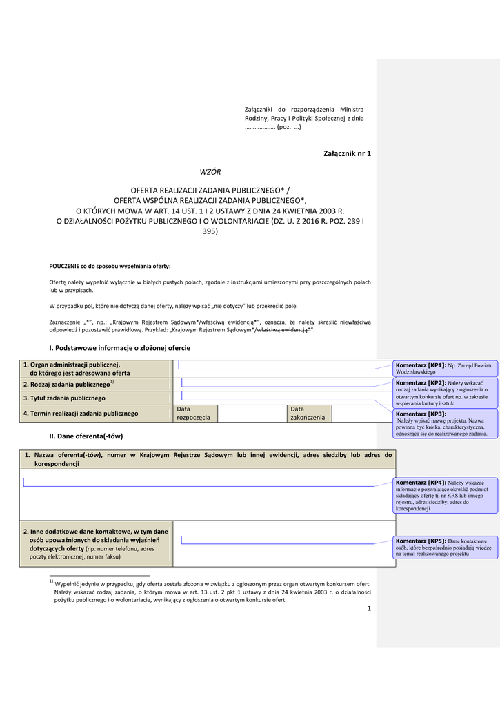 Załączniki do rozporządzenia Ministra Rodziny, Pracy i Polityki Społecznej z dnia ………………. (poz. …) Załącznik nr 1 WZÓR OFERTA REALIZACJI ZADANIA PUBLICZNEGO* / OFERTA WSPÓLNA REALIZACJI ZADANIA PUBLICZNEGO*, O KTÓRYCH MOWA W ART. 14 UST. 1 I 2 USTAWY Z DNIA 24 KWIETNIA 2003 R. O DZIAŁALNOŚCI POŻYTKU PUBLICZNEGO I O WOLONTARIACIE (DZ. U. Z 2016 R. POZ. 239 I 395) POUCZENIE co do sposobu wypełniania oferty: Ofertę należy wypełnić wyłącznie w białych pustych polach, zgodnie z instrukcjami umieszonymi przy poszczególnych polach lub w przypisach. W przypadku pól, które nie dotyczą danej oferty, należy wpisać „nie dotyczy” lub przekreślić pole. Zaznaczenie „*”, np.: „Krajowym Rejestrem Sądowym*/właściwą ewidencją*”, oznacza, że należy skreślić niewłaściwą odpowiedź i pozostawić prawidłową. Przykład: „Krajowym Rejestrem Sądowym*/właściwą ewidencją*”. I. Podstawowe informacje o złożonej ofercie 1. Organ administracji publicznej, do którego jest adresowana oferta 2. Rodzaj zadania publicznego Komentarz [KP1]: Np. Zarząd Powiatu Wodzisławskiego Komentarz [KP2]: Należy wskazać rodzaj zadania wynikający z ogłoszenia o otwartym konkursie ofert np. w zakresie wspierania kultury i sztuki 1) 3. Tytuł zadania publicznego 4. Termin realizacji zadania publicznego Data rozpoczęcia Data zakończenia Komentarz [KP3]: Należy wpisać nazwę projektu. Nazwa powinna być krótka, charakterystyczna, odnosząca się do realizowanego zadania. II. Dane oferenta(-tów) 1. Nazwa oferenta(-tów), numer w Krajowym Rejestrze Sądowym lub innej ewidencji, adres siedziby lub adres do korespondencji Komentarz [KP4]: Należy wskazać informacje pozwalające określić podmiot składający ofertę tj. nr KRS lub innego rejestru, adres siedziby, adres do korespondencji 2. Inne dodatkowe dane kontaktowe, w tym dane osób upoważnionych do składania wyjaśnień dotyczących oferty (np. numer telefonu, adres Komentarz [KP5]: Dane kontaktowe osób, które bezpośrednio posiadają wiedzę na temat realizowanego projektu poczty elektronicznej, numer faksu) 1) Wypełnić jedynie w przypadku, gdy oferta została złożona w związku z ogłoszonym przez organ otwartym konkursem ofert. Należy wskazać rodzaj zadania, o którym mowa w art. 13 ust. 2 pkt 1 ustawy z dnia 24 kwietnia 2003 r. o działalności pożytku publicznego i o wolontariacie, wynikający z ogłoszenia o otwartym konkursie ofert. 1 3. Nazwa, adres i dane kontaktowe jednostki organizacyjnej bezpośrednio wykonującej zadanie publiczne, o którym mowa w ofercie (należy wypełnić, jeżeli zadanie ma być realizowane przez oddział terenowy, placówkę lub inną jednostkę organizacyjną oferenta) Komentarz [KP6]: Podajemy dane koła, oddziału, jeśli realizuje on zadanie. 4. Przedmiot działalności pożytku publicznego: 1) działalność nieodpłatna pożytku publicznego: Komentarz [KP7]: Należy przedstawić zapisy zgodnie ze statutem i wyciągiem z odpowiedniego rejestru (np.KRS) dotyczące działalności nieodpłatnej pożytku publicznego i powiązać to z zakresem wskazanym w konkursie. Jeśli oferent nie prowadzi działalności statutowej nieodpłatnej należy wpisać „nie dotyczy”. 2) działalność odpłatna pożytku publicznego: III. Informacja o sposobie reprezentacji oferenta(-tów) wobec organu administracji publicznej, w tym imiona i nazwiska osób upoważnionych do reprezentowania oferenta(-tów) wobec organu administracji publicznej, wraz z przytoczeniem podstawy prawnej2) Komentarz [KP8]: Należy przedstawić zapisy zgodnie ze statutem i wyciągiem z odpowiedniego rejestru (np.KRS) dotyczące działalności odpłatnej pożytku publicznego (przychody nie przewyższają kosztów) i powiązać to z zakresem wskazanym w konkursie. Jeśli oferent nie prowadzi działalności statutowej odpłatnej należy wpisać „nie dotyczy”. Komentarz [KP9]: Należy wskazać wszystkie osoby reprezentujące oferenta zgodne ze statutem, pełnomocnictwem lub innym dokumentem oraz podstawę prawną reprezentacji (należy pamiętać, aby podać imiona i nazwiska). IV. Szczegółowy zakres rzeczowy oraz kalkulacja przewidywanych kosztów zadania publicznego 1. Streszczenie zadania publicznego wraz ze wskazaniem miejsca jego realizacji Komentarz [KP10]: Opisujemy w sposób konkretny, krótki, logiczny i spójny zadanie wraz ze wskazaniem miejsca jego realizacji. 2. Opis potrzeb wskazujących na celowość wykonania zadania publicznego wraz z liczbą oraz opisem odbiorców tego zadania Komentarz [KP11]: Zadanie realizowane być powinno w odpowiedzi na potrzeby mieszkańców powiatu wodzisławskiego. Można dokonać analizy posługując się przy tym obiektywnymi informacjami np. GUS. 2) Należy określić, czy podstawą są zasady określone w statucie, pełnomocnictwo czy też inna podstawa. 2 3. Uzasadnienie potrzeby dofinansowania z dotacji inwestycji związanych z realizacją zadania publicznego, w szczególności ze 3) wskazaniem, w jaki sposób przyczyni się to do podwyższenia standardu realizacji zadania Komentarz [KP12]: Dotyczy tylko sytuacji ubiegania się o dofinansowanie inwestycji np. zakupu środka trwałego na potrzeby realizacji zadania. Jeżeli oferent nie ubiega się o dofinansowanie inwestycji należy podać „nie dotyczy”. 4. Zakładany(-ne) cel(e) realizacji zadania publicznego Komentarz [KP13]: Należy w punktach wymienić cele jakie zostaną osiągnięte dzięki realizacji zadania. W miarę możliwości powinno odnosić się do konkretnych liczb. 5. Opis zakładanych rezultatów realizacji zadania publicznego (należy opisać zakładane rezultaty zadania publicznego – czy będą trwałe oraz w jakim stopniu realizacja zadania przyczyni się do osiągnięcia jego celu) Komentarz [KP14]: Należy szczegółowo opisać rezultaty realizacji zadania i w sposób logiczny połączyć je z celami zadania. Dodatkowe informacje dotyczące rezultatów realizacji zad