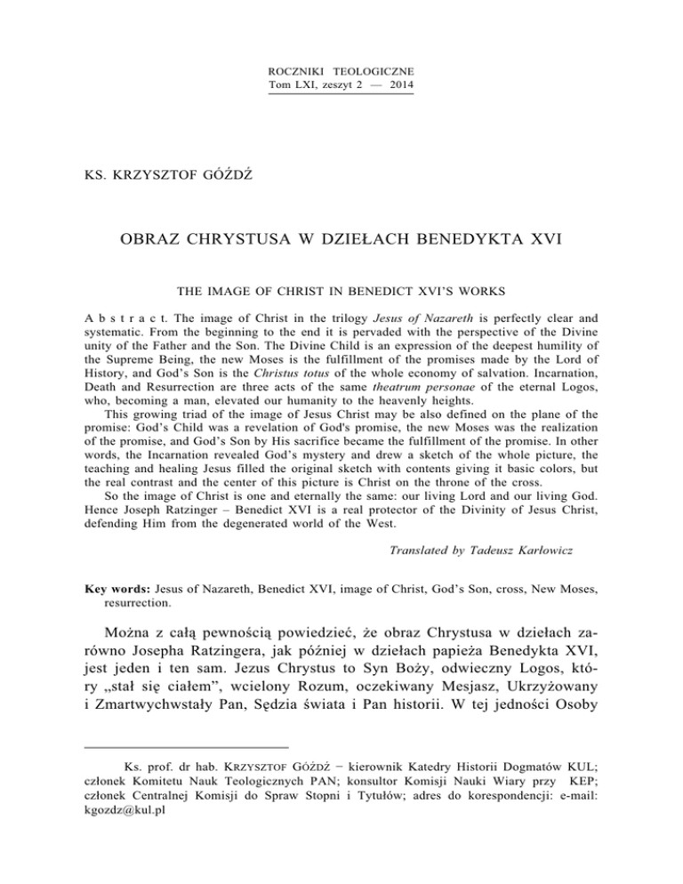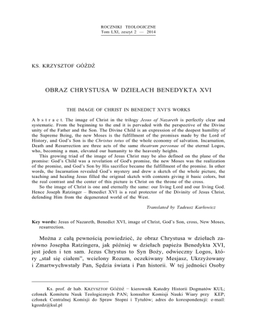 ROCZNIKI TEOLOGICZNE Tom LXI, zeszyt 2 — 2014 KS. KRZYSZTOF GÓŹDŹ OBRAZ CHRYSTUSA W DZIEŁACH BENEDYKTA XVI THE IMAGE OF CHRIST IN BENEDICT XVI’S WORKS A b s t r a c t. The image of Christ in the trilogy Jesus of Nazareth is perfectly clear and systematic. From the beginning to the end it is pervaded with the perspective of the Divine unity of the Father and the Son. The Divine Child is an expression of the deepest humility of the Supreme Being, the new Moses is the fulfillment of the promises made by the Lord of History, and God’s Son is the Christus totus of the whole economy of salvation. Incarnation, Death and Resurrection are three acts of the same theatrum personae of the eternal Logos, who, becoming a man, elevated our humanity to the heavenly heights. This growing triad of the image of Jesus Christ may be also defined on the plane of the promise: God’s Child was a revelation of God's promise, the new Moses was the realization of the promise, and God’s Son by His sacrifice became the fulfillment of the promise. In other words, the Incarnation revealed God’s mystery and drew a sketch of the whole picture, the teaching and healing Jesus filled the original sketch with contents giving it basic colors, but the real contrast and the center of this picture is Christ on the throne of the cross. So the image of Christ is one and eternally the same: our living Lord and our living God. Hence Joseph Ratzinger – Benedict XVI is a real protector of the Divinity of Jesus Christ, defending Him from the degenerated world of the West. Translated by Tadeusz Karłowicz Key words: Jesus of Nazareth, Benedict XVI, image of Christ, God’s Son, cross, New Moses, resurrection. Można z cała˛ pewnościa˛ powiedzieć, że obraz Chrystusa w dziełach zarówno Josepha Ratzingera, jak później w dziełach papieża Benedykta XVI, jest jeden i ten sam. Jezus Chrystus to Syn Boży, odwieczny Logos, który „stał sie˛ ciałem”, wcielony Rozum, oczekiwany Mesjasz, Ukrzyżowany i Zmartwychwstały Pan, Se˛dzia świata i Pan historii. W tej jedności Osoby Ks. prof. dr hab. KRZYSZTOF GÓŹDŹ − kierownik Katedry Historii Dogmatów KUL; członek Komitetu Nauk Teologicznych PAN; konsultor Komisji Nauki Wiary przy KEP; członek Centralnej Komisji do Spraw Stopni i Tytułów; adres do korespondencji: e-mail: [email protected] 18 KS. KRZYSZTOF GÓŹDŹ Syna Bożego jako „obrazu Boga niewidzialnego” wyraża sie˛ różnorodność aspektów jej postrzegania, ale składajaca ˛ sie˛ zawsze na jeden wielki obraz „Pierworodnego wszelkiego stworzenia” i „Pierworodnego pośród umarłych” (por. Kol 1, 15-20). W trylogii Benedykta XVI Jezus z Nazaretu (2007-2012) ten jeden obraz Chrystusa nabiera szczególnych rysów, wie˛kszej wyrazistości i nowych świetlistych barw, przez co staje sie˛ swoista˛ pełnia. ˛ Pomaga to wielu ludziom nie tylko ten obraz zobaczyć, ale też go doświadczyć i na nowo odczuć w swoim codziennym życiu. Benedykt wydaje sie˛ w tym pisanym obrazie dokonywać przejrzystego wzrastania od szkicu Bożego Dziecie˛cia, przez postać Nowego Mojżesza, aż po pełnie˛ oblicza Syna Bożego. Ten tryptyk pisania obrazu Chrystusa zamyka sie˛ w chronologii dzieła Jezus z Nazaretu: od dzieciństwa (cze˛ść III), przez działalność publiczna˛ (cze˛ść I), aż po śmierć krzyżowa˛ i zmartwychwstanie (cze˛ść II). Sam Benedykt XVI podkreśla, że dzieło to nie należy w żaden sposób do wypowiedzi Urze˛du Nauczycielskiego Kościoła, lecz jest osobistym poszukiwaniem „oblicza Pana”1. I. BOŻE DZIECIE˛ Zaskakujaco ˛ Benedykt XVI rozpoczyna rozważania nad dzieciństwem Jezusa od pytania Piłata: „Skad ˛ Ty jesteś? (J 19, 9). Jezus nie daje odpowiedzi bezpośredniej, ale z dialogu Piłat wywnioskował, że władza nad Jezusem pochodzi „z góry”. Dlatego też usiłował Go uwolnić (w. 12). Już w tym pytaniu widać, że pochodzenie Jezusa ma decydujace ˛ znaczenie i dzieli sie˛ na dwa przeciwstawne poglady. ˛ Jeden to poglad ˛ ziemski, „z dołu”, wskazujacy, ˛ że Jezus jest jednym z nas. Drugi natomiast jest pogladem ˛ niebieskim, boskim, „z góry”, od Ojca, wyrażajacym ˛ autorytet Jezusa. Wydaje sie˛ zatem, że pochodzenie Jezusa jest jednocześnie znane i nieznane2. Pełna˛ odpowiedź na to pytanie daja˛ Ewangelie, a w szczególności genealogie Mateusza (Mt 1, 117) i Łukasza (Łk 3, 23-38). 1 Joseph R a t z i n g e r/B e n e d y k t XVI, Jezus z Nazaretu. Cz. 1: Od chrztu w Jordanie do Przemienienia, Kraków 2007, s. 14 (dalej cyt.: JzN, 1). Można powiedzieć, że szczególne poszukiwanie „oblicza Pana” rozpoczał ˛ Benedykt XVI już na poczatku ˛ swojego pontyfikatu. Dnia 1 września 2006 r. odbył jako swoja˛ pierwsza˛ pielgrzymke˛ właśnie do Manoppello w Abruzzi. Z namaszczeniem mówił o tym wizerunku acheiropoietos (obraz wykonany nie re˛ka˛ ludzka). ˛ Por. P. B a d d e, Boskie oblicze. Całun z Manoppello, Radom 2006, ss. 335. 2 Joseph R a t z i n g e r/B e n e d y k t XVI, Jezus z Nazaretu. Cz. 3: Dzieciństwo, Kraków 2012, s. 12 (dalej cyt.: JzN, 3). OBRAZ CHRYSTUSA W DZIEŁACH BENEDYKTA XVI 19 Na pytanie „skad?” ˛ Mateusz rozpoczyna swoja˛ Ewangelie˛ rodowodem Jezusa i wychodzi od dwóch znamiennych dla Starego Testamentu postaci: Abrahama i Dawida, w których zawiera sie˛ Boża obietnica. Abraham rozpoczyna w ogóle dzieje obietnicy dane ludzkości, gdy wyrusza na czele narodu wybranego ku nieznanej mu przyszłości, ku Ziemi Obiecanej. Jest pielgrzymem wiary, a dana mu obietnica nie odnosi sie˛ wyłacznie ˛ do niego samego, lecz obejmuje wszystkie ludy ziemi. Także król Dawid jest synem Bożej obietnicy: jego królestwo be˛dzie wieczne (por. 2 Sm 7, 16). W misji Abrahama i misji Dawida ukryta i zarazem wyrażona jest misja Jezusa: oto Ten be˛dzie błogosławieństwem dla wszystkich na wzór Abrahama i Królem według królowania Dawida. W obu obietnicach zawiera sie˛ uniwersal