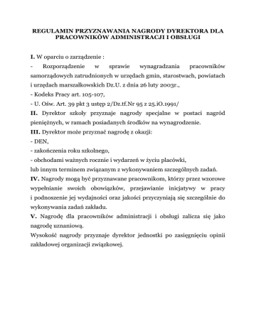REGULAMIN PRZYZNAWANIA NAGRODY DYREKTORA DLA PRACOWNIKÓW ADMINISTRACJI I OBSŁUGI I. W oparciu o zarządzenie : - Rozporządzenie w sprawie wynagradzania pracowników samorządowych zatrudnionych w urzędach gmin, starostwach, powiatach i urzędach marszałkowskich Dz.U. z dnia 26 luty 2003r., - Kodeks Pracy art. 105-107, - U. Ośw. Art. 39 pkt 3 ustęp 2/Dz.tf.Nr 95 z 25.iO.1991/ II. Dyrektor szkoły przyznaje nagrody specjalne w postaci nagród pieniężnych, w ramach posiadanych środków na wynagrodzenie. III. Dyrektor może przyznać nagrodę z okazji: - DEN, - zakończenia roku szkolnego, - obchodami ważnych rocznie i wydarzeń w życiu placówki, lub innym terminem związanym z wykonywaniem szczególnych zadań. IV. Nagrody mogą być przyznawane pracownikom, którzy przez wzorowe wypełnianie swoich obowiązków, przejawianie inicjatywy w pracy i podnoszenie jej wydajności oraz jakości przyczyniają się szczególnie do wykonywania zadań zakładu. V. Nagrodę dla pracowników administracji i obsługi zalicza się jako nagrodę uznaniową. Wysokość nagrody przyznaje dyrektor jednostki po zasięgnięciu opinii zakładowej organizacji związkowej.
