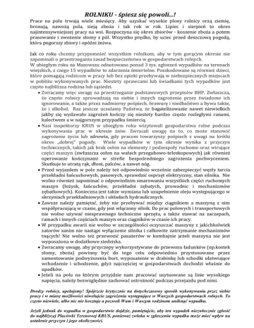 ROLNIKU - śpiesz się powoli...! Prace na polu trwają wiele miesięcy. Aby uzyskać wysokie plony rolnicy orzą ziemię, bronują, nawożą pola, sieją zboża i tak rok w rok. Lipiec i sierpień to okres najintensywniejszej pracy na wsi. Rozpoczyna się okres zbiorów - koszenie zboża a potem prasowanie i zwożenie słomy z pól. Wszystko prędko, by uciec przed deszczową pogodą, która pogorszy zbiory i opóźni żniwa. Jak co roku chcemy przypomnieć wszystkim rolnikom, aby w tym gorącym okresie nie zapominali o przestrzeganiu zasad bezpieczeństwa w gospodarstwach rolnych. W ubiegłym roku na Mazowszu odnotowano ponad 3 tys. zgłoszeń wypadków na terenach wiejskich, z czego 15 wypadków to zdarzenia śmiertelne. Poszkodowane są również dzieci, które pomagają rodzicom w pracy lub bez opieki przebywają w niebezpiecznych miejscach w pobliżu wykonywanych prac. Niestety sprawcami lub świadkami tych wypadków jest często najbliższa rodzina lub sąsiedzi. Zwracamy więc uwagę na przestrzeganie podstawowych przepisów BHP. Zwłaszcza, że często rolnicy sprowadzają na siebie i innych zagrożenie przez świadome ich ignorowanie, a także przez nadmierny pośpiech, brawurę i niedbalstwo a bywa także, że i alkohol. Raz jeszcze uczulamy Państwa, że bagatelizowanie nawet niewielkich jakby się wydawało zagrożeń kończy się niestety bardzo często rozległymi ranami, kalectwem a w najgorszym przypadku śmiercią. Nasi inspektorzy KRUS w ubiegłym roku wizytowali gospodarstwa rolne podczas wykonywania prac w okresie żniw. Zwracali uwagę na to, co może stanowić zagrożenie życia lub zdrowia, gdy pracom towarzyszy pośpiech z uwagi na krótki okres ,,dobrej" pogody. Wiele wypadków w tym okresie wynika z przyczyn technicznych, takich jak brak osłon na elementy i podzespoły ruchome oraz wirujące części maszyn (zwłaszcza osłon na wałach przegubowo-teleskopowych) jak również operowanie kończynami w strefie bezpośredniego zagrożenia pochwyceniem. Skutkuje to utratą rąk, dłoni, palców, a nawet nóg. Przed wyjazdem w pole należy też odpowiednio wcześnie zabezpieczyć węzły tarcia przekładni łańcuchowych, pasowych, sprawdzić osprzęt elektryczny, stan silnika. Nie wolno również zapominać o odpowiednim smarowaniu wszystkich części ruchomych maszyn (łożysk, łańcuchów, przekładni zębatych, prowadnic i mechanizmów zębatkowych). Konieczna jest także wymiana lub uzupełnienie oleju występującego w skrzyniach przekładniowych i układach hydraulicznych. Zawsze należy pamiętać, żeby nie przebywać między ciągnikiem a maszyną z nim współpracującą w czasie, gdy jest włączony silnik. Do prac polowych i transportowych nie wolno używać niesprawnego techniczne sprzętu, a także stawać na zaczepach, ramach i innych częściach maszyn oraz ciągników w czasie ich pracy. W przypadku awarii nie wolno w szczególności oczyszczać maszyny z jakichkolwiek zatorów zanim nie nastąpi wyłączenie silnika i całkowite zatrzymanie mechanizmów tnących! Nie wolno też przewozić pasażerów w kombajnie jeżeli maszyna nie jest wyposażona w dodatkowe siedziska. Zwracamy uwagę, aby przyczepy wykorzystywane do przewozu ładunków (np.kostek słomy, zboża) powinny być do tego celu odpowiednio przystosowane przez zamontowanie podwyższenia burt, wyposażenie w drabinkę lub schodki ułatwiające wchodzenie i schodzenie, gdyż najczęściej w gospodarstwach dochodzi właśnie do upadków. Jeżeli na polu na którym przyjdzie nam pracować usytuowane są linie wysokiego napięcia, należy bezwzględnie zachować ostrożność podczas przejazdu pod nimi. Drodzy rolnicy, apelujemy! Spójrzcie krytycznie na dotychczasowy sposób wykonywania przez siebie pracy i w miarę możliwości niwelujcie zagrożenia występujące w Waszych gospodarstwach rolnych. To często niewiele, albo nic nie kosztuje a pozwoli Wam i Waszym rodzinom uniknąć wypadku. Jeżeli jednak do wypadku w gospodarstwie dojdzie, pamiętajcie, aby ten wypadek niezwłocznie zgłosić do najbliższej Placówki Terenowej KRUS, ponieważ zwłoka w zgłoszeniu wypadku może mieć wpływ na ustalenie przyczyn i jego okoliczności.