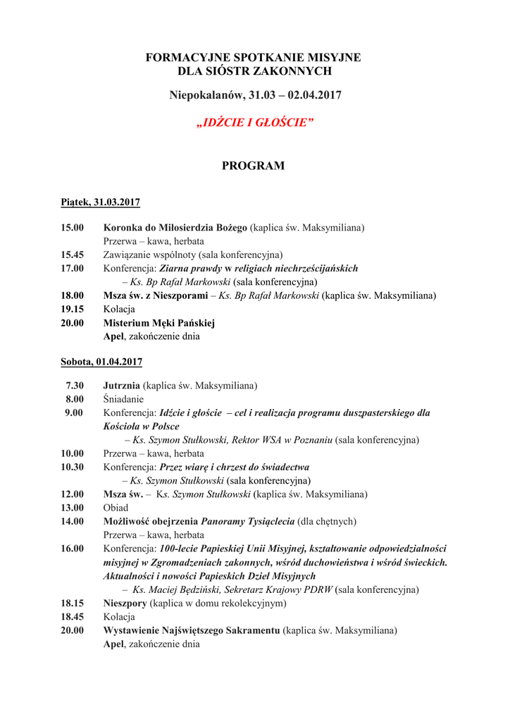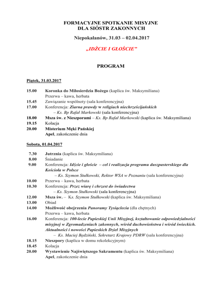 FORMACYJNE SPOTKANIE MISYJNE DLA SIÓSTR ZAKONNYCH Niepokalanów, 31.03 – 02.04.2017 „IDŹCIE I GŁOŚCIE” PROGRAM Piątek, 31.03.2017 15.00 15.45 17.00 18.00 19.15 20.00 Koronka do Miłosierdzia Bożego (kaplica św. Maksymiliana) Przerwa – kawa, herbata Zawiązanie wspólnoty (sala konferencyjna) Konferencja: Ziarna prawdy w religiach niechrześcijańskich – Ks. Bp Rafał Markowski (sala konferencyjna) Msza św. z Nieszporami – Ks. Bp Rafał Markowski (kaplica św. Maksymiliana) Kolacja Misterium Męki Pańskiej Apel, zakończenie dnia Sobota, 01.04.2017 7.30 8.00 9.00 10.00 10.30 12.00 13.00 14.00 16.00 18.15 18.45 20.00 Jutrznia (kaplica św. Maksymiliana) Śniadanie Konferencja: Idźcie i głoście – cel i realizacja programu duszpasterskiego dla Kościoła w Polsce – Ks. Szymon Stułkowski, Rektor WSA w Poznaniu (sala konferencyjna) Przerwa – kawa, herbata Konferencja: Przez wiarę i chrzest do świadectwa – Ks. Szymon Stułkowski (sala konferencyjna) Msza św. – Ks. Szymon Stułkowski (kaplica św. Maksymiliana) Obiad Możliwość obejrzenia Panoramy Tysiąclecia (dla chętnych) Przerwa – kawa, herbata Konferencja: 100-lecie Papieskiej Unii Misyjnej, kształtowanie odpowiedzialności misyjnej w Zgromadzeniach zakonnych, wśród duchowieństwa i wśród świeckich. Aktualności i nowości Papieskich Dzieł Misyjnych – Ks. Maciej Będziński, Sekretarz Krajowy PDRW (sala konferencyjna) Nieszpory (kaplica w domu rekolekcyjnym) Kolacja Wystawienie Najświętszego Sakramentu (kaplica św. Maksymiliana) Apel, zakończenie dnia 2 Niedziela, 02.04.2016 7.15 8.30 9.15 11.45 12.15 Msza św. z Jutrznią Śniadanie Konferencja: Aktualne zagrożenia i przeszkody w dziele ewangelizacji – Ks. Waldemar Cisło, Dyrektor Sekcji Polskiej Pomoc Kościołowi w Potrzebie (sala konferencyjna) Świadectwo misjonarki Anioł Pański, rozesłanie Obiad
