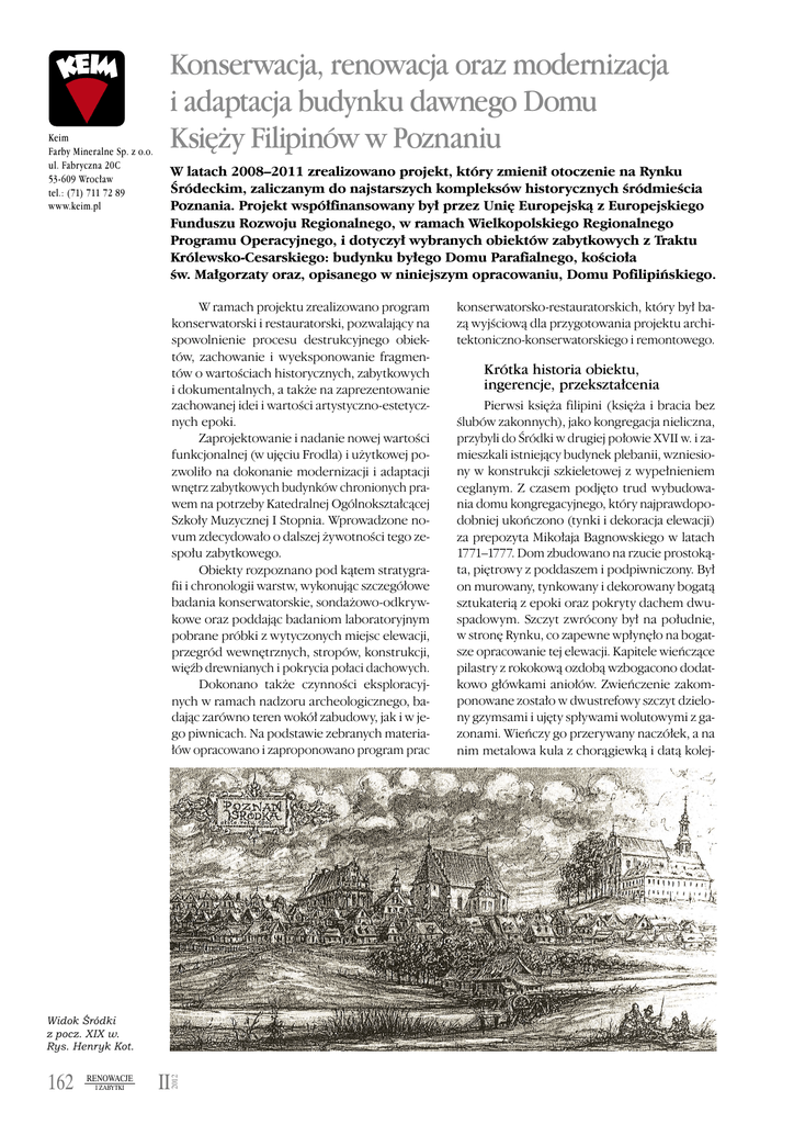 Keim Farby Mineralne Sp. z o.o. ul. Fabryczna 20C 53-609 Wrocław tel.: (71) 711 72 89 www.keim.pl Konserwacja, renowacja oraz modernizacja i adaptacja budynku dawnego Domu Księży Filipinów w Poznaniu W latach 2008–2011 zrealizowano projekt, który zmienił otoczenie na Rynku Śródeckim, zaliczanym do najstarszych kompleksów historycznych śródmieścia Poznania. Projekt współfinansowany był przez Unię Europejską z Europejskiego Funduszu Rozwoju Regionalnego, w ramach Wielkopolskiego Regionalnego Programu Operacyjnego, i dotyczył wybranych obiektów zabytkowych z Traktu Królewsko-Cesarskiego: budynku byłego Domu Parafialnego, kościoła św. Małgorzaty oraz, opisanego w niniejszym opracowaniu, Domu Pofilipińskiego. W ramach projektu zrealizowano program konserwatorski i restauratorski, pozwalający na spowolnienie procesu destrukcyjnego obiektów, zachowanie i wyeksponowanie fragmentów o wartościach historycznych, zabytkowych i dokumentalnych, a także na zaprezentowanie zachowanej idei i wartości artystyczno-estetycznych epoki. Zaprojektowanie i nadanie nowej wartości funkcjonalnej (w ujęciu Frodla) i użytkowej pozwoliło na dokonanie modernizacji i adaptacji wnętrz zabytkowych budynków chronionych prawem na potrzeby Katedralnej Ogólnokształcącej Szkoły Muzycznej I Stopnia. Wprowadzone novum zdecydowało o dalszej żywotności tego zespołu zabytkowego. Obiekty rozpoznano pod kątem stratygrafii i chronologii warstw, wykonując szczegółowe badania konserwatorskie, sondażowo-odkrywkowe oraz poddając badaniom laboratoryjnym pobrane próbki z wytyczonych miejsc elewacji, przegród wewnętrznych, stropów, konstrukcji, więźb drewnianych i pokrycia połaci dachowych. Dokonano także czynności eksploracyjnych w ramach nadzoru archeologicznego, badając zarówno teren wokół zabudowy, jak i w jego piwnicach. Na podstawie zebranych materiałów opracowano i zaproponowano program prac Widok Śródki z pocz. XIX w. Rys. Henryk Kot. RENOWACJE I ZABYTKI II 2012 162 konserwatorsko-restauratorskich, który był bazą wyjściową dla przygotowania projektu architektoniczno-konserwatorskiego i remontowego. Krótka historia obiektu, ingerencje, przekształcenia Pierwsi księża filipini (księża i bracia bez ślubów zakonnych), jako kongregacja nieliczna, przybyli do Śródki w drugiej połowie XVII w. i zamieszkali istniejący budynek plebanii, wzniesiony w konstrukcji szkieletowej z wypełnieniem ceglanym. Z czasem podjęto trud wybudowania domu kongregacyjnego, który najprawdopodobniej ukończono (tynki i dekoracja elewacji) za prepozyta Mikołaja Bagnowskiego w latach 1771–1777. Dom zbudowano na rzucie prostokąta, piętrowy z poddaszem i podpiwniczony. Był on murowany, tynkowany i dekorowany bogatą sztukaterią z epoki oraz pokryty dachem dwuspadowym. Szczyt zwrócony był na południe, w stronę Rynku, co zapewne wpłynęło na bogatsze opracowanie tej elewacji. Kapitele wieńczące pilastry z rokokową ozdobą wzbogacono dodatkowo główkami aniołów. Zwieńczenie zakomponowane zostało w dwustrefowy szczyt dzielony gzymsami i ujęty spływami wolutowymi z gazonami. Wieńczy go przerywany naczółek, a na nim metalowa kula z chorągiewką i datą kolej- opaskami wykonanymi z narzutu. Badania architektoniczne (etap II, z 2010 roku) ujawniły istniejące początkowo kolejne dwa otwory okienne – dodatkowo w przestrzeni symbolicznego prezbiterium i w świetle szerokości chóru muzycznego. Kaplica powstała na rzucie prostokąta nakrytego czteroprzęsłowym pseudosklepieniem na gurtach. Przy ścianie wschodniej zakomponowano chór muzyczny z wejściem z klatki schodowej. W II połowie XX wieku, do czasu podjęcia realizacji ostatnich ingerencji konserwatorskich, w dawnym domu śródeckiej Kongregacji Oratorium Świętego Filipa Neri, w kondygnacji parteru (poza kaplicą) funkcjonowały stomatologiczne przychodnie lekarskie, a na piętrze zaś nadal mieszkania przyszłych księży filipinów. Opisane w dużym skrócie założenie architektoniczne pozostaje świadectwem historycznej świetności Śródki. Współczesne badania konserwatorskie Szczegółowe rozpoznanie materiału podlegającego ochronie konserwatorskiej, jego zachowanej oryginalnej substancji, rozpoczęto od poznania stanu zachowania in situ, rozpoznania stratygrafii i chronologii warstw oraz ustalenia przyczyn trwającego i postępującego od dłuższego czasu procesu niszczącego materię zabytkową. Po zawierusze wojennej obiekty zostały przejęte przez państwo. Od tego czasu zauważa się kolejne przyspieszenie procesu degradacji materii zabytkowej, między innymi w licznych przebudowach i adaptacjach wnętrz na różne funkcje współczesne, bez uwzględnienia wartości historycznych i artystycznych. Dodatkowo zmieniający się dzierżawcy czy zarządcy kompletnie zaniechali działań profilaktycznych, zabezpieczających materię obiektów zabytkowych. Należało ustalić i rozpoznać zachowanie najstarszych warstw historycznych, zarówno zewnętrznych, jak i wewnętrznych: ścian, przegród, sufitów i sklepień – w poszczególnych pomieszczeniach parteru, piętra, holu głównego, w piwnicach i na poddaszu oraz niezależnie w kaplicy. Ważne też było poznanie stanu zachowania więźby i pokrycia dachu, systemu odprowadzania wód opadowych, stanu zachowania terenu wokół obiektu i jego poziomu zerowego, bezpośrednio otaczającego budynek. Działania te pozwoliły na opracowanie zebranego materiału i na tej podstawie przedstawienie propozycji wniosków i zaleceń konserwatorskich oraz ramowego programu prac konserwatorsko-restauratorskich, które stały się materiałem wyjściowym dla przygotowywanego projektu architektoniczno-konserwatorskiego, z uwzględnieniem zmiany funkcji pierwotnej domu kongregacji filipińskiej. II 2012 nej ingerencji. Gęsto zakomponowane pilastry z bogato zdobionymi kapitelami powtarzają się na poszczególnych elewacjach. Układ pomieszczeń miesz