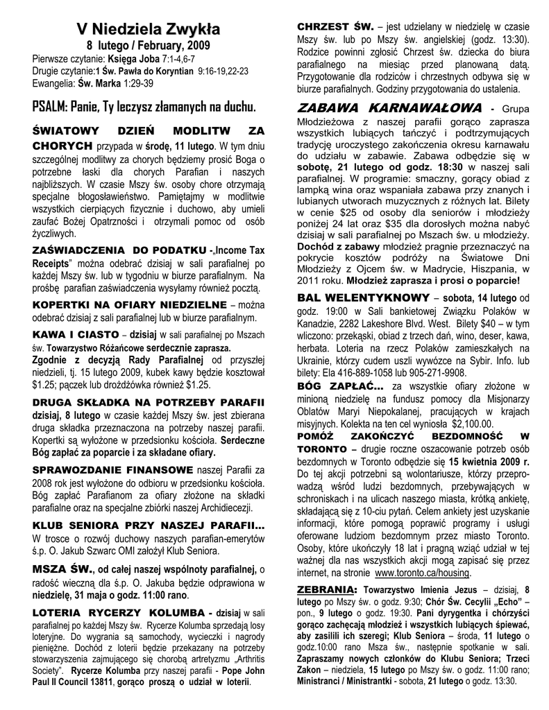 V Niedziela Zwykła 8 lutego / February, 2009 Pierwsze czytanie: Księga Joba 7:1-4,6-7 Drugie czytanie:1 Św. Pawła do Koryntian 9:16-19,22-23 Ewangelia: Św. Marka 1:29-39 PSALM: Panie, Ty leczysz złamanych na duchu. ŚWIATOWY DZIEŃ MODLITW ZA CHORYCH przypada w środę, 11 lutego. W tym dniu szczególnej modlitwy za chorych będziemy prosić Boga o potrzebne łaski dla chorych Parafian i naszych najbliższych. W czasie Mszy św. osoby chore otrzymają specjalne błogosławieństwo. Pamiętajmy w modlitwie wszystkich cierpiących fizycznie i duchowo, aby umieli zaufać Bożej Opatrzności i otrzymali pomoc od osób życzliwych. ZAŚWIADCZENIA DO PODATKU -„Income Tax Receipts” można odebrać dzisiaj w sali parafialnej po każdej Mszy św. lub w tygodniu w biurze parafialnym. Na prośbę parafian zaświadczenia wysyłamy również pocztą. KOPERTKI NA OFIARY NIEDZIELNE – można odebrać dzisiaj z sali parafialnej lub w biurze parafialnym. KAWA I CIASTO – dzisiaj w sali parafialnej po Mszach św. Towarzystwo Różańcowe serdecznie zaprasza. Zgodnie z decyzją Rady Parafialnej od przyszłej niedzieli, tj. 15 lutego 2009, kubek kawy będzie kosztował $1.25; pączek lub drożdżówka również $1.25. DRUGA SKŁADKA NA POTRZEBY PARAFII dzisiaj, 8 lutego w czasie każdej Mszy św. jest zbierana druga składka przeznaczona na potrzeby naszej parafii. Kopertki są wyłożone w przedsionku kościoła. Serdeczne Bóg zapłać za poparcie i za składane ofiary. SPRAWOZDANIE FINANSOWE naszej Parafii za 2008 rok jest wyłożone do odbioru w przedsionku kościoła. Bóg zapłać Parafianom za ofiary złożone na składki parafialne oraz na specjalne zbiórki naszej Archidiecezji. KLUB SENIORA PRZY NASZEJ PARAFII... W trosce o rozwój duchowy naszych parafian-emerytów ś.p. O. Jakub Szwarc OMI założył Klub Seniora. MSZA ŚW., od całej naszej wspólnoty parafialnej, o radość wieczną dla ś.p. O. Jakuba będzie odprawiona w niedzielę, 31 maja o godz. 11:00 rano. LOTERIA RYCERZY KOLUMBA - dzisiaj w sali parafialnej po każdej Mszy św. Rycerze Kolumba sprzedają losy loteryjne. Do wygrania są samochody, wycieczki i nagrody pieniężne. Dochód z loterii będzie przekazany na potrzeby stowarzyszenia zajmującego się chorobą artretyzmu „Arthritis Society”. Rycerze Kolumba przy naszej parafii - Pope John Paul II Council 13811, gorąco proszą o udział w loterii. CHRZEST ŚW. – jest udzielany w niedzielę w czasie Mszy św. lub po Mszy św. angielskiej (godz. 13:30). Rodzice powinni zgłosić Chrzest św. dziecka do biura parafialnego na miesiąc przed planowaną datą. Przygotowanie dla rodziców i chrzestnych odbywa się w biurze parafialnych. Godziny przygotowania do ustalenia. ZABAWA KARNAWAŁOWA - Grupa Młodzieżowa z naszej parafii gorąco zaprasza wszystkich lubiących tańczyć i podtrzymujących tradycję uroczystego zakończenia okresu karnawału do udziału w zabawie. Zabawa odbędzie się w sobotę, 21 lutego od godz. 18:30 w naszej sali parafialnej. W programie: smaczny, gorący obiad z lampką wina oraz wspaniała zabawa przy znanych i lubianych utworach muzycznych z różnych lat. Bilety w cenie $25 od osoby dla seniorów i młodzieży poniżej 24 lat oraz $35 dla dorosłych można nabyć dzisiaj w sali parafialnej po Mszach św. u młodzieży. Dochód z zabawy młodzież pragnie przeznaczyć na pokrycie kosztów podróży na Światowe Dni Młodzieży z Ojcem św. w Madrycie, Hiszpania, w 2011 roku. Młodzież zaprasza i prosi o poparcie! BAL WELENTYKNOWY – sobota, 14 lutego od godz. 19:00 w Sali bankietowej Związku Polaków w Kanadzie, 2282 Lakeshore Blvd. West. Bilety $40 – w tym wliczono: przekąski, obiad z trzech dań, wino, deser, kawa, herbata. Loteria na rzecz Polaków zamieszkałych na Ukrainie, którzy cudem uszli wywózce na Sybir. Info. lub bilety: Ela 416-889-1058 lub 905-271-9908. BÓG ZAPŁAĆ... za wszystkie ofiary złożone w minioną niedzielę na fundusz pomocy dla Misjonarzy Oblatów Maryi Niepokalanej, pracujących w krajach misyjnych. Kolekta na ten cel wyniosła $2,100.00. POMÓŻ ZAKOŃCZYĆ BEZDOMNOŚĆ W TORONTO – drugie roczne oszacowanie potrzeb osób bezdomnych w Toronto odbędzie się 15 kwietnia 2009 r. Do tej akcji potrzebni są wolontariusze, którzy przeprowadzą wśród ludzi bezdomnych, przebywających w schroniskach i na ulicach naszego miasta, krótką ankietę, składającą się z 10-ciu pytań. Celem ankiety jest uzyskanie informacji, które pomogą poprawić programy i usługi oferowane ludziom bezdomnym przez miasto Toronto. Osoby, które ukończyły 18 lat i pragną wziąć udział w tej ważnej dla nas wszystkich akcji mogą zapisać się przez internet, na stronie www.toronto.ca/housing. ZEBRANIA: Towarzystwo Imienia Jezus – dzisiaj, 8 lutego po Mszy św. o godz. 9:30; Chór Św. Cecylii „Echo” – pon., 9 lutego o godz. 19:30. Pani dyrygentka i chórzyści gorąco zachęcają młodzież i wszystkich lubiących śpiewać, aby zasilili ich szeregi; Klub Seniora – środa, 11 lutego o godz.10:00 rano Msza św., następnie spotkanie w sali. Zapraszamy nowych członków do Klubu Seniora; Trzeci Zakon – niedziela, 15 lutego po Mszy św. o godz. 11:00 rano; Ministranci / Ministrantki - sobota, 21 lutego o godz. 13:30. INTENCJE MSZALNE & MASS INTENTIONS PIERWSZA SOBOTA / FIRST SATURDAY–7 luty / Feb.: 5:00 PM - Nowenna do M. B. Nieustającej Pomocy 5:30 PM – 1) Za + Franciszka Błazik – Dzieci z rodzinami 2) Za Ojca Świętego Benedykta XVI, za Ojczyznę i Radio Maryja – Rodzina Radia Maryja TH 5 NIEDZIELA ZWYKŁA / 5 SUNDAY IN ORDINARY TIME – 8 lutego / February: 9:30 AM – Za + Stefana Kuszek – Żona z rodziną 11:00 AM - Za Parafian 12:30PM - For ++ Antonina Jegielski and deceased from Jelonek family – Diane Zeppieri with family PONIEDZIAŁEK / MONDAY – 9 lutego / February: I 8:00 AM – Za ++ męża Józefa Janik i jego rodziców Szczepana i Wiktorię – Bronisława Janik WTOREK / TUESD