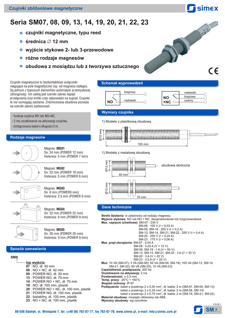 Czujniki zbliżeniowe magnetyczne Seria SM07, 08, 09, 13, 14, 19, 20, 21, 22, 23 czujniki magnetyczne, typu reed średnica Ć 12 mm wyjście stykowe 2- lub 3-przewodowe różne rodzaje magnesów obudowa z mosiądzu lub z tworzywa sztucznego Czujniki magnetyczne to bezkontaktowe wyłączniki reagujące na pole magnetyczne (np. od magnesu stałego). Są jednym z typowych elementów automatyki przemysłowej (dźwigowej). Ich zaletą jest szeroki zakres napięć przełączania oraz krótki czas odpowiedzi na sygnał. Czujniki te nie wymagają zasilania. Zróżnicowana obudowa pozwala na szeroki zakres zastosowań. Schemat wyprowadzeń brązowy NO NO +NC niebieski niebieski brązowy czarny Wymiary czujnika - funkcja wyjścia NO lub NO+NC, - 2 ms oczekiwania na aktywację czujnika, 1) Modele z plastikową obudową Rodzaje magnesów Ø12 mm - zintegrowany kabel o długości 2 m. 100 mm Magnes: MG03 Sn: 6 mm (POWER0 mm) histereza: 2,5 mm (POWER 0 mm) Magnes: MG04 Sn: 22 mm (POWER 22 mm) histereza: 9 mm (POWER 9 mm) Magnes: MG05 Sn: 20 mm (POWER 20 mm) histereza: 9 mm (POWER 9 mm) Sposób zamawiania SMX typ wyjścia: 07 : NO, dł. 40 mm 08 : NO + NC, dł. 42 mm 09 : POWER NO, dł. 30 mm 13 : POWER NO, dł. 70 mm 14 : POWER NO + NC, dł. 70 mm 19 : NO, dł. 100 mm, plastik 20 : POWER NO + NC, dł. 100 mm, plastik 21 : POWER NO, dł. 100 mm, plastik 22 : bistabilny, dł. 100 mm, plastik 23 : NO + NC, dł. 100 mm, plastik Ø12 mm Magnes: MG02 Sn: 22 mm (POWER 10 mm) histereza: 5 mm (POWER 6 mm) 1) Modele z metalową obudową obudowa skrócona 40 mm Ø12 mm Magnes: MG01 Sn: 24 mm (POWER 12 mm) histereza: 5 mm (POWER 7 mm) 70 mm Dane techniczne Strefa działania: w zależności od rodzaju magnesu Wyjście stykowe: NO lub NO + NC, dwuprzewodowe lub trzyprzewodowe Max. napięcie (chwilowe): SM-07 : 230 V SM-08 : 100 V (I = 0,03 A) SM-09, SM-19 : 250 V (I = 0,2 A) SM-13, SM-14, SM-21, SM-22 : 250 V (I = 0,4 A) SM-20 : 250 V (I = 0,24 A) SM-23 : 175 V (I = 0,06 A) Max. prąd obciążenia: SM-07 : 0,04 A SM-08 : 0,25 A (V = 12 V) SM-09, SM-19 : 1 A (V = 50 V) SM-13, SM-14, SM-21, SM-22 : 3 A (V = 33 V) SM-20 : 3 A (V = 20 V) SM-23 : 0,5 A (V = 20 V) Moc: 10 VA (SM-07); 3 VA (SM-08); 50 VA (SM-09, SM-19); 100 VA (SM-13, SM-14, SM-21, SM-22); 60 VA (SM-20); 10 VA (SM-23) Częstotliwość przełączania: 200 Hz Oczekiwanie na aktywację: 2 ms Powtarzalność: ± 0,3 mm Temp. pracy: -20°C ÷ +60°C Stopień ochrony: IP 67 Podłączenie: kabel o przekroju 2 x 0,50 mm2, dł. kabla: 2 m (SM-07, SM-09, SM-13) kabel o przekroju 3 x 0,35 mm2, dł. kabla: 2 m (SM-08, SM-14) kabel o przekroju 2 x 0,75 mm2, dł. kabla: 2 m (SM-19, SM-21, SM-22) Materiał obudowy: mosiądz niklowany lub ABS Wymiary obudowy: wg rysunków V.9.08.1 80-556 Gdańsk, ul. Wielopole 7, tel. (+48 58) 762-07-77, fax 762-07-70, www.simex.pl, e-mail: [email protected] SM.7.