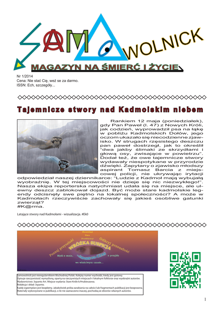 Nr 1/2014 Cena: Nie stać Cię, weź se za darmo. ISSN: Ech, szczegóły... Tajemnicze stwory nad Kadmolskim niebem Rankiem 12 maja (poniedziałek), gdy Pan Paweł (l. 47) z Nowych Króli, jak codzień, wyprowadził psa na łąkę w pobliżu Kadmolskich Dołów, jego oczom ukazało się niecodzienne zjawisko. W strugach rzęsistego deszczu pan paweł dostrzegł, jak to określił “dwa jakby ślimaki ze skrzydłami i głową osy, zwisające w powietrzu”. Dodał też, że owe tajemnicze stwory wydawały niespotykane w przyrodzie dźwięki. Zapytany o zjawisko młodszy aspirant Tomasz Barcia z miejscowej policji, nie ukrywając irytacji odpowiedział naszej dziennikarce: “Ludzie z Kadmoł mają wybujałą wyobraźnię. W tej miejscowości nie dzieje się nic niezwykłego!”. Nasza ekipa reporterska natychmiast udała się na miejsce, ale ulewny deszcz zablokował dojazd. Być może stare kadmolskie legendy odcisnęły swe piętno na lokalnej społeczności? A może w Kadmołach rzeczywiście zachowały się jakieś osobliwe gatunki zwierząt? #K@rma. Latające stwory nad Kadmołami - wizualizacja. #Ek0 Reklama Samowolnick jest nieregularnikiem Wschodniej Polski. Kolejny numer wychodzi, kiedy jest gotowy. Opisuje rzeczywistość wymyśloną, opartą na rzeczywistych miejscach i lokalnym folklorze oraz wyobraźni autorów. Wydawnictwo: 3spanto Art. Miejsce wydania: Stare Króle k/Hrubieszowa. Redakcja i skład: 3spanto. Każdy egzemplarz jest bezpłatny. Jakakolwiek próba zarabiania na całości lub fragmentach publikacji jest bezprawna. Materiały wykorzystane w publikacji, o ile nie zaznaczono inaczej, pochodzą ze zbiorów własnych autorów. Witam! Z szaleńczą radością rozpoczynam dzisiejszy felieton formą, która współczesnych specjalistów od savoir vivre’u przyprawia o mdłości, bóle głowy i liczne inne dolegliwości. Otóż niedawno w Pierwszym Programie Polskiego Radia pewien jegomość wypowiadał się na temat rozpoczynania listów elektronicznych, czyli popularnych e-maili. Otóż ów znawca zaznaczał, jak nieelegancką i niekulturalną formą rozpoczęcia wypowiedzi pisanej jest właśnie słowo “witam”. Sugerował ów zacny człowiek, by elektroniczne listy, podobnie jak ich papierowych przodków, zaczynać nieco już przestarzałą i niewiele ze sobą niosącą formą “Szanowny Panie/Szanowna Pani”. Zważywszy na powszechną w dzisiejszych czasach ideologię “hejterstwa”, zwracanie się do kogoś per “Szanowny” uważam za formę zakłamania i hipokryzji. Bo czy ktoś szanuje drugiego człowieka, pisząc do niego suchy list, dokładnie według znalezionego w sieci wzoru? Forma “dzień dobry” również nie jest na miejscu, gdyż nigdy nie wiadomo, o jakiej porze odbiorca odczyta nasz elektroniczny list. E-mail z założenia miał przyspieszyć komunikację, stąd wszelkie skróty, “tagi” i uproszczenia są w nim jak najbardziej dopuszczalne. Jeśli ktoś czuje się urażony, zawsze może taki list uznać za spam. Kończąc dzisiejszy felieton, zachęcam do większego zwracania uwagi na przekaz treści w naszych mailach, aniżeli na formę. W nowych czasach, bowiem, nawet w piśmie fitness ma swoje miejsce. #ZO Reklama doktor T. Orrent zaprasza! �-Su 4R W dzisiejszej odsłonie prezentuję, Drodzy Młodzi Wynalazcy, koncept najnowszego dzieła mego Instytutu: �-Su 4R. Pi Su AR, bo tak należy wymawiać jego nazwę, jest olewolotem. Stanowi on więc idealny wybór dla tych, którzy za nic mają granice i przeszkody. Po prostu wsiadasz i... podróżujesz. Szosa, pole, pustynia, woda, głębiny oceanów, podziemne tunele, czy też bezgraniczne przestworza - wszędzie tam �-Su 4R - grafika koncepcyjna #T.O. dostrze �-Su 4R. Paliwo pobiera z wilgoci, a specjalny kombinezon pozwala na pobieranie płynów ustrojowych z pilota i pasażerów. Może on pomieścić 6 osób wraz z bagażami. W planach są też wersje typu “camper”. Premiera wkrótce, zapraszam do korzystania i życzę bezgranicznej wolności! OGŁOSZENIE SPOŁECZNE Nasza fundacja od lat zajmuje się pomocą tym najmniejszym spośród nas, o których nikt inny się nie troszczy. Spójrz oczyma muchy, zobacz więcej! Mucha to stworzenie ze wszech miar pożyteczne: jej bzyczenie uspokaja, jej lot odpręża i ćwiczy oczy, a jej ogromny apetyt pozwala zapomnieć o sprzątaniu śmieci. Nim znów podniesiesz rękę na to niewinne stworzenie, pomyśl, jak wiele jej zawdzięczasz! Pomyśl też o zniszczeniach, jakich możesz dokonać, próbując skrzywdzić naszych skrzydlatych przyjaciół, nie mówiąc już o stłuczonych i połamanych palcach i dłoniach... Chroniąc Muchę chronisz siebie!!! Przekaż 1% swojego podatku Fundacji Belzebuba! Nasz patron liczy na Twoją hojność! OGŁOSZENIE SPOŁECZNE Dziś wywiad z zespołem Hell’a Bard. (KG) Witamy w Samowolnicku! Miło, że wpadliście. (HaB) Padało akurat, a tu otwarte... (KG) Z pewnością wszystkich interesuje Wasza nowa płyta. Opowiedzcie o niej. (Hab) Cóż, Fan Fare Away, to tytuł przewrotny. Odnosi się zarówno do angielskiego Far far away (bardzo daleko - przyp. red.), jak i do słowa Fanfary, które doskonale określa naszą muzykę. Ale przede wszystkim podkreśla nasz dystans do fanów - Fan far away znaczy “Fan daleko stąd”. (KG) Gracie słowiański pseudo-gotyk,,, (HaB) Raczej słowiańśki metal ceremonialny. Najlepiej to słychać na przykładzie najnowszego singla: “Suchoj, Ziemio...”, lecz także w innych utworach. (KG) W jednej z Waszych nowych piosenek pojawia się wzmianka o Wiedźmie ze Stróży. Co było inspiracją? (Hab) Cóż, piosenka “Strzygo, Strzygo a nie golo” powstała, gdy Maciejo był u fryzjera. Usłyszał tam, jak stare babki wspominały o wiedźmie ze Stróży, która porywała dzieci. Reszta to już osobiste doświadczenia Macieja u cyrulika. (KG) Wierzycie w czary? (HaB) Oczywiście! Szczególnie czarę goryczy (śmiech). Ale czarka dobrego wina też dobra... (KG) Was