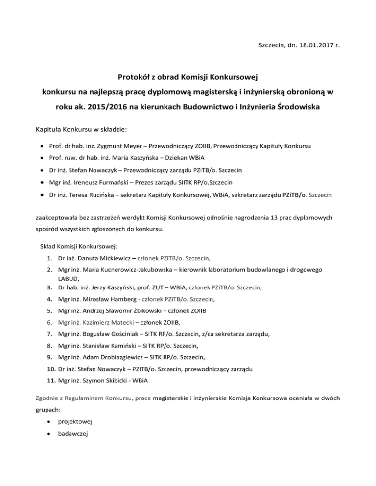 Szczecin, dn. 18.01.2017 r. Protokół z obrad Komisji Konkursowej konkursu na najlepszą pracę dyplomową magisterską i inżynierską obronioną w roku ak. 2015/2016 na kierunkach Budownictwo i Inżynieria Środowiska Kapituła Konkursu w składzie: Prof. dr hab. inż. Zygmunt Meyer – Przewodniczący ZOIIB, Przewodniczący Kapituły Konkursu Prof. nzw. dr hab. inż. Maria Kaszyńska – Dziekan WBiA Dr inż. Stefan Nowaczyk – Przewodniczący zarządu PZITB/o. Szczecin Mgr inż. Ireneusz Furmański – Prezes zarządu SIITK RP/o.Szczecin Dr inż. Teresa Rucińska – sekretarz Kapituły Konkursowej, WBiA, sekretarz zarządu PZiTB/o. Szczecin zaakceptowała bez zastrzeżeń werdykt Komisji Konkursowej odnośnie nagrodzenia 13 prac dyplomowych spośród wszystkich zgłoszonych do konkursu. Skład Komisji Konkursowej: 1. Dr inż. Danuta Mickiewicz – członek PZiTB/o. Szczecin, 2. Mgr inż. Maria Kucnerowicz-Jakubowska – kierownik laboratorium budowlanego i drogowego LABUD, 3. Dr hab. inż. Jerzy Kaszyński, prof. ZUT – WBiA, członek PZiTB/o. Szczecin, 4. Mgr inż. Mirosław Hamberg - członek PZiTB/o. Szczecin, 5. Mgr inż. Andrzej Sławomir Żbikowski – członek ZOIIB 6. Mgr inż. Kazimierz Matecki – członek ZOIIB, 7. Mgr inż. Bogusław Gościniak – SITK RP/o. Szczecin, z/ca sekretarza zarządu, 8. Mgr inż. Stanisław Kamiński – SITK RP/o. Szczecin, 9. Mgr inż. Adam Drobiazgiewicz – SITK RP/o. Szczecin, 10. Dr inż. Stefan Nowaczyk – PZITB/o. Szczecin, przewodniczący zarządu 11. Mgr inż. Szymon Skibicki - WBiA Zgodnie z Regulaminem Konkursu, prace magisterskie i inżynierskie Komisja Konkursowa oceniała w dwóch grupach: projektowej badawczej Do konkursu zgłoszono: studia S2/N2 – 12 prac dyplomowych projektowych i badawczych studia S1/N1 – 11 prac dyplomowych projektowych i badawczych Po zapoznaniu się z pracami dyplomowymi oraz recenzjami promotorów i recenzentów, członkowie Komisji Konkursowej podjęli następującą decyzję odnośnie nagrodzenia prac: 1. Prace inżynierskie (S1) a) Grupa projektowa (bez specjalności DUL): I miejsce – praca pt.: Projekt koncepcyjny parku wodnego w Szczecinie Nagroda pieniężna 600zł oraz roczna prenumerata miesięcznika Przegląd Budowlany o wartości 126 zł. Dyplomant: Paweł Jaroszewicz Promotor: Dr inż. Piotr Popiel Wyróżnienie – praca pt.: Analiza stanu wytężenia stalowej konstrukcji łącznika międzybudynkowego Nagroda pieniężna 400zł oraz roczna prenumerata miesięcznika Przegląd Budowlany o wartości 126 zł. Dyplomantka: Natalia Och Promotor: Dr inż. Tomasz Wróblewski Wyróżnienie – praca pt.: Koncepcja posadowienia elementów przejścia podziemnego dla pieszych w Szczecinie Nagroda pieniężna 400zł oraz roczna prenumerata miesięcznika Przegląd Budowlany o wartości 126 zł. Dyplomant: Maciej Sulikowski Promotor: Dr inż. Andrzej Pozlewicz b) Grupa badawcza I miejsce – praca pt.: Ocena właściwości zapraw z udziałem mielonej stłuczki i nanokrzemionki Nagroda pieniężna 600zł oraz roczna prenumerata miesięcznika Przegląd Budowlany o wartości 126 zł. Dyplomantka: Katarzyna Skoczylas Promotor: dr inż. Teresa Rucińska Wyróżnienie – praca pt.: Porównanie podstawowych parametrów fizycznych gruntów organicznych Międzyodrza z oceną możliwości posadowienia obiektów budowlanych w tym rejonie Nagroda pieniężna 400zł oraz roczna prenumerata miesięcznika Przegląd Budowlany o wartości 126 zł. Dyplomantka: Michalina Błaszczyk Promotor: Dr inż. Roman Bednarek c) Prace specjalności DUL I miejsce – praca pt.: Projekt koncepcyjny przebudowy układu drogowego w Złocieńcu Nagroda pieniężna 600zł oraz roczna prenumerata miesięcznika Przegląd Budowlany o wartości 126 zł. Dyplomant: Mateusz Zdun Promotor: Prof. nadzw. dr hab. inż. Alicja Sołowczuk Wyróżnienie – praca pt.: Ocena podatności do zagęszczenia mieszanek mineralno-asfaltowych z asfaltem drogowym 35/50 i 35/50 typu WMA Nagroda pieniężna 400zł oraz roczna prenumerata miesięcznika Przegląd Budowlany o wartości 126 zł. Dyplomant: Przemysław Pietrzak Promotor: Dr hab. inż. Paweł Mieczkowski 2. Prace magisterskie (S2) a) Grupa projektowa (bez specjalności DUL): I miejsce – praca pt.: Audyt termomodernizacyjny kamienicy mieszkalnej zlokalizowanej w Szczecinie przy ul. Jagiellońskiej 80 – głęboka termomodernizacja Nagroda pieniężna 1000zł oraz roczna prenumerata miesięcznika Przegląd Budowlany o wartości 126 zł. Dyplomantka: Anna Katarzyna Gołębiewska Promotor: dr inż., mgr. arch. Karolina Kurtz-Orecka Wyróżnienie – praca pt.: Projekt konstrukcji łącznika stalowego pomiędzy dwoma budynkami Nagroda pieniężna 800zł oraz roczna prenumerata miesięcznika Przegląd Budowlany o wartości 126 zł. Dyplomantka: Aleksandra Grabowska Promotor: dr inż. Małgorzata Abramowicz Wyróżnienie - praca pt.: Optymalne kształtowanie osiowo ściskanych słupów stalowych o przekroju rurowym Nagroda pieniężna 800zł oraz roczna prenumerata miesięcznika Przegląd Budowlany o wartości 126 zł. Dyplomant: Mateusz Chilkiewicz Promotor: dr inż. Tomasz Czajkowski b) Grupa badawcza I miejsce – praca pt.: Ocena wybranych właściwości spoiwa recyklingowego Nagroda pieniężna 1000 zł oraz roczna prenumerata miesięcznika Przegląd Budowlany o wartości 126 zł. Dyplomant: Mariusz Uciński Promotor: dr inż. Agata Wygocka-Domagałło Wyróżnienie – praca pt.: Ocena możliwości wykorzystania zbrojenia kompozytowego w betonach architektonicznych Nagroda pieniężna 800zł oraz roczna prenumerata miesięcznika Przegląd Budowlany o wartości 126 zł. Dyplomant: Paweł Krawczyk Promotor: Prof. nadzw. dr hab. inż. Maria Kaszyńska Wyróżnienie – praca pt.: Ocena wpływu domieszek i dodatków na właściwości matrycy cementowej Nagroda pieniężna 800zł oraz roczna prenumerata miesięcznika Przegląd Budowlany o wartości 126 zł. Dyplomantka: Marzena Gul Promotor: dr in