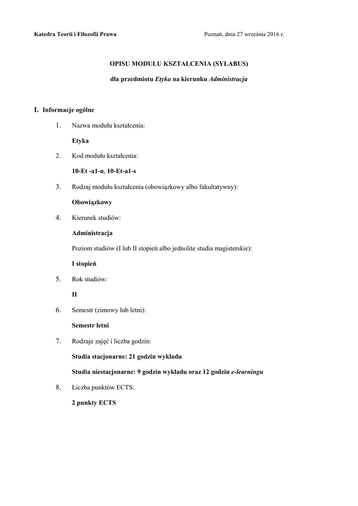 Katedra Teorii i Filozofii Prawa Poznań, dnia 27 września 2016 r. OPISU MODUŁU KSZTAŁCENIA (SYLABUS) dla przedmiotu Etyka na kierunku Administracja I. Informacje ogólne 1. Nazwa modułu kształcenia: Etyka 2. Kod modułu kształcenia: 10-Et -a1-n, 10-Et-a1-s 3. Rodzaj modułu kształcenia (obowiązkowy albo fakultatywny): Obowiązkowy 4. Kierunek studiów: Administracja Poziom studiów (I lub II stopień albo jednolite studia magisterskie): I stopień 5. Rok studiów: II 6. Semestr (zimowy lub letni): Semestr letni 7. Rodzaje zajęć i liczba godzin: Studia stacjonarne: 21 godzin wykładu Studia niestacjonarne: 9 godzin wykładu oraz 12 godzin e-learningu 8. Liczba punktów ECTS: 2 punkty ECTS 9. Imię i nazwisko, tytuł lub stopień naukowy, adres e-mail wykładowcy lub osoby prowadzącej zajęcia: Prof. dr hab. Marek Smolak ([email protected]) 10. Język wykładowy: Język polski II. Informacje szczegółowe 1. Cel modułu kształcenia: a) przekazanie wiedzy z zakresu podstawowych pojęć z zakresu etyki normatywnej, metaetyki, pojęć z zakresu moralności, wartości ocen i norm, b) przekazanie wiedzy co do swoistych dla urzędników argumentacji etycznej, c) przekazanie wiedzy co do etycznych konsekwencji moralizmu prawnego oraz wartości w rozumowaniach moralnych, d) wyrobienie umiejętności wykorzystywania podstawowych metod i sposobów myślenia moralnego w postępowaniu pracowników administracji publicznej. 2. Wymagania wstępne w zakresie wiedzy, umiejętności oraz kompetencji społecznych (jeśli obowiązują): Wymagania wstępne w zakresie wiedzy są następujące: a) podstawowa wiedza w zakresie stanowienia, obowiązywania, funkcjonowania, stosowania obowiązującego prawa polskiego, oraz w zakresie aksjologii prawa odpowiadająca treści kształcenia modułu Prawoznawstwo, b) brak szczególnych wymagań w zakresie umiejętności i kompetencji społecznych. 3. Efekty kształcenia w zakresie wiedzy, umiejętności oraz kompetencji społecznych dla modułu kształcenia i odniesienie do efektów kształcenia dla kierunku studiów: Nazwa modułu (przedmiotu) kształcenia: Etyka (Et) Symbol efektów kształcenia: Po zakończeniu modułu (przedmiotu) i potwierdzeniu osiągnięcia efektów kształcenia student potrafi: Odniesienie do efektów kształcenia dla kierunku studiów: Et_01 Zna i rozumie podstawowe pojęcia z zakresu etyki normatywnej, metaetyki, pojęcia z zakresu moralności, wartości ocen i norm. K_W01-03 K_U01-03, 07 Et_02 Ma wiedzę dotyczącą argumentacji etycznej oraz rozumowań etycznych. K_W01-03 K_U01-03, 07 Et_03 Ma pogłębioną wiedzę co do etycznych problemów stosowania prawa. K_W05-09 K_K01-03, 07, 10 Et_04 Potrafi posługując się etyczną aparaturą pojęciową opisać i analizować pojawiające się w administracji publicznej swoiste dylematy moralne. K_U01-03, 07 Potrafi trafnie ocenić regulacje prawne pod względem ich zgodności Et_05 ze standardami etycznymi wynikającymi z zasad moralności publicznej. 4. K_U01, 04, 09 K_K07 Treści kształcenia: Nazwa modułu (przedmiotu) kształcenia: Etyka (Et) Symbol treści kształcenia: Zagadnienia TK_01 Odniesienie do efektów kształcenia modułu: Opis treści kształcenia: ogólne etyki: etyka opisowa, normatywna i metaetyka. Et_01-03 TK_02 Pojęcia, moralności, wartości, ocen i norm. Omówienie idei Arystotelesa ujmowane jako ilustrację etyki cnót; I. Kanta jako przykładu etyki deontologicznej oraz poglądy utylitarystów odzwierciedlające zasady etyki konsekwencjalistycznej. Et_01-03 TK_03 Zasady i kanony argumentacji etycznej. Et_02 TK_04 Moralność i prawo, wzajemne relacje. Et_01-02, 05 TK_05 Współczesne problemy etyczne prawa na przykładzie prawnej dopuszczalności eutanazji, związków małżeńskich jednopłciowych oraz prawnej ochrony zwierząt oraz granic prawnych tolerancji i autonomii jednostki. Et_01-05 5. Zalecana literatura: Literatura podstawowa: 1. Ziembiński Z. Zarys zagadnień Etyki , Edytor 1994 rozdz. 1.4.,1.5.rozdz.2.4, 5, 9. 2. Ossowska M. Podstawy nauk o moralności Warszawa 1957 rozdz. I, II, X. 3. T. Pietrzykowski, Etyczne problemy prawa Katowice 2005. 4. I.Bogucka, T. Pietrzykowski, Etyka w administracji publicznej, Warszawa 2009. Literatura uzupełniająca: 1. Kudrycka, B. Dylematy urzędników administracji publicznej, Białystok 1995. 2. Etos urzędnika pod.red D.Bąka, Warszawa 2007. 3. Administracja publiczna. Wyzwania w dobie integracji europejskiej pod. red. J. Czaputowicza, Warszawa 2008, część IV. 6. Informacja o przewidywanej możliwości wykorzystania b-learningu: - 7. Informacja o tym, gdzie można zapoznać się z materiałami do zajęć, instrukcjami do laboratorium itp.: Informacje o charakterze i dostępności materiałów potrzebnych do zajęć przekazują prowadzący zajęcia na początku roku akademickiego. III. Informacje dodatkowe 1. Odniesienie efektów kształcenia i treści kształcenia do sposobów prowadzenia zajęć i metod oceniania: Nazwa modułu (przedmiotu) kształcenia: Etyka (Et) Symbol efektu kształcenia dla modułu: Symbol treści kształcenia realizowanych w trakcie zajęć: Sposoby prowadzenia zajęć umożliwiające osiągnięcie założonych efektów kształcenia: Metody oceniania stopnia osiągnięcia założonego efektu kształcenia: Et_01 TK_01 Wykład Zaliczenie w formie pisemnej Et_02 TK_02-11 Wykład wraz z rozwiązywaniem zadań i kazusów z zakresu etyki. J.w. Et_03 TK_01 J.w. J.w. Et_04 TK_02-11 J.w. J.w. Et_05 TK_02-11 J.w. J.w. Przykładowe podstawowe pytania egzaminacyjne są identyczne jak ww. opisy poszczególnych treści kształcenia. 2. Obciążenie pracą studenta (punkty ECTS): Nazwa modułu (przedmiotu) kształcenia: Etyka (Et) Forma aktywności: Średnia liczba godzin na zrealizowanie aktywności: Godziny zajęć (wg planu studiów) z nauczycielem Studia stacjonarne: 21 godzin wykładu Studia niestacjonarne: 9 godzin wykładu Praca własna studenta (łącznie wszystkie formy) Studia stacjonarne: