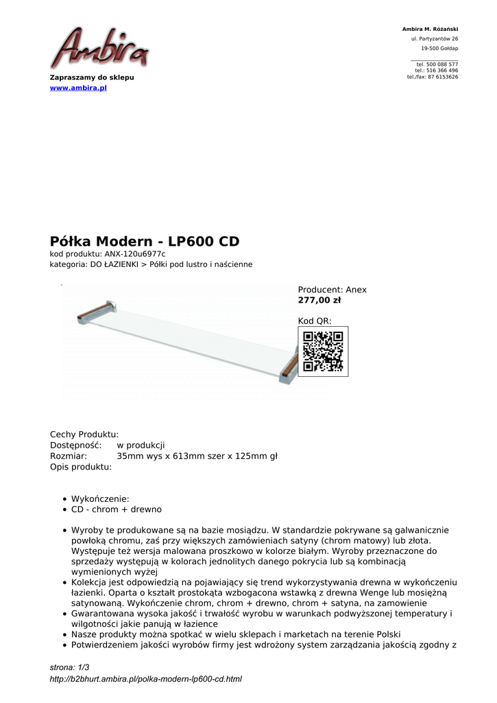 Ambira M. Różański ul. Partyzantów 26 19-500 Gołdap ___________________ tel. 500 088 577 tel.: 516 366 496 tel./fax: 87 6153626 Zapraszamy do sklepu www.ambira.pl Półka Modern - LP600 CD kod produktu: ANX-120u6977c kategoria: DO ŁAZIENKI > Półki pod lustro i naścienne Producent: Anex 277,00 zł Kod QR: Cechy Produktu: Dostępność: w produkcji Rozmiar: 35mm wys x 613mm szer x 125mm gł Opis produktu: Wykończenie: CD - chrom + drewno Wyroby te produkowane są na bazie mosiądzu. W standardzie pokrywane są galwanicznie powłoką chromu, zaś przy większych zamówieniach satyny (chrom matowy) lub złota. Występuje też wersja malowana proszkowo w kolorze białym. Wyroby przeznaczone do sprzedaży występują w kolorach jednolitych danego pokrycia lub są kombinacją wymienionych wyżej Kolekcja jest odpowiedzią na pojawiający się trend wykorzystywania drewna w wykończeniu łazienki. Oparta o kształt prostokąta wzbogacona wstawką z drewna Wenge lub mosiężną satynowaną. Wykończenie chrom, chrom + drewno, chrom + satyna, na zamowienie Gwarantowana wysoka jakość i trwałość wyrobu w warunkach podwyższonej temperatury i wilgotności jakie panują w łazience Nasze produkty można spotkać w wielu sklepach i marketach na terenie Polski Potwierdzeniem jakości wyrobów firmy jest wdrożony system zarządzania jakością zgodny z strona: 1/3 http://b2bhurt.ambira.pl/polka-modern-lp600-cd.html normą ISO 9001:2000 strona: 2/3 http://b2bhurt.ambira.pl/polka-modern-lp600-cd.html strona: 3/3 http://b2bhurt.ambira.pl/polka-modern-lp600-cd.html