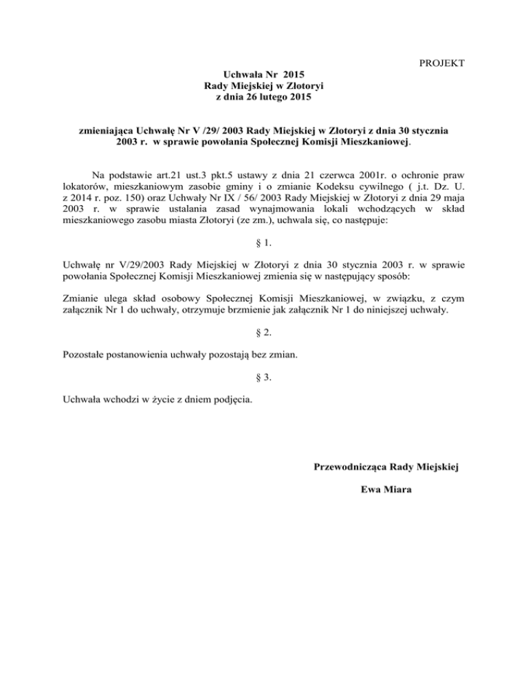 PROJEKT Uchwała Nr 2015 Rady Miejskiej w Złotoryi z dnia 26 lutego 2015 zmieniająca Uchwałę Nr V /29/ 2003 Rady Miejskiej w Złotoryi z dnia 30 stycznia 2003 r. w sprawie powołania Społecznej Komisji Mieszkaniowej. Na podstawie art.21 ust.3 pkt.5 ustawy z dnia 21 czerwca 2001r. o ochronie praw lokatorów, mieszkaniowym zasobie gminy i o zmianie Kodeksu cywilnego ( j.t. Dz. U. z 2014 r. poz. 150) oraz Uchwały Nr IX / 56/ 2003 Rady Miejskiej w Złotoryi z dnia 29 maja 2003 r. w sprawie ustalania zasad wynajmowania lokali wchodzących w skład mieszkaniowego zasobu miasta Złotoryi (ze zm.), uchwala się, co następuje: § 1. Uchwałę nr V/29/2003 Rady Miejskiej w Złotoryi z dnia 30 stycznia 2003 r. w sprawie powołania Społecznej Komisji Mieszkaniowej zmienia się w następujący sposób: Zmianie ulega skład osobowy Społecznej Komisji Mieszkaniowej, w związku, z czym załącznik Nr 1 do uchwały, otrzymuje brzmienie jak załącznik Nr 1 do niniejszej uchwały. § 2. Pozostałe postanowienia uchwały pozostają bez zmian. § 3. Uchwała wchodzi w życie z dniem podjęcia. Przewodnicząca Rady Miejskiej Ewa Miara Załącznik Nr 1 do Uchwały Nr ……..Rady Miejskiej w Złotoryi z dnia .......................... zmieniającej Uchwałę Nr V /29/ 2003 Rady Miejskiej w Złotoryi z dnia 30 stycznia 2003 r. w sprawie powołania Społecznej Komisji Mieszkaniowej. WYKAZ OSÓB DO SKŁADU OSOBOWEGO SPOŁECZNEJ KOMISJI MIESZKANIOWEJ. 1. Irena Zagrobelna 2. Anna Szczecina 3. Maria Kopeć 4. Marzena Smolarczyk 5. Mirella Samborska 6. Anna Markowska 7. Krystyna Rybicka 8. Monika Wozowczyk 9. Magdalena Weber 10. Monika Kaczmarek 11. Stanisław Pazera 12. Paweł Szura