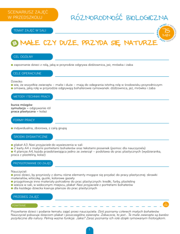 SCENARIUSZ ZAJĘĆ W PRZEDSZKOLU RÓŻNORODNOŚĆ BIOLOGICZNA 75 TEMAT ZAJĘĆ W SALI MAŁE CZY DUŻE, PRZYDA SIĘ NATURZE MIN CEL OGÓLNY zapoznanie dzieci z rolą, jaką w przyrodzie odgrywa dżdżownica, jeż, mrówka i żaba CELE OPERACYJNE Dziecko: wie, że wszystkie zwierzęta – małe i duże – mają do odegrania istotną rolę w środowisku przyrodniczym omawia, jaką rolę w przyrodzie odgrywają bohaterowie rymowanek: dżdżownica, jeż, mrówka i żaba METODY I TECHNIKI PRACY burza mózgów symulacja – odgrywanie ról praca plastyczna – kolaż Formy pracy indywidualna, zbiorowa, z całą grupą ŚRODKI DYDAKTYCZNE plakat A3 Nasi przyjaciele do wywieszenia w sali 2 karty A4 z małymi portretami bohaterów oraz tekstami piosenek (pomoc dla nauczyciela) 4 plansze A4, każda przedstawiająca jedno ze zwierząt – podstawa do prac plastycznych (wydzieranka, praca z plasteliny, kolaż) PRZYGOTOWANIE DO ZAJĘĆ Nauczyciel: prosi dzieci, by przyniosły z domu różne elementy mogące się przydać do pracy plastycznej: skrawki materiałów, włóczkę, guziki, kolorowe gazety przygotowuje inne materiały potrzebne do prac plastycznych: kredki, farby, plastelinę wiesza w sali, w widocznym miejscu, plakat Nasi przyjaciele z portretami bohaterów dla każdego dziecka kseruje plansze do prac plastycznych PRZEBIEG ZAJĘĆ 2 min POWITANIE Przywitanie dzieci i podanie tematu zajęć przez nauczyciela: Dziś poznamy czterech małych bohaterów. Nauczyciel pokazuje dzieciom plakat i poszczególne zwierzęta: Zobaczcie, to jest… Te małe zwierzęta są bardzo pożyteczne dla natury. Pełnią ważne funkcje. Jakie? Zaraz poznamy ich role dzięki rymowanym historyjkom. 1 MAŁE CZY DUŻE, przyda się naturze PRZEBIEG ZAJĘĆ CD. 4 min HASŁO Na początku nauczymy się hasła, które pomoże nam zapamiętać, że wszystkie istoty żywe – i te małe, i te duże są ważne i potrzebne. Nauczyciel podaje hasło: „Małe czy duże, przyda się naturze” i krótko je omawia: Musimy szanować wszystkie zwierzęta, nie przeszkadzać im żyć. Każde zwierzę ma swoją rolę w przyrodzie, pełni ważne funkcje. Dziś, jak już wiecie, lepiej poznamy cztery zwierzęta i dowiemy się, dlaczego są bardzo pożyteczne. Nauczyciel proponuje zabawę na dzisiejsze zajęcia: Zawsze gdy podniosę ręce do góry, wy głośno powtarzacie hasło: „Małe czy duże, przyda się naturze”. Zróbmy próbę. Dzieci głośno powtarzają. 9 min ŻABA Nauczyciel podchodzi do plakatu i mówi: Zaczniemy od żaby. Nauczyciel zadaje kilka prostych pytań: Kto z was widział żabę? Gdzie najłatwiej zobaczyć żabę? Czy żaby zawsze są zielone? Nauczyciel czyta rymowankę. Na zakończenie, zgodnie z umową, podnosi ręce do góry. Dzieci chórem powtarzają hasło: „Małe czy duże, przyda się naturze!” Nauczyciel krótko podsumowuje: Żaba jest bardzo pożyteczna, bo dba o to, by nie było zbyt wielu komarów na świecie. Komary to jej pożywienie. Kto z was lubi, gdy wkoło jest dużo komarów? Komary, jak wszystkie zwierzęta, mają swoją rolę w naturze. Ale nie powinno być ich za dużo. I tu nieocenione są żaby, które wyłapują komary! Nauczyciel prosi dzieci, aby naśladowały ruchy i odgłosy żaby (skoki, kumkanie). 9 min DŻDŻOWNICA Dzieci wracają na miejsca. Nauczyciel zadaje kilka prostych pytań: Kto widział dżdżownicę? Kiedy najłatwiej ją zobaczyć? Dżdżownice po deszczu opuszczają swoje podziemne kryjówki i wychodzą na powierzchnię. Nie róbcie im krzywdy. Jakie kolory mają dżdżownice? Nauczyciel czyta rymowankę. Na zakończenie, zgodnie z umową, podnosi ręce do góry. Dzieci chórem powtarzają hasło: „Małe czy duże, przyda się naturze!” Nauczyciel krótko podsumowuje: Dżdżownica drąży w ziemi kanaliki i w ten sposób ją spulchnia. Dzięki temu kwiaty mogą rosnąć. Gdy kwiaty dobrze rosną, produkują nektar, który spijają np. motyle i trzmiele (bąki). Tak wspaniale współpracują zwierzęta! Nauczyciel prosi dzieci, aby naśladowały ruchy dżdżownicy (dzieci kładą się na podłodze i na brzuchach posuwają się do przodu). 9 min JEŻ Dzieci wracają na miejsca. Nauczyciel zagaja: Teraz poznamy jeża. Czy ktoś z was widział jeża? Trudno go zobaczyć, bo jeże polują nocą, a w dzień śpią. Gdy kiedyś jednak spotkacie jeża – nie dotykajcie go. Nauczyciel czyta rymowankę. Na zakończenie, zgodnie z umową, podnosi ręce do góry, a dzieci chórem powtarzają hasło: „Małe czy duże, przyda się naturze!” Nauczyciel krótko podsumowuje: Jeże żywią się małymi zwierzętami, na przykład ślimakami. To dobrze, bo dzięki temu szkodniki nie niszczą plonów. Nauczyciel prosi dzieci, aby naśladowały jeża (głośne tupanie tup, tup, tup). 9 min MRÓWKA Dzieci wracają na miejsca. Nauczyciel pyta: Czy wiecie, gdzie żyją mrówki? Na pewno każde z was widziało mrówkę. A kto widział mrowisko? W mrowisku żyje bardzo wiele mrówek. To ich dom. Nigdy nie psujcie mrowiska! Nauczyciel czyta rymowankę. Na zakończenie, zgodnie z umową, podnosi ręce do góry. Dzieci chórem powtarzają hasło: „Małe czy duże, przyda się naturze!” Nauczyciel krótko podsumowuje: Podczas pracy mrówki roznoszą nasionka po całym lesie. Dzięki temu rosną nowe drzewa i kwiaty. Mrówki są niezwykle pracowite. Pamiętajcie, że są bardzo pożyteczne. Nauczyciel prosi dzieci, aby naśladowały ruchy i odgłosy mrówek w mrowisku (szum, dzieci poruszają się na czworakach we wszystkich kierunkach). 20 min PRACA TWÓRCZA Nauczyciel rozdaje dzieciom kartki z postaciami, które poznały, by w dowolnej technice plastycznej stworzyły własne wizje zwierzątek. 2 MAŁE CZY DUŻE, przyda się naturze PRZEBIEG ZAJĘĆ CD. 3 min BOGACTWO ZWIERZĄT Nauczyciel prosi dzieci, żeby położyły swoje prace w jednym miejscu na podłodze. Podsumowuje: Zobaczcie, jakie piękne zwierzęta. Każde jest inne, każde jest wyjątkowe. Każde jest ważne. Prosi