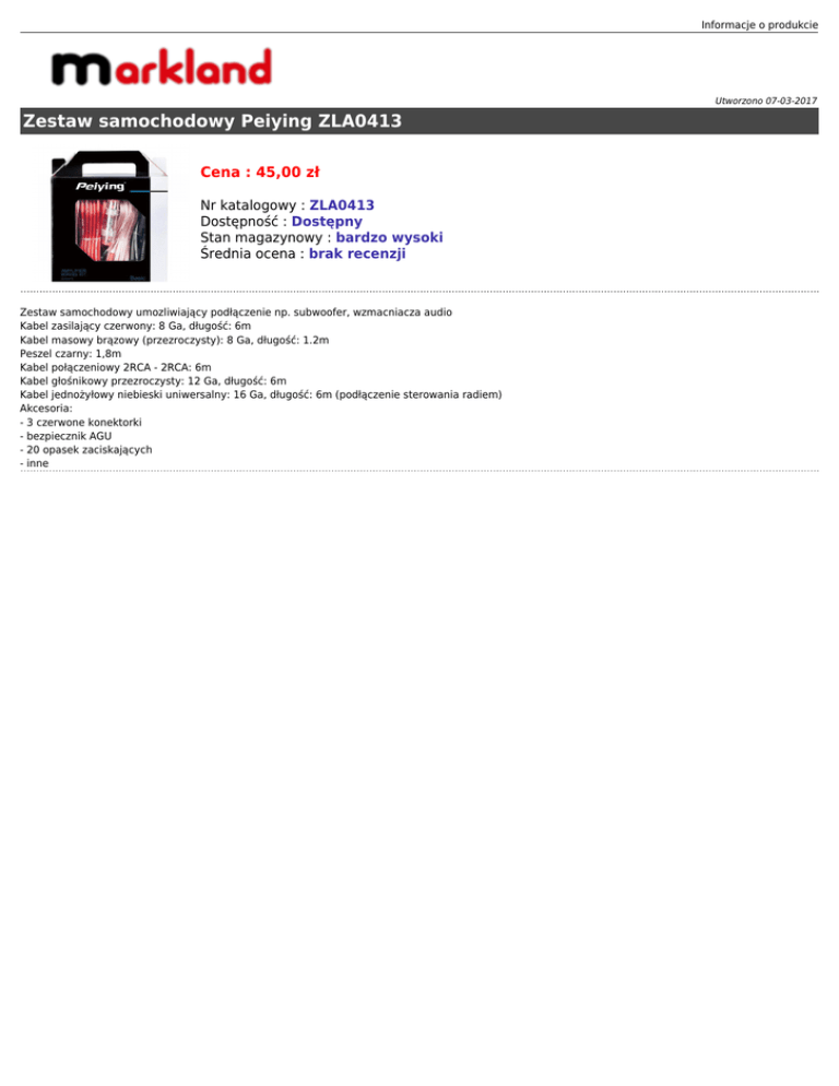 Informacje o produkcie Utworzono 07-03-2017 Zestaw samochodowy Peiying ZLA0413 Cena : 45,00 zł Nr katalogowy : ZLA0413 Dostępność : Dostępny Stan magazynowy : bardzo wysoki Średnia ocena : brak recenzji Zestaw samochodowy umozliwiający podłączenie np. subwoofer, wzmacniacza audio Kabel zasilający czerwony: 8 Ga, długość: 6m Kabel masowy brązowy (przezroczysty): 8 Ga, długość: 1.2m Peszel czarny: 1,8m Kabel połączeniowy 2RCA - 2RCA: 6m Kabel głośnikowy przezroczysty: 12 Ga, długość: 6m Kabel jednożyłowy niebieski uniwersalny: 16 Ga, długość: 6m (podłączenie sterowania radiem) Akcesoria: - 3 czerwone konektorki - bezpiecznik AGU - 20 opasek zaciskających - inne