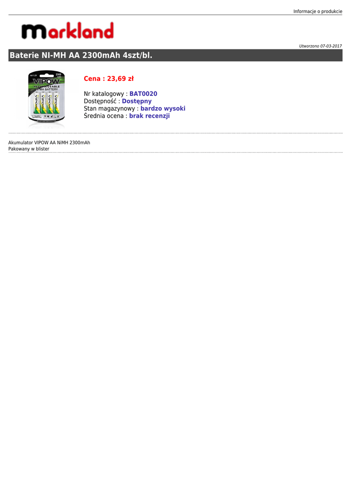 Informacje o produkcie Utworzono 07-03-2017 Baterie NI-MH AA 2300mAh 4szt/bl. Cena : 23,69 zł Nr katalogowy : BAT0020 Dostępność : Dostępny Stan magazynowy : bardzo wysoki Średnia ocena : brak recenzji Akumulator VIPOW AA NiMH 2300mAh Pakowany w blister