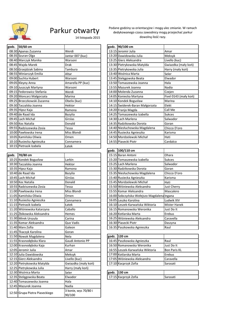 Parkur otwarty 14 listopada 2015 godz. 08:30 08:35 08:40 08:45 08:50 08:55 09:00 09:05 09:10 09:15 09:20 09:25 09:30 09:35 09:40 09:45 09:50 09:55 10:00 10:05 10:10 10:15 50/60 cm Apanas Zuzanna Szuran Olga Marczyk Monika Wajda Marek Grzejdziak Sabina Winiarczyk Emilia Suchta Hubert Kleyny Anna Juszczyk Martyna Fedorowicz Stefania Moncarz Małgorzata Brzeczkowski Zuzanna Taczalska Joanna Hipsz Kaja de Raad Ida Lach Michał Koc Natalia Radziszewska Zosia Pawłowska Irena Kamińska Oliwia Rusiecka Agnieszka Pietrasik Izabela godz. 10:25 10:30 10:35 10:40 10:45 10:50 10:55 11:00 11:05 11:10 11:15 11:20 11:25 11:30 11:35 11:40 11:45 11:50 11:55 12:00 12:05 12:10 12:15 12:20 12:25 12:30 12:35 12:40 12:45 70/80 cm Kondek Bogusław Taczalska Joanna Hipsz Kaja de Raad Ida Lach Michał Koc Natalia Radziszewska Zosia Pawłowska Irena Kamińska Oliwia Rusiecka Agnieszka Pietrasik Izabela Wiśniewska Katarzyna Żbikowska Aleksandra Mirek Urszula Komar Aleksandra Marx Zofia Tkaczyk Karolina Nowak Magdalena Krasnodębska Klara Krasnodębska Kaja Jeromir Julia Julia Dawidowska Gierz Aleksandra Pietrykowska Matylda Pietrykowska Julia Woźnica Marta Stelęgowska Beata Tomaszewska Joanna Mazurek Joanna 12:50 Grupa Piotra Piaseckiego Werdi Jantar 007 (kuc) Warsoni Drak Tambura Altar Warsoni Amarella PP (kuc) Warsoni Werdi Marina Obelix (kuc) Hektor Ramona Bazylia Girslas Donald Tessa Miss Blondi Omen Connamera Łatek Larkin Hektor Ramona Bazylia Girslas Donald Tessa Miss Blondi Omen Connamera Łatek Caballo Hemes Carina Quo Vadis Galeon Goran Nela Gaudi Antonio PP Kurhan Amar Meksyk Livello (kuc) Gwiazdka (mały koń) Harry (mały koń) Seler Elwador Hala Nadia 3 konie, wys 70/80 i 90/100 Podane godziny sa orientacyjne i mogą ulec zmianie. W ramach dedykowanego czasu zawodnicy mogą przejechać parkur dowolną ilość razy. godz. 13:15 13:20 13:25 13:30 13:35 13:40 13:45 13:50 13:55 14:00 14:05 14:10 14:15 14:20 14:25 14:30 14:35 14:40 14:45 14:50 14:55 90/100 cm Jeromir Julia Dawidowska Julia Gierz Aleksandra Pietrykowska Matylda Pietrykowska Julia Woźnica Marta Stelęgowska Beata Tomaszewska Joanna Mazurek Joanna Molenda Zuzanna Koniecka Martyna Kondek Bogusław Świderek-Baran Małgorzata Franjo Magda Tomaszewska Izabella Lach Marlena Radzikowska Dorota Niesłuchowska Magdalena Rusiecka Agnieszka Mordzelewski Michał Piasecki Piotr godz. 15:15 15:20 15:25 15:30 15:35 15:40 15:45 15:50 15:55 16:00 16:05 16:10 16:15 16:20 16:25 16:30 16:35 100/110 cm Baran Antoni Ohara Tomaszewska Izabella Sukces Lach Marlena Salwador Radzikowska Dorota Goran Niesłuchowska Magdalena Chicco D'oro Rusiecka Agnieszka Karisma Mordzelewski Michał Hati Wiśniewska Aleksandra Just Cherry Komar Aleksandra Mascalero Sobczyńska-Wołejszo Magdalena Ingana Leszko Karolina Ludwik XIV Leszek-Karwańska Wiktoria Mister Hanek Romanowska Weronika Just Do It Kotlarska Marta Erebus Wiśniewska Aleksandra Caravella Piasecki Piotr Daszyna Raul Paszkowska Agnieszka godz. 16:45 16:50 16:55 17:00 17:05 17:10 120 cm Paszkowska Agnieszka Romanowska Weronika Leszek-Karwańska Wiktoria Kotlarska Marta Wiśniewska Aleksandra Kacprzyk Zofia godz. 130 cm 17:15 Kacprzyk Zofia Amar Meksyk Livello (kuc) Gwiazdka (mały koń) Harry (mały koń) Seler Elwador Hala Nadia Czejen Fivel 0143 (mały koń) Marina Elekt Call Me Sukces Salwador Goran Chicco D'oro Karisma Hati Cardalco Raul Just Do It Bon Paris KL Erebus Caravella Sarasati Sarasati