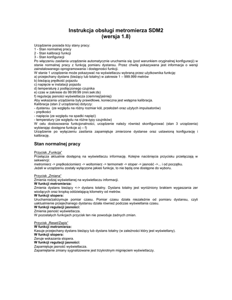 Instrukcja obsługi metromierza SDM2 (wersja 1.8) Urządzenie posiada trzy stany pracy: 1 - Stan normalnej pracy 2 - Stan kalibracji funkcji 3 - Stan konfiguracji Po włączeniu zasilania urządzenie automatycznie uruchamia się (pod warunkiem oryginalnej konfiguracji) w stanie normalnej pracy z funkcją pomiaru dystansu. Przez chwilę pokazywana jest informacja o wersji zainstalowanego oprogramowania i dostępności funkcji. W stanie 1 urządzenie może pokazywać na wyświetlaczu wybraną przez użytkownika funkcję: a) przejechany dystans (bieżący lub totalny) w zakresie 1 – 999.999 metrów b) bieżącą prędkość pojazdu c) napięcie w instalacji pojazdu d) temperaturę z podłączonego czujnika e) czas w zakresie do 99:99:99 (min:sek:ds) f) regulację jasności wyświetlacza (ciemniej/jaśniej) Aby wskazania urządzenia były prawidłowe, konieczna jest wstępna kalibracja. Kalibracja (stan 2 urządzenia) dotyczy: - dystansu (ze względu na różny rozmiar kół, przełożeń oraz użytych impulsatorów) - prędkości - napięcia (ze względu na spadki napięć) - temperatury (ze względu na różne typy czujników) W celu dostosowania funkcjonalności, urządzenie należy również skonfigurować (stan 3 urządzenia) wybierając dostępne funkcje a) – f) Urządzenie po wyłączeniu zasilania zapamiętuje zmierzone dystanse oraz ustawioną konfigurację i kalibrację. Stan normalnej pracy Przycisk „Funkcja” Przełącza aktualnie dostępną na wyświetlaczu informację. Kolejne naciśnięcia przycisku przełączają w sekwencji: metromierz -> prędkościomierz -> woltomierz -> termometr -> stoper -> jasność ->... i od początku. Jeżeli w urządzeniu zostały wyłączone jakieś funkcje, to nie będą one dostępne do wyboru. Przycisk „Zmiana” Zmienia rodzaj wyświetlanej na wyświetlaczu informacji. W funkcji metromierza: Zmienia dystans bieżący <-> dystans totalny. Dystans totalny jest wyróżniony brakiem wygaszania zer wiodących oraz kropką oddzielającą kilometry od metrów. W funkcji stopera: Uruchamia/zatrzymuje pomiar czasu. Pomiar czasu działa niezależnie od pomiaru dystansu, czyli uaktualnienie przejechanego dystansu działa również podczas wyświetlania czasu. W funkcji regulacji jasności: Zmienia jasność wyświetlacza. W pozostałych funkcjach przycisk ten nie powoduje żadnych zmian. Przycisk „Reset/Zapis” W funkcji metromierza: Kasuje przejechany dystans bieżący lub dystans totalny (w zależności który jest wyświetlany). W funkcji stopera: Zeruje wskazania stopera. W funkcji regulacji jasności: Zapamiętuje jasność wyświetlacza. Zapamiętanie zmiany sygnalizowane jest trzykrotnym mignięciem wyświetlaczy. Stan kalibracji Stan ten aktywowany jest poprzez dłuższe (ponad 0,5s) wciśnięcie przycisku „Kalibracja” w funkcji która ma zostać skalibrowana. Kalibracja dystansu polega na przejechaniu dowolnego znanego odcinka drogi a następnie skorygowanie wartości wyświetlanej do wartości rzeczywistej. Kolejne kroki do wykonania: - Zatrzymać auto na początku znanego odcinka - Przełączyć funkcję na metromierz - Wyzerować wskazania metromierza (przycisk „Reset”) - Aktywować stan kalibracji (przycisk „Kalibracja” ponad 0,5s) - Przejechać znany odcinek i zatrzymać auto - Przyciskami „+” i „-” ustawić wartość na wyświetlaczu tak, aby odpowiadała rzeczywistości - Przyciskiem „Zapis” zapisać kalibrację dystansu do pamięci Prędkościomierz zostanie skalibrowany automatycznie. Kalibracja prędkościomierza polega na dodatkowym skorygowaniu wyświetlanej prędkości do wartości rzeczywistej pokazywanej np przez GPS lub inne skalibrowane urządzenie. Korektę można również przeprowadzić w celu zmiany jednostek z km/h na mile/h. Kolejne kroki do wykonania: - Rozpędzić auto do dowolnej prędkości i utrzymywać ją na stałym poziomie przez chwilę w celu stabilizacji odczytów - Przełączyć funkcję na prędkościomierz (przycisk „Funkcja” aż wyświetli się symbol „P”) - Aktywować stan kalibracji (przycisk „Kalibracja” ponad 0,5s) - Odczytać wskazywaną prędkość z urządzenia GPS - Przyciskami „+” i „-” ustawić wartość na wyświetlaczu tak, aby odpowiadała rzeczywistości - Przyciskiem „Zapis” zapisać kalibrację prędkości do pamięci Uwaga: Dla bezpieczeństwa zalecane jest kalibrowanie prędkości przez pasażera! Kalibracja woltomierza polega na skorygowaniu wyświetlanej wartości do wartości rzeczywistej. Kolejne kroki do wykonania: - Przełączyć funkcję na woltomierz (przycisk „Funkcja” aż wyświetli się symbol „n”) - Aktywować stan kalibracji (przycisk „Kalibracja” ponad 0,5s) - Zmierzyć miernikiem rzeczywiste napięcie w instalacji - Przyciskami „+” i „-” ustawić wartość na wyświetlaczu tak, aby odpowiadała rzeczywistości - Przyciskiem „Zapis” zapisać kalibrację napięcia do pamięci Kalibracja termometru polega na skorygowaniu wyświetlanej wartości do wartości rzeczywistej. Wymaga wcześniejszego podłączenia zewnętrznego czujnika temperatury (standardowego znajdującego się w instalacji pojazdu lub dodatkowego). Kolejne kroki do wykonania: - Przełączyć funkcję na termometr (przycisk „Funkcja” aż wyświetli się symbol „t”) - Aktywować stan kalibracji (przycisk „Kalibracja” ponad 0,5s) - Zmierzyć rzeczywistą temperaturę przy czujniku - Przyciskami „+” i „-” ustawić wartość na wyświetlaczu tak, aby odpowiadała rzeczywistości - Przyciskiem „Zapis” zapisać kalibrację temperatury do pamięci Uwaga: Ze względu na nieliniowość samochodowych czujników temperatury, kalibrację należy przeprowadzać przy temperaturze która powinna być docelowa (np. 90 stopni dla temperatury silnika, 20 stopni dla temperatury powietrza, itd). Wskazania termometru będą mniej dokładne przy oddalaniu się od punktu kalibracji. Zapamiętanie zmiany sygnalizowane jest trzykrotn