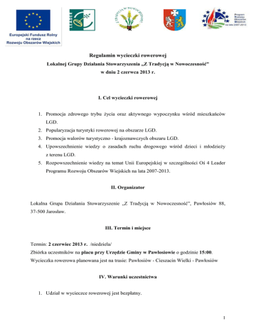 Regulamin wycieczki rowerowej Lokalnej Grupy Działania Stowarzyszenia „Z Tradycją w Nowoczesność” w dniu 2 czerwca 2013 r. I. Cel wycieczki rowerowej 1. Promocja zdrowego trybu życia oraz aktywnego wypoczynku wśród mieszkańców LGD. 2. Popularyzacja turystyki rowerowej na obszarze LGD. 3. Promocja walorów turystyczno - krajoznawczych obszaru LGD. 4. Upowszechnienie wiedzy o zasadach ruchu drogowego wśród dzieci i młodzieży z terenu LGD. 5. Rozpowszechnienie wiedzy na temat Unii Europejskiej w szczególności Oś 4 Leader Programu Rozwoju Obszarów Wiejskich na lata 2007-2013. II. Organizator Lokalna Grupa Działania Stowarzyszenie „Z Tradycją w Nowoczesność”, Pawłosiów 88, 37-500 Jarosław. III. Termin i miejsce Termin: 2 czerwiec 2013 r. /niedziela/ Zbiórka uczestników na placu przy Urzędzie Gminy w Pawłosiowie o godzinie 15:00. Wycieczka rowerowa planowana jest na trasie: Pawłosiów - Cieszacin Wielki - Pawłosiów IV. Warunki uczestnictwa 1. Udział w wycieczce rowerowej jest bezpłatny. 1 2. Uczestnikiem wycieczki rowerowej może zostać każda osoba mieszkająca na obszarze gmin wchodzących w skład LGD tj. Chłopice, Kańczuga, Pawłosiów, Pruchnik, Roźwienica. 3. Uczestnikiem wycieczki może zostać każda osoba, której stan zdrowia pozwala na udział. 4. W wycieczce rowerowej mogą brać udział: osoby niepełnoletnie w wieku do 12 lat wyłącznie pod opieką rodziców lub dorosłego opiekuna, osoby niepełnoletnie od 13 lat mogą brać udział w wycieczce rowerowej pod warunkiem, iż rodzice lub prawni opiekunowie wyrażają pisemną zgodę na ich udział w wycieczce. Wzór oświadczenia o wyrażeniu zgody jest załącznikiem nr 1 do regulaminu. 5. Uczestnicy wycieczki zobligowani są do obowiązkowego podporządkowania się kierownictwu wycieczki. V. Obowiązki uczestnika wycieczki rowerowej 1. Warunkiem uczestnictwa w wycieczce jest bezwzględne przestrzeganie regulaminu oraz podporządkowanie się decyzjom organizatora wycieczki. 2. Uczestnicy wycieczki zobowiązani są do posiadania ważnych dokumentów: dokument tożsamości, legitymację szkolną, kartę rowerową. 3. Każdego uczestnika obowiązuje znajomość przepisów ruchu drogowego oraz ich przestrzeganie. 4. Udział w wycieczce odbywa się przy nieograniczonym ruchu drogowym. Wszyscy uczestnicy wycieczki muszą zachować szczególną ostrożność i zobowiązani są do bezwzględnego przestrzegania przepisów o ruchu drogowym. 5. Jazda powinna odbywać się w szyku, każdy uczestnik dostosowuje swoją prędkość do umiejętności oraz warunków panujących na drodze. 6. Każdy manewr na drodze musi być odpowiednio zasygnalizowany oraz przeprowadzony z upewnieniem o możliwości bezpiecznego jego wykonania. 7. Postoje należy organizować poza jezdnią w taki sposób, aby nie tarasować drogi innym uczestnikom. 8. Każdy uczestnik zobowiązuje się posiadać sprawny rower z dodatkowym wyposażeniem, np.: dzwonek, oświetlenie, odblaski, itp. 2 9. Uczestnicy wycieczki biorą pełną odpowiedzialność za właściwy stan techniczny posiadanych pojazdów, wszelkie ewentualne naprawy sprzętu i inne sytuacje wymagające postoju muszą odbywać się w bezpiecznym miejscu, na poboczu, tak, aby nie tarasowały drogi innym uczestnikom wycieczki. 10. Uczestnicy wycieczki zobowiązani są ubezpieczyć się we własnym zakresie. 11. Wszyscy uczestnicy są proszeni o niezaśmiecanie trasy wycieczki i szczególną troskę o środowisko naturalne. 12. Nie wolno spożywać alkoholu ani innych środków mogących zagrozić zdrowiu, bezpieczeństwu jazdy czy życiu. VI. Obowiązki organizatora 1. Organizatorzy nie biorą na siebie odpowiedzialności za rzeczy zaginione, szkody osobowe, rzeczowe i majątkowe, które wystąpią przed, w trakcie lub po wycieczce rowerowej. 2. Organizator bierze odpowiedzialność za uczestników wycieczki rowerowej w trakcie jej trwania. 3. Organizator zapewnia pomoc medyczną, którą stanowić będzie osoba o odpowiednich kwalifikacjach. 4. Organizator zapewnia pomoc techniczną w postaci osoby o odpowiednich kwalifikacjach posiadającej mechaniczny środek transportu. 5. Organizator zapewnia posiłek oraz napoje dla uczestników wycieczki. 6. Organizator zorganizuje gry i zabawy dla uczestników wycieczki, w których uczestnicy otrzymają drobne nagrody rzeczowe. 7. Organizator wyróżni zgłoszoną najliczniejszą rodzinę, najstarszego oraz najmłodszego uczestnika wycieczki. 8. Organizator zastrzega sobie udział maksymalnie do 50 osób w wycieczce. 9. W przypadku niesprzyjającej aury pogodowej w dniu organizacji wycieczki rowerowej organizator zobowiązuje się do zorganizowania małych rozgrywek sportowych w sali gimnastycznej Szkoły Podstawowej w Pawłosiowie dla uczestników wycieczki. Pozostała część organizacyjno – zabezpieczająca wydarzenie pozostaje bez zmian. 3 VII. Postanowienia końcowe 1. Za skutki naruszenia przepisów Kodeksu Drogowego i innych przepisów prawa uczestnik odpowiada osobiście. 2. Zaleca się, aby uczestnik wycieczki był wyposażony w kask rowerowy, oświetlenie rowerowe oraz w ubranie dostosowane do aury pogodowej. 3. Wszyscy uczestnicy wycieczki wyrażają zgodę na publikację ich wizerunków w relacjach z przebiegu wycieczki. 4. Zdjęcia, nagrania filmowe oraz wywiady z uczestnikami wycieczki mogą być wykorzystywane przez organizatora. 5. Nieznajomość regulaminu wycieczki rowerowej nie zwalnia uczestników od jego przestrzegania. 6. Nieprzestrzeganie regulaminu wycieczki oraz samowolna zmiana trasy wycieczki powodują wykluczenie z udziału w wydarzeniu. 7. Udział w wycieczce jest dobrowolny, każdy uczestnik startuje na własną odpowiedzialność niezależnie od warunków pogodowych zastanych na trasie. 8. Każdy uczestnik imprezy wypełniając i podpisując listę obecności akceptuje warunki niniejszego Regulaminu i wyraża zgodę na wykorzystanie i przetwarzanie swoich danych osobowych w bazach danych organiz