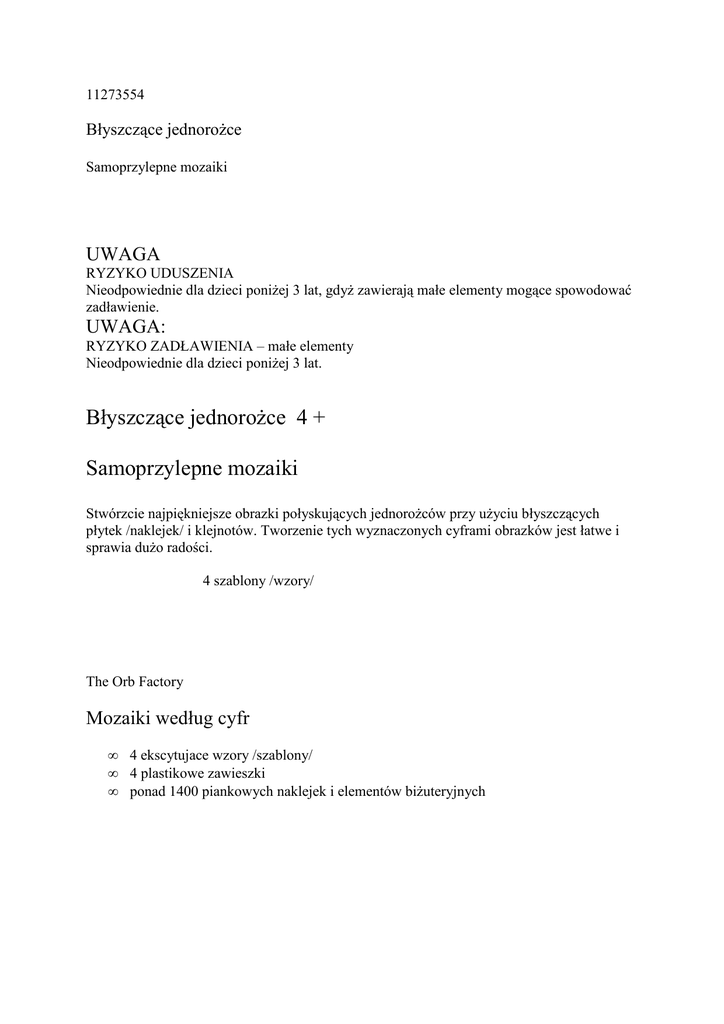 11273554 Błyszczące jednorożce Samoprzylepne mozaiki UWAGA RYZYKO UDUSZENIA Nieodpowiednie dla dzieci poniżej 3 lat, gdyż zawierają małe elementy mogące spowodować zadławienie. UWAGA: RYZYKO ZADŁAWIENIA – małe elementy Nieodpowiednie dla dzieci poniżej 3 lat. Błyszczące jednorożce 4 + Samoprzylepne mozaiki Stwórzcie najpiękniejsze obrazki połyskujących jednorożców przy użyciu błyszczących płytek /naklejek/ i klejnotów. Tworzenie tych wyznaczonych cyframi obrazków jest łatwe i sprawia dużo radości. 4 szablony /wzory/ The Orb Factory Mozaiki według cyfr • • • 4 ekscytujace wzory /szablony/ 4 plastikowe zawieszki ponad 1400 piankowych naklejek i elementów biżuteryjnych