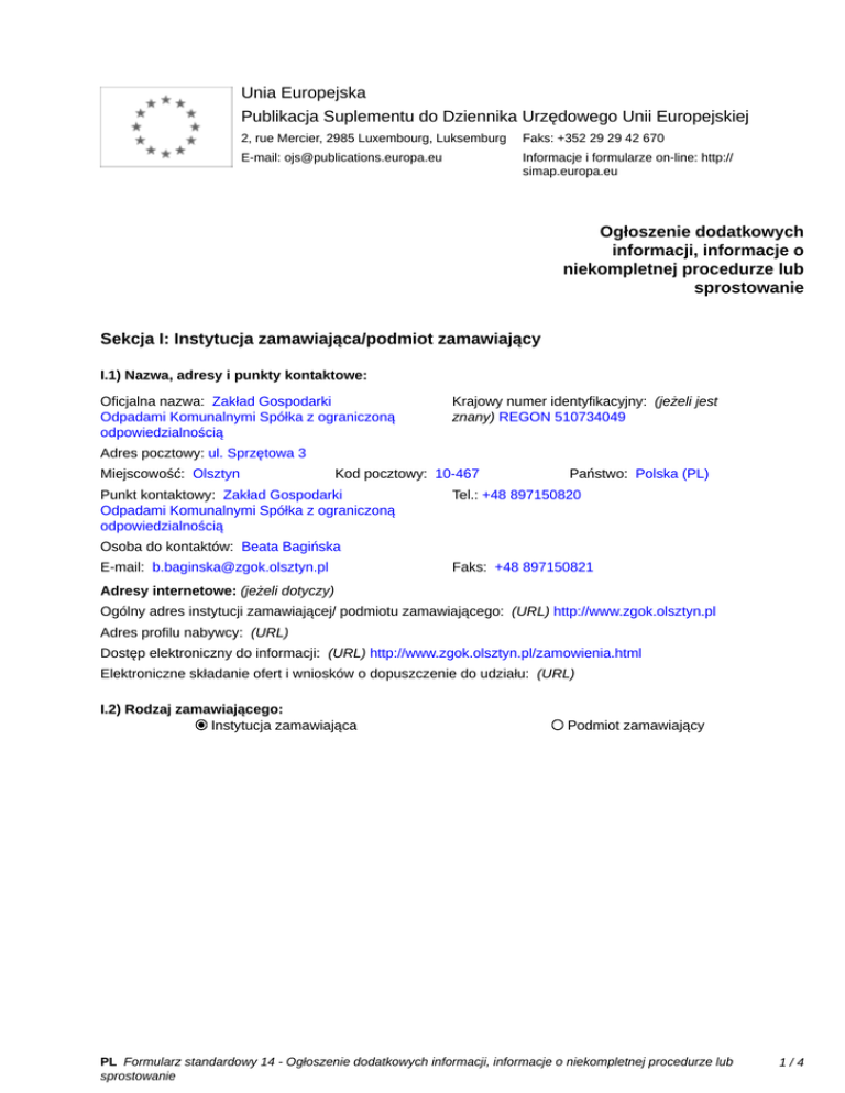 Unia Europejska Publikacja Suplementu do Dziennika Urzędowego Unii Europejskiej 2, rue Mercier, 2985 Luxembourg, Luksemburg Faks: +352 29 29 42 670 E-mail: [email protected] Informacje i formularze on-line: http:// simap.europa.eu Ogłoszenie dodatkowych informacji, informacje o niekompletnej procedurze lub sprostowanie Sekcja I: Instytucja zamawiająca/podmiot zamawiający I.1) Nazwa, adresy i punkty kontaktowe: Oficjalna nazwa: Zakład Gospodarki Odpadami Komunalnymi Spółka z ograniczoną odpowiedzialnością Krajowy numer identyfikacyjny: (jeżeli jest znany) REGON 510734049 Adres pocztowy: ul. Sprzętowa 3 Miejscowość: Olsztyn Kod pocztowy: 10-467 Punkt kontaktowy: Zakład Gospodarki Odpadami Komunalnymi Spółka z ograniczoną odpowiedzialnością Państwo: Polska (PL) Tel.: +48 897150820 Osoba do kontaktów: Beata Bagińska E-mail: [email protected] Faks: +48 897150821 Adresy internetowe: (jeżeli dotyczy) Ogólny adres instytucji zamawiającej/ podmiotu zamawiającego: (URL) http://www.zgok.olsztyn.pl Adres profilu nabywcy: (URL) _____ Dostęp elektroniczny do informacji: (URL) http://www.zgok.olsztyn.pl/zamowienia.html Elektroniczne składanie ofert i wniosków o dopuszczenie do udziału: (URL) _____ I.2) Rodzaj zamawiającego: Instytucja zamawiająca Podmiot zamawiający PL Formularz standardowy 14 - Ogłoszenie dodatkowych informacji, informacje o niekompletnej procedurze lub sprostowanie 1/4 Sekcja II: Przedmiot zamówienia II.1.1) Nazwa nadana zamówieniu: Dostawy paliw dla ZGOK Sp. z o.o. w Olsztynie II.1.2) Krótki opis zamówienia lub zakupu: (podano w pierwotnym ogłoszeniu) 1. Przedmiotem zamówienia są dostawy oleju napędowego, roztworu mocznika oraz gazu propan-butan. 2. Zamówienie jest podzielone na Zadania (części) z możliwością składania ofert częściowych na dowolną ilość części: 2.1. Zadanie nr 1: Dostawy oleju napędowego w ilości: 400 000 litrów oraz roztworu mocznika w wodzie zdemineralizowanej (32,5%) zgodnego z normą DIN70070 lub ISO22241 w ilości 15 000 litrów. 2.2. Zadanie nr 2: Dostawy gazu propan-butan (gaz opałowy) w ilości 160 000 litrów. 4. Zamówienie jest podzielone na Zadania (części) z możliwością składania ofert częściowych na dowolną ilość części 5. Opis przedmiotu zamówienia zgodnie z Rozporządzeniem Komisji (WE) Nr 2151/2003 z 16 grudnia 2003 r. w sprawie Wspólnego Słownika Zamówień (CPV): 09.13.41.00-8 olej napędowy 24.95.70.00-7 dodatki chemiczne 09.12.20.00-0 Propan i butan II.1.3) Wspólny Słownik Zamówień (CPV) Główny przedmiot Dodatkowe przedmioty Słownik główny 09134100 24957000 09122000 Słownik uzupełniający (jeżeli dotyczy) PL Formularz standardowy 14 - Ogłoszenie dodatkowych informacji, informacje o niekompletnej procedurze lub sprostowanie 2/4 Sekcja IV: Procedura IV.1)Rodzaj procedury (podano w pierwotnym ogłoszeniu) Otwarta Ograniczona Ograniczona przyspieszona Negocjacyjna Negocjacyjna przyspieszona Dialog konkurencyjny Negocjacyjna z uprzednim ogłoszeniem Negocjacyjna bez uprzedniego ogłoszenia Negocjacyjna z publikacją ogłoszenia o zamówieniu Negocjacyjna bez publikacji ogłoszenia o zamówieniu Udzielenie zamówienia bez uprzedniej publikacji ogłoszenia o zamówieniu w Dzienniku Urzędowym Unii Europejskiej IV.2)Informacje administracyjne IV.2.1)Numer referencyjny: (podano w pierwotnym ogłoszeniu) ZGOK/12/33/2015 IV.2.2)Dane referencyjne ogłoszenia w przypadku ogłoszeń przesłanych drogą elektroniczną: Pierwotne ogłoszenie przesłane przez eNotices TED eSender Login: ENOTICES_zgokolsztyn Dane referencyjne ogłoszenia: 2015-091088 rok i numer dokumentu IV.2.3)Ogłoszenie, którego dotyczy niniejsza publikacja: Numer ogłoszenia w Dz.U.: 2015/S 132-242722 z dnia: 11/07/2015 (dd/mm/rrrr) IV.2.4)Data wysłania pierwotnego ogłoszenia: 08/07/2015 (dd/mm/rrrr) PL Formularz standardowy 14 - Ogłoszenie dodatkowych informacji, informacje o niekompletnej procedurze lub sprostowanie 3/4 Sekcja VI: Informacje uzupełniające VI.1) Ogłoszenie dotyczy: Procedury niepełnej Sprostowania Informacji dodatkowych VI.2) Informacje na temat niepełnej procedury udzielenia zamówienia: Postępowanie o udzielenie zamówienia zostało przerwane Postępowanie o udzielenie zamówienia uznano za nieskuteczne Zamówienia nie udzielono Zamówienie może być przedmiotem ponownej publikacji VI.3) Informacje do poprawienia lub dodania : VI.3.1) Zmiana oryginalnej informacji podanej przez instytucję zamawiającą Publikacja w witrynie TED niezgodna z oryginalną informacją, przekazaną przez instytucję zamawiającą Oba przypadki VI.3.2) W ogłoszeniu pierwotnym W odpowiedniej dokumentacji przetargowej (więcej informacji w odpowiedniej dokumentacji przetargowej) W obu przypadkach (więcej informacji w odpowiedniej dokumentacji przetargowej) VI.3.3) Tekst, który należy poprawić w pierwotnym ogłoszeniu Miejsce, w którym znajduje się Zamiast: zmieniany tekst: VI.3.4) Daty, które należy poprawić w pierwotnym ogłoszeniu Miejsce, w którym znajdują się Zamiast: zmieniane daty: 27/08/2015 Godzina: 11:15 Sekcja IV.3.4) Termin składania ofert (dd/mm/rrrr) lub wniosków o dopuszczenie do udziału w postępowaniu Miejsce, w którym znajdują się zmieniane daty: Sekcja IV.3.8) Warunki otwarcia ofert: Zamiast: 27/08/2015 Godzina: 11:30 (dd/mm/rrrr) Powinno być: Powinno być: 10/09/2015 Godzina: 11:15 (dd/mm/rrrr) Powinno być: 10/09/2015 Godzina: 11:30 (dd/mm/rrrr) VI.3.5) Adresy i punkty kontaktowe, które należy poprawić VI.3.6) Tekst, który należy dodać do pierwotnego ogłoszenia Miejsce, w którym należy dodać tekst: Tekst do dodania: VI.4) Inne dodatkowe informacje: _____ VI.5) Data wysłania niniejszego ogłoszenia: 18/08/2015 (dd/mm/rrrr) - ID:2015-110711 PL Formularz standardowy 14 - Ogłoszenie dodatkowych informacji, informacje o niekompletnej procedurze lub sprostowanie 4/4