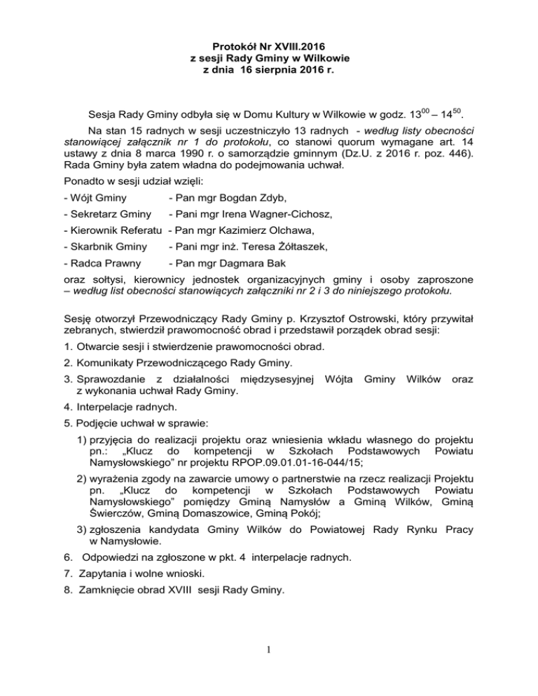 Protokół Nr XVIII.2016 z sesji Rady Gminy w Wilkowie z dnia 16 sierpnia 2016 r. Sesja Rady Gminy odbyła się w Domu Kultury w Wilkowie w godz. 1300 – 1450. Na stan 15 radnych w sesji uczestniczyło 13 radnych - według listy obecności stanowiącej załącznik nr 1 do protokołu, co stanowi quorum wymagane art. 14 ustawy z dnia 8 marca 1990 r. o samorządzie gminnym (Dz.U. z 2016 r. poz. 446). Rada Gminy była zatem władna do podejmowania uchwał. Ponadto w sesji udział wzięli: - Wójt Gminy - Pan mgr Bogdan Zdyb, - Sekretarz Gminy - Pani mgr Irena Wagner-Cichosz, - Kierownik Referatu - Pan mgr Kazimierz Olchawa, - Skarbnik Gminy - Pani mgr inż. Teresa Żółtaszek, - Radca Prawny - Pan mgr Dagmara Bak oraz sołtysi, kierownicy jednostek organizacyjnych gminy i osoby zaproszone – według list obecności stanowiących załączniki nr 2 i 3 do niniejszego protokołu. Sesję otworzył Przewodniczący Rady Gminy p. Krzysztof Ostrowski, który przywitał zebranych, stwierdził prawomocność obrad i przedstawił porządek obrad sesji: 1. Otwarcie sesji i stwierdzenie prawomocności obrad. 2. Komunikaty Przewodniczącego Rady Gminy. 3. Sprawozdanie z działalności międzysesyjnej z wykonania uchwał Rady Gminy. Wójta Gminy Wilków oraz 4. Interpelacje radnych. 5. Podjęcie uchwał w sprawie: 1) przyjęcia do realizacji projektu oraz wniesienia wkładu własnego do projektu pn.: „Klucz do kompetencji w Szkołach Podstawowych Powiatu Namysłowskiego” nr projektu RPOP.09.01.01-16-044/15; 2) wyrażenia zgody na zawarcie umowy o partnerstwie na rzecz realizacji Projektu pn. „Klucz do kompetencji w Szkołach Podstawowych Powiatu Namysłowskiego” pomiędzy Gminą Namysłów a Gminą Wilków, Gminą Świerczów, Gminą Domaszowice, Gminą Pokój; 3) zgłoszenia kandydata Gminy Wilków do Powiatowej Rady Rynku Pracy w Namysłowie. 6. Odpowiedzi na zgłoszone w pkt. 4 interpelacje radnych. 7. Zapytania i wolne wnioski. 8. Zamknięcie obrad XVIII sesji Rady Gminy. 1 Przewodniczący Rady Gminy - p. Krzysztof Ostrowski, poddał pod głosowanie porządek obrad. Za przyjęciem porządku obrad sesji głosowało 13 radnych, przeciw – 0, wstrzymało się od głosu – 0. Porządek obrad przyjęto jednogłośnie. Ad.2. Komunikaty Przewodniczącego Rady Gminy. Przewodniczący Rady Gminy - p. Krzysztof Ostrowski poinformował, że na dzień dzisiejszy nie ma żadnych komunikatów ani ogłoszeń. Ad.3. Wójt Gminy Wilków p. mgr Bogdan Zdyb w pisemnym sprawozdaniu z działalności międzysesyjnej poinformował o wydanych zarządzeniach oraz o podejmowanych działaniach. Przedstawił też sprawozdanie z realizacji uchwał Rady Gminy w Wilkowie podjętych na ostatniej sesji. Przewodniczący Rady Gminy - p. Krzysztof Ostrowski zapytał czy są uwagi lub pytania do sprawozdania z działalności międzysesyjnej Wójta Gminy Wilków oraz z wykonania uchwał Rady Gminy. Radni nie wnieśli uwag ani zapytań. Sprawozdanie z działalności międzysesyjnej Wójta Gminy oraz z realizacji uchwał Rady Gminy, stanowi załącznik nr 4 do protokołu+]]Ad.4. Interpelacje wniósł: Radny p. Tadeusz Szkudlarski w imieniu mieszkańców Pągowa i swoim zapytał: 1) w sprawie terminu zamontowania siłowni na placu zabaw w Pągowie; 2) w sprawie terminu przeprowadzenia postępowania przetargowego na kanalizację we wsi Pągów. Ad.5. Przewodniczący Rady Gminy w Wilkowie p. Krzysztof Ostrowski przedstawił i poddał pod dyskusję projekty uchwał w sprawach: 1) przyjęcia do realizacji projektu oraz wniesienia wkładu własnego do projektu pn.: „Klucz do kompetencji w Szkołach Podstawowych Powiatu Namysłowskiego” nr projektu RPOP.09.01.01-16-044/15. Wyjaśnień do projektu uchwały udzielił Wójt Gminy p. mgr Bogdan Zdyb, który poinformował, że złożony przez Gminę Namysłów wniosek o dofinansowanie projektu pn. „Klucz do kompetencji w Szkołach Podstawowych Powiatu Namysłowskiego” w formie partnerstwa JST w ramach Regionalnego Programu Operacyjnego Województwa Opolskiego na lata 2014 – 2020, został rozpatrzony pozytywnie na etapie oceny merytorycznej i został zakwalifikowany do dofinansowania. Gmina Wilków wraz z Gminą Domaszowice, Gminą Świerczów oraz Gminą Pokój są partnerami projektu natomiast liderem projektu jest Gmina Namysłów. Projekt nadzorowany jest przez Wojewódzki Urząd Pracy w Opolu, który zlecił w trybie pilnym podpisanie do 16 sierpnia 2016 r. porozumienia przez wszystkie 2 gminy partnerskie tzn. przez wszystkie gminy wiejskie z terenu Powiatu Namysłowskiego. Jest to wspólny projekt, który zakłada współpracę między gminami a nie tylko jednostki. Ma on służyć szerszemu gronu ludzi. W projektach unijnych bez partnerstwa na dzień dzisiejszy nic się samemu nie zrobi. Postanowiliśmy taki projekt edukacyjny zbudować i wystąpiliśmy do Wojewódzkiego Urzędu Pracy w Opolu. Nasze szkoły otrzymały około 350.000,00 zł. Na realizację projektu jest dwa lata. Będzie on realizowany w Szkołach Podstawowych w Bukowiu i w Idzikowicach. Wójt Gminy p. mgr Bogdan Zdyb zwrócił się do radnych o zatwierdzenie przedstawionego projektu edukacyjnego, który da upoważnienie do podpisania porozumienia. Radna p. Irena Marszałek zapytała w sprawie terminu rozpoczęcia projektu edukacyjnego w szkołach. Wójt Gminy odpowiedział, że projekt będzie trwał przez dwa lata tylko w szkołach podstawowych i będzie realizowany od 01.09.2016 r. do 30.06.2018 r. Radni nie wnieśli uwag do projektu uchwały. Przewodniczący Rady Gminy p. Krzysztof Ostrowski poddał pod głosowanie projekt uchwały. Za przyjęciem uchwały głosowało 13 radnych, przeciw – 0 , wstrzymało się od głosowania – 0. Uchwałę podjęto jednogłośnie. Uchwała Nr XVIII.127.2016 w sprawie przyjęcia do realizacji projektu oraz wniesienia wkładu własnego do projektu pn.: „Klucz do kompetencji w Szkołach Podstawowych Powiatu Namysłowskiego” nr projektu RPOP.09.01.01-16-044/ stanowi za