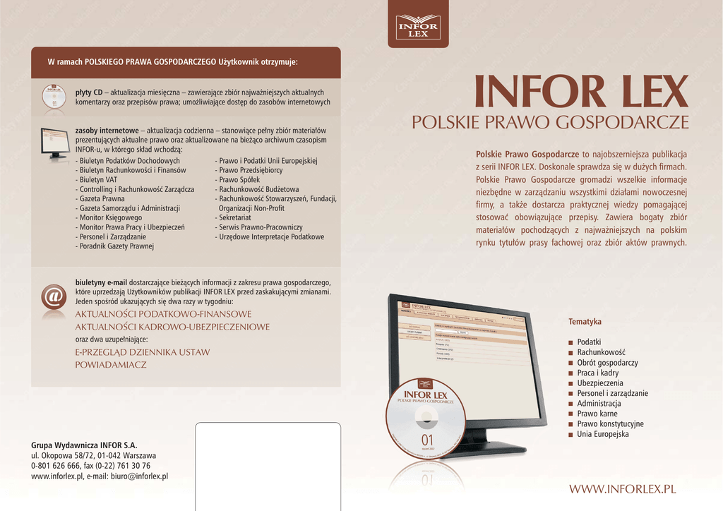 W ramach POLSKIEGO PRAWA GOSPODARCZEGO Użytkownik otrzymuje: płyty CD – aktualizacja miesięczna – zawierające zbiór najważniejszych aktualnych komentarzy oraz przepisów prawa; umożliwiające dostęp do zasobów internetowych zasoby internetowe – aktualizacja codzienna – stanowiące pełny zbiór materiałów prezentujących aktualne prawo oraz aktualizowane na bieżąco archiwum czasopism INFOR-u, w którego skład wchodzą: - Biuletyn Podatków Dochodowych - Prawo i Podatki Unii Europejskiej - Biuletyn Rachunkowości i Finansów - Prawo Przedsiębiorcy - Biuletyn VAT - Prawo Spółek - Controlling i Rachunkowość Zarządcza - Rachunkowość Budżetowa - Gazeta Prawna - Rachunkowość Stowarzyszeń, Fundacji, - Gazeta Samorządu i Administracji Organizacji Non-Profit - Monitor Księgowego - Sekretariat - Monitor Prawa Pracy i Ubezpieczeń - Serwis Prawno-Pracowniczy - Personel i Zarządzanie - Urzędowe Interpretacje Podatkowe - Poradnik Gazety Prawnej INFOR LEX POLSKIE PRAWO GOSPODARCZE Polskie Prawo Gospodarcze to najobszerniejsza publikacja z serii INFOR LEX. Doskonale sprawdza się w dużych firmach. Polskie Prawo Gospodarcze gromadzi wszelkie informacje niezbędne w zarządzaniu wszystkimi działami nowoczesnej firmy, a także dostarcza praktycznej wiedzy pomagającej stosować obowiązujące przepisy. Zawiera bogaty zbiór materiałów pochodzących z najważniejszych na polskim rynku tytułów prasy fachowej oraz zbiór aktów prawnych. biuletyny e-mail dostarczające bieżących informacji z zakresu prawa gospodarczego, które uprzedzają Użytkowników publikacji INFOR LEX przed zaskakującymi zmianami. Jeden spośród ukazujących się dwa razy w tygodniu: AKTUALNOŚCI PODATKOWO-FINANSOWE AKTUALNOŚCI KADROWO-UBEZPIECZENIOWE oraz dwa uzupełniające: E-PRZEGLĄD DZIENNIKA USTAW POWIADAMIACZ Tematyka Podatki Rachunkowość Obrót gospodarczy Praca i kadry Ubezpieczenia Personel i zarządzanie Administracja Prawo karne Prawo konstytucyjne Unia Europejska Grupa Wydawnicza INFOR S.A. ul. Okopowa 58/72, 01-042 Warszawa 0-801 626 666, fax (0-22) 761 30 76 www.inforlex.pl, e-mail: [email protected] WWW.INFORLEX.PL Kompleksowość Zawartość serwisu tworzą w głównej mierze: dokumenty i informacje pochodzące z roczników czasopism Grupy Wydawniczej INFOR, w tym: komentarze do aktów prawnych, porady fachowców, orzeczenia Sądu Najwyższego i Naczelnego Sądu Administracyjnego, wyjaśnienia Ministerstwa Finansów, ZUS i inne, wzory i formularze umów, pozwów, pism, zbiór ujednoliconych aktów prawnych, interpretacje organów skarbowych, zestawienie obowiązujących wskaźników i stawek, odsyłacz do rozbudowanego informatora teleadresowego, kalkulatory. LIZACIJA A AK TUCAO DZ ENN Możliwości szybkie i proste wyszukiwanie za pomocą tematyki, słów w treści lub tytule, typu dokumentu, sygnatury, dat i źródeł publikacji, łatwe przechodzenie między aktami prawnymi i powiązanymi tematycznie publikacjami prasowymi, ustawami i rozporządzeniami wykonawczymi itp. (np. akty wykonawcze do ustawy o podatku od towarów i usług najłatwiej odnaleźć poprzez metrykę tej ustawy – użyć przycisk “Przepisy wykonujące”), jednoczesne, niezależne oglądanie dwóch dokumentów (np. w celu porównania treści publikacji prasowej z brzmieniem aktu prawnego) czytelne wydruki personalizacja ustawień kolorystycznych WWW.INFORLEX.PL