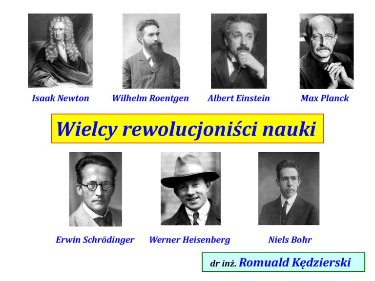 Isaak Newton Wilhelm Roentgen Albert Einstein Max Planck Wielcy rewolucjoniści nauki Erwin Schrödinger Werner Heisenberg Niels Bohr dr inż. Romuald Kędzierski W swoim słynnym dziele Matematyczne podstawy filozofii przyrody (1687 r.) przedstawił prawo powszechnego ciążenia, a także prawa ruchu (zasady dynamiki) leżące u podstaw mechaniki klasycznej. Isaac Newton 1642 – 1727 Jako pierwszy wykazał, że te same prawa rządzą ruchem ciał na Ziemi, jak i ruchem ciał niebieskich (we Wszechświecie). Sukcesy fizyki, której podstawy stanowiły zasady dynamiki Newtona Rozwój koncepcji filozoficznej zwanej determinizmem Każde zdarzenie i stan jest określone przez swoje uprzednio istniejące przyczyny Przypadek nie jest zjawiskiem obiektywnym, gdyż losowość jest subiektywna – wynika z niedoboru informacji Metodologia badań przyrodniczych według Newtona Zasada minimalizmu Badane zjawiska fizyczne należy opisywać w jak najprostszy sposób i nie szukać dodatkowych przyczyn jego wystąpienia, gdy znane są te, które wystarczą do wyjaśnienia jego wystąpienia Zjawiska tego samego typu są powodowane przez takie same przyczyny Ruch obiegowy planet wokół Słońca i ruch satelitów wokół Ziemi można opisać za pomocą tych samych praw fizyki Potwierdzenie prawdziwości wyjaśnienia obserwowanych zjawisk pozwala wyjaśnić także inne zjawiska tego typu Np. jeśli obserwujemy spadek swobodny ciała w pobliżu powierzchni Ziemi, to takie spadanie wystąpi również np. w pobliżu powierzchni Księżyca Dany opis zjawiska fizycznego jest prawdziwy, aż do chwili wykrycia faktów przeczących dotychczasowym ustaleniom Nowe odkrycia mogą obalić dotychczasowy opis zjawiska fizycznego lub ograniczyć zakres jego stosowania Fizyka i technika końca XIX wieku Przekonanie, że wszystkie zjawiska fizyczne zostały odkryte i wyjaśnione Intensywny rozwój przemysłu oparty o dokonane odkrycia na gruncie fizyki Doprecyzowanie istniejących teorii i wyznaczenie z większą dokładnością stałych fizycznych Odkrycie zjawisk, których nie można było wyjaśnić na gruncie istniejących wtedy teorii fizycznych Np. wybijanie elektronów z powierzchni metalu przez padające na nie światło Np. upowszechnienie oświetlenia elektrycznego Np. położenie kabla telekomunikacyjnego łączącego Europę i Amerykę Północną Powstanie tzw. mechaniki kwantowej Max Planck (1900 r.) Rozgrzane ciało promieniuje energię w postaci pojedynczych porcji zwanych kwantami Energia pojedynczego kwantu: E=h·f Albert Einstein (1905 r.) Wyjaśnienie zjawiska fotoelektrycznego zewnętrznego Niels Bohr (1913 r.) Werner Heisenberg (1927 r.) Wyjaśnienie liniowości widma promieniowania atomu wodoru Istnieją takie pary wielkości fizycznych (np. położenie cząstki i jej pęd), których nie można wyznaczyć z dowolną dokładnością Nie wynika to z niedoskonałości pomiaru tych wielkości! Zasada nieokreśloności (nieoznaczoności) Wynika to z natury rzeczywistości! Wnioski wynikające z mechaniki kwantowej Nie jest możliwe dokładne określenie parametrów stanów wyjściowych cząstek Znane są w przyrodzie układy, które na początku zachowują się przewidywalnie… Nie można z całą pewnością określić następnych stanów badanej cząstki ale wraz z upływem czasu zachowują się nieprzewidywalnie (chaotycznie) Kolejny stan danej cząstki można określić tylko z pewnym prawdopodobieństwem! Należy wykluczyć podejście deterministyczne Powstanie koncepcji tzw. indeterminizmu Stan końcowy układu nie jest jednoznacznie określony przez jego stan początkowy! Stan końcowy można określić tylko z pewnym prawdopodobieństwem! Szczególna teoria względności (STW) i ogólna teoria względności (OTW) Alberta Einsteina STW 1905 r. OTW 1916 r. (opublikowana) Nowa teoria grawitacji! Mechaniki klasycznej (Newtona) nie można stosować w przypadku ciał poruszających się z prędkościami porównywalnymi z prędkością światła w próżni! Czas i przestrzeń są ze sobą ściśle związane! Np. pojęcie długości ciała i czasu trwania danego zjawiska są względne! W pobliżu obiektów wytwarzających silne pole grawitacyjne (tzn. o dużych masach) czasoprzestrzeń ulega zakrzywieniu („ugięciu”)! Przewidywania obu teorii zostały potwierdzone doświadczalnie! Wiedza daje pokorę wielkiemu… dziwi przeciętnego… natomiast nadyma małego! Lew Tołstoj