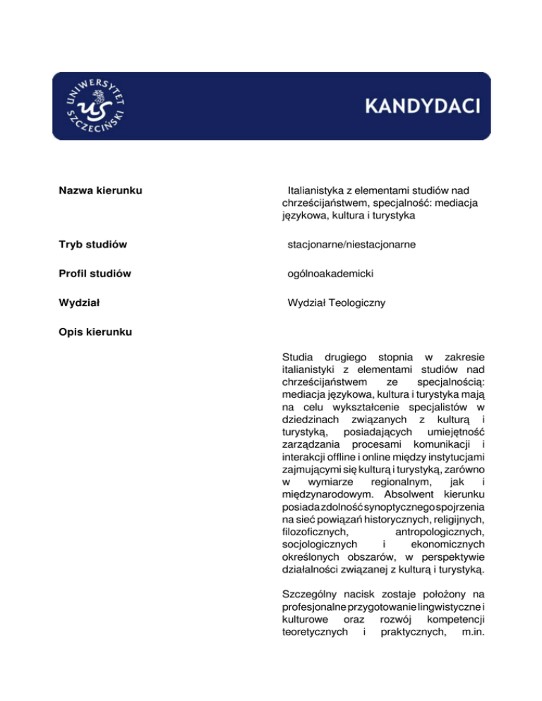 Nazwa kierunku Italianistyka z elementami studiów nad chrześcijaństwem, specjalność: mediacja językowa, kultura i turystyka Tryb studiów stacjonarne/niestacjonarne Profil studiów ogólnoakademicki Wydział Wydział Teologiczny Opis kierunku Studia drugiego stopnia w zakresie italianistyki z elementami studiów nad chrześcijaństwem ze specjalnością: mediacja językowa, kultura i turystyka mają na celu wykształcenie specjalistów w dziedzinach związanych z kulturą i turystyką, posiadających umiejętność zarządzania procesami komunikacji i interakcji offline i online między instytucjami zajmującymi się kulturą i turystyką, zarówno w wymiarze regionalnym, jak i międzynarodowym. Absolwent kierunku posiadazdolnośćsynoptycznegospojrzenia na sieć powiązań historycznych, religijnych, filozoficznych, antropologicznych, socjologicznych i ekonomicznych określonych obszarów, w perspektywie działalności związanej z kulturą i turystyką. Szczególny nacisk zostaje położony na profesjonalne przygotowanie lingwistyczne i kulturowe oraz rozwój kompetencji teoretycznych i praktycznych, m.in. tłumaczeniowych i komunikacyjnych z dziedzinekonomii,geografii,szerokopojętej kultury, prawa i informatyki. Przygotowanie kulturowe, geograficzne, ekonomiczne, prawne i informatyczne pozwala na interdyscyplinarną analizę zjawisk społecznych danego regionu związanych z rynkiem turystyczno-kulturalnym, geografią fizyczną, polityczną i społeczną dotyczącą kontekstu lokalnego i międzynarodowego w procesach rozwoju turystycznego. Kompetencje informatyczne wspomogą skuteczne zarządzanie komunikacją online poprzez użycie zróżnicowanych narzędzi. Poprzez rozwój powyższych kompetencji absolwent zyskuje umiejętność zarządzania i planowania wydarzeń i usług (wydarzenia kulturalne, turystyczne, widowiska, wydawnictwa i inne), które wzbogacą i wzmocnią istniejącą ofertę. Specjalności Brak. Kryteria kwalifikacji Do postępowania kwalifikacyjnego mogą przystąpićosobylegitymującesiędyplomem ukończenia studiów co najmniej pierwszego stopnia. Kryterium kwalifikacji jest ocena na dyplomie. Do postępowania mogą przystąpić kandydaci, którzy ukończyli studia na kierunkach z wykładowym językiem włoskim. Absolwenci innych kierunków winni: (1) przedstawić certyfikat biegłościjęzykowej(włoskiC1)lubcertyfikat PLIDA, CILS, CELI na poziomie C1 albo (2) zdać egzamin z języka włoskiego na poziomieC1przeprowadzonyprzezKatedrę Italianistyki WT US. Przykładowe przedmioty Praktyczna nauka języka włoskiego Współczesna literatura włoska Historia muzyki włoskiej Dziedzictwo kulturowo - religijne we Włoszech Geografia i organizacja turystyki we Włoszech Organizacja wydarzeń kulturalnych Możliwości zatrudnienia Zdobyte kompetencje pozwalają na poszukiwanie zatrudnienia w usługach turystycznych, instytucjach rządowych, lokalnych i prywatnych związanych z sektorami turystycznym, kulturalnym oraz z samorządem lokalnym. Absolwenci są przygotowani do pełnienia funkcji doradców dla instytucji lokalnych i nowych gałęzi przemysłu turystycznego w zakresie komunikacji i mediacji interkulturowej. Ponadto mogą poszukiwać zatrudnienia w sektorze hotelarskim, managerskim, planowania i promocji wyjazdów turystycznych różnego typu, skierowanych narynkimiędzynarodowe,wkooperatywach ikonsorcjachturystycznych,przyorganizacji różnorodnych eventów kulturalnych. Celem studiów jest ponadto przygotowanie specjalistów w zakresie promocji turystyki i kultury na szczeblach lokalnym oraz międzynarodowym. Kontynuacja nauki Absolwenci studiów drugiego stopnia na kierunku italianistyka z elementami studiów nad chrześcijaństwem mają możliwość kontynuowania kształcenia na innych kierunkach studiów trzeciego stopnia i podyplomowych, realizowanych na Uniwersytecie Szczecińskim. Terminy Terminy postępowania rekrutacjnego na studia stacjonarne i niestacjonarne rozpoczynające się od roku akademickiego 2016/2017. Dokumenty Powered by TCPDF (www.tcpdf.org)