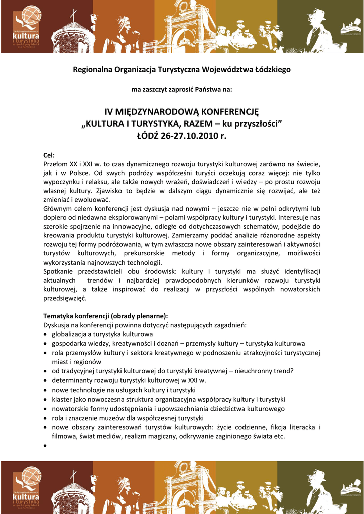 Regionalna Organizacja Turystyczna Województwa Łódzkiego ma zaszczyt zaprosid Paostwa na: IV MIĘDZYNARODOWĄ KONFERENCJĘ „KULTURA I TURYSTYKA, RAZEM – ku przyszłości” ŁÓDŹ 26-27.10.2010 r. Cel: Przełom XX i XXI w. to czas dynamicznego rozwoju turystyki kulturowej zarówno na świecie, jak i w Polsce. Od swych podróży współcześni turyści oczekują coraz więcej: nie tylko wypoczynku i relaksu, ale także nowych wrażeo, doświadczeo i wiedzy – po prostu rozwoju własnej kultury. Zjawisko to będzie w dalszym ciągu dynamicznie się rozwijad, ale też zmieniad i ewoluowad. Głównym celem konferencji jest dyskusja nad nowymi – jeszcze nie w pełni odkrytymi lub dopiero od niedawna eksplorowanymi – polami współpracy kultury i turystyki. Interesuje nas szerokie spojrzenie na innowacyjne, odległe od dotychczasowych schematów, podejście do kreowania produktu turystyki kulturowej. Zamierzamy poddad analizie różnorodne aspekty rozwoju tej formy podróżowania, w tym zwłaszcza nowe obszary zainteresowao i aktywności turystów kulturowych, prekursorskie metody i formy organizacyjne, możliwości wykorzystania najnowszych technologii. Spotkanie przedstawicieli obu środowisk: kultury i turystyki ma służyd identyfikacji aktualnych trendów i najbardziej prawdopodobnych kierunków rozwoju turystyki kulturowej, a także inspirowad do realizacji w przyszłości wspólnych nowatorskich przedsięwzięd. Tematyka konferencji (obrady plenarne): Dyskusja na konferencji powinna dotyczyd następujących zagadnieo: globalizacja a turystyka kulturowa gospodarka wiedzy, kreatywności i doznao – przemysły kultury – turystyka kulturowa rola przemysłów kultury i sektora kreatywnego w podnoszeniu atrakcyjności turystycznej miast i regionów od tradycyjnej turystyki kulturowej do turystyki kreatywnej – nieuchronny trend? determinanty rozwoju turystyki kulturowej w XXI w. nowe technologie na usługach kultury i turystyki klaster jako nowoczesna struktura organizacyjna współpracy kultury i turystyki nowatorskie formy udostępniania i upowszechniania dziedzictwa kulturowego rola i znaczenie muzeów dla współczesnej turystyki nowe obszary zainteresowao turystów kulturowych: życie codzienne, fikcja literacka i filmowa, świat mediów, realizm magiczny, odkrywanie zaginionego świata etc. znaczenie poszczególnych 3 E (Entertainment, Excitement, Education) w turystyce kulturowej przyszłości metody ułatwiania udziału w kulturze turystom niepełnosprawnym, seniorom i innym grupom osób „wykluczonych” Organizatorzy nie ograniczają jednak listy problemów – można będzie poruszyd wszelkie zagadnienia, o ile tylko będą dotyczyły przyszłości współpracy kultury i turystyki. Miejsce konferencji: Łódź, Hotel Andel’s Łódź Organizatorzy: 1. Regionalna Organizacja Turystyczna Województwa Łódzkiego Konferencja dofinansowana jest ze środków Ministerstwa Sportu i Turystyki. Planowane patronaty honorowe: 1. Minister Sportu i Turystyki 2. Prezes Polskiej Organizacji Turystycznej 3. Marszałek Województwa Łódzkiego 4. Prezydent Łodzi Partnerzy: Urząd Miasta Łodzi, Hotel Andel’s, Izba Turystyki Ziemi Łódzkiej, Polska Izba Turystyki Oddział Łódzki Patronat branżowy: Wiadomości Turystyczne Patronat medialny: TVP Łódź, Radio Łódź, Rynek Podróży, Rynek Turystyczny, Dziennik Turystyczny, Magazyn Purpose Ramowy program konferencji*: 26.10.2010 r. do 10.00 przyjazd uczestników i zakwaterowanie 10.00-11.30 powitanie 11.30-13.00 sesja I "Wyzwanie stojące przed kulturą i turystyką w XXI w." 13.00-14.00 obiad 14.00-15.30 sesja II "Nowe trendy technologiczne" 15.30-16.00 przerwa kawowa 16.00-17.30 sesja III "Dobre Praktyki" 17.30-18.30 dyskusja podsumowująca 19.30-22.00 kolacja i program wieczorny 27.10.2010 r. 8.00-9.00 śniadanie 9.00-11.30 2 warsztaty tematyczne 11.30-12.00 przerwa kawowa 12.00-14.30 2 warsztaty tematyczne 14.30-15.30 obiad *Szczegółowy Program zostanie zamieszczony po zamknięciu listy wszystkich referentów. Szczegóły dotyczące zgłoszenia znajdą Paostwo na stronie konferencyjne www.konferencja2010.rotwl.pl Szczegółowych informacji udziela sekretariat konferencji pod nr tel. tel. (+48) 42 663 77 33 lub adresem e-mail: [email protected]