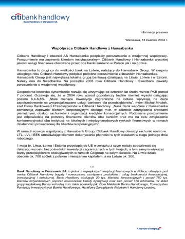 Informacja prasowa Warszawa, 13 kwietnia 2004 r. Współpraca Citibank Handlowy z Hansabanka Citibank Handlowy i łotewski AS Hansabanka podpisały porozumienie o wzajemnej współpracy. Porozumienie ma zapewnić klientom instytucjonalnym Citibank Handlowy i Hansabanka wysokiej jakości usługi finansowe oferowane przez oba banki zarówno w Polsce jak i na Łotwie. Hansabanka to drugi co do wielkości bank na Łotwie, należący do Hansabank Group. W sierpniu ubiegłego roku Citibank Handlowy podpisał podobne porozumienie z litewskim Hansabankas. Hansabank Group jest największą lokalną grupą bankową działającą na Litwie, Łotwie i w Estonii. Należy ona do Swedbanku. Na początku 2003 roku Citibank Handlowy i Swedbank zawarły porozumienie o wzajemnej współpracy. Gospodarka łotewska dynamicznie rozwija się utrzymując od czterech lat średni wzrost PKB ponad 7 procent. Oczekuje się, że w 2004 roku wzrost gopodarczy będzie również wysoki osiągając poziom 6,4-6,8%. „Stale rosnące inwestycje zagraniczne na Łotwie wpływają na duże zapotrzebowanie na wyspecjalizowane usługi bankowe dla przedsiębiorstw”, mówi Michał Mrożek, szef Pionu Bankowości Przedsiębiorstw w Citibank Handlowy. „Nasz Bank wspólnie z Hansabanka zamierzają zapewnić klientom korporacyjnym obsługę m.in. w zakresie zarządzania środkami pieniężnymi, obsługi rachunków i organizacji kredytów konsorcjalnych. Podpisane porozumienie jest odpowiedzią na potrzeby finansowe klientów obu banków oraz ma na celu zwiększenie konkurencyjności obu instytucji na lokalnych i międzynarodowych rynkach finansowych w ramach działalności prowadzonej dla klientów korporacyjnych”. W ramach rozwoju współpracy z Hansabank Group, Citibank Handlowy otworzył rachunki nostro w LTL, LVL i EEK umozliwiając klientom dokonywanie płatności w tych walutach w ciagu jednego dnia roboczego. 1 maja br. Litwa, Łotwa i Estonia przystapią do UE w związku z czym należy spodziewać się dalszego wzrostu bezpośrednich inwestycji zagranicznych w tych krajach, a tym samym większej liczby przedsiębiorstw obsługiwanych w ramach Citigroup na całym świecie. Na Litwie działa obecnie ok. 700 spółek z polskim i mieszanym kapitałem, a na Łotwie ok. 300. *** Bank Handlowy w Warszawie SA to jedna z największych instytucji finansowych w Polsce, oferująca pod marką Citibank Handlowy bogaty i nowoczesny asortyment produktów i usług bankowości korporacyjnej, inwestycyjnej i detalicznej. Bank Handlowy obsługuje 20 tys. klientów korporacyjnych i ponad 750 tys. klientów indywidualnych poprzez nowoczesne kanały dystrybucji oraz sieć ponad 160 oddziałów. W skład grupy kapitałowej Banku wchodzą m.in. takie podmioty jak: Dom Maklerski Banku Handlowego, Towarzystwo Funduszy Inwestycyjnych Banku Handlowego, Handlowy Zarządzanie Aktywami i Handlowy Leasing. Przynależność do Citigroup, największej na świecie instytucji finansowej, zapewnia klientom Banku Handlowego dostęp do usług finansowych w ponad 100 krajach. Dodatkowe informacje można uzyskać na stronie internetowej www.citibankhandlowy.pl Citigroup (NYSE:C) to największa globalna firma świadcząca usługi finansowe. Obsługuje około 200 milionów klientów indywidualnych, korporacyjnych, rządowych i instytucjonalnych w ponad 100 krajach. Zapewnia bogaty wachlarz produktów i usług finansowych, jak bankowość komercyjna i inwestycyjna, bankowość detaliczna, kredytowanie, ubezpieczenia, usługi na rynków papierów wartościowych i zarządzanie aktywami. Główne marki pod znakiem handlowym Citigroup to Citibank, CitiFinancial, Primerica, Smith Barney, Banamex i Travelers Life and Annuity. Dodatkowe informacje można uzyskać na stronie internetowej www.citigroup.com Dodatkowych informacji udziela: Krzysztof Litwinek, Biuro Public Relations, tel. (22) 657 7548