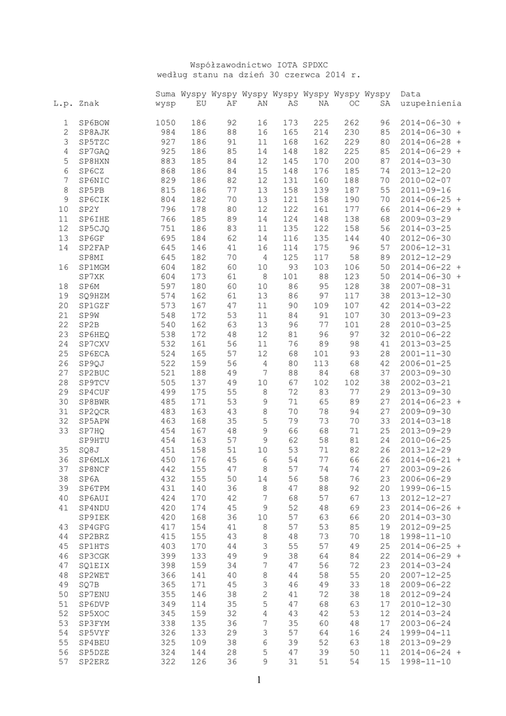 Współzawodnictwo IOTA SPDXC według stanu na dzień 30 czerwca 2014 r. L.p. Znak 1 2 3 4 5 6 7 8 9 10 11 12 13 14 16 18 19 20 21 22 23 24 25 26 27 28 29 30 31 32 33 35 36 37 38 39 40 41 43 44 45 46 47 48 49 50 51 52 53 54 55 56 57 SP6BOW SP8AJK SP5TZC SP7GAQ SP8HXN SP6CZ SP6NIC SP5PB SP6CIK SP2Y SP6IHE SP5CJQ SP6GF SP2FAP SP8MI SP1MGM SP7XK SP6M SQ9HZM SP1GZF SP9W SP2B SP6HEQ SP7CXV SP6ECA SP9QJ SP2BUC SP9TCV SP4CUF SP8BWR SP2QCR SP5APW SP7HQ SP9HTU SQ8J SP6MLX SP8NCF SP6A SP6TPM SP6AUI SP4NDU SP9IEK SP4GFG SP2BRZ SP1HTS SP3CGK SQ1EIX SP2WET SQ7B SP7ENU SP6DVP SP5XOC SP3FYM SP5VYF SP4BEU SP5DZE SP2ERZ Suma Wyspy Wyspy Wyspy Wyspy Wyspy Wyspy Wyspy wysp EU AF AN AS NA OC SA Data uzupełnienia 1050 984 927 925 883 868 829 815 804 796 766 751 695 645 645 604 604 597 574 573 548 540 538 532 524 522 521 505 499 485 483 463 454 454 451 450 442 432 431 424 420 420 417 415 403 399 398 366 365 355 349 345 338 326 325 324 322 2014-06-30 2014-06-30 2014-06-28 2014-06-29 2014-03-30 2013-12-20 2010-02-07 2011-09-16 2014-06-25 2014-06-29 2009-03-29 2014-03-25 2012-06-30 2006-12-31 2012-12-29 2014-06-22 2014-06-30 2007-08-31 2013-12-30 2014-03-22 2013-09-23 2010-03-25 2010-06-22 2013-03-25 2001-11-30 2006-01-25 2003-09-30 2002-03-21 2013-09-30 2014-06-23 2009-09-30 2014-03-18 2013-09-29 2010-06-25 2013-12-29 2014-06-21 2003-09-26 2006-06-29 1999-06-15 2012-12-27 2014-06-26 2014-03-30 2012-09-25 1998-11-10 2014-06-25 2014-06-29 2014-03-24 2007-12-25 2009-06-22 2012-09-24 2010-12-30 2014-03-24 2003-06-24 1999-04-11 2013-09-29 2014-06-24 1998-11-10 186 186 186 186 185 186 186 186 182 178 185 186 184 146 182 182 173 180 162 167 172 162 172 161 165 159 188 137 175 171 163 168 167 163 158 176 155 155 140 170 174 168 154 155 170 133 159 141 171 146 114 159 135 133 109 144 126 92 88 91 85 84 84 82 77 70 80 89 83 62 41 70 60 61 60 61 47 53 63 48 56 57 56 49 49 55 53 43 35 48 57 51 45 47 50 36 42 45 36 41 43 44 49 34 40 45 38 35 32 36 29 38 28 36 16 16 11 14 12 15 12 13 13 12 14 11 14 16 4 10 8 10 13 11 11 13 12 11 12 4 7 10 8 9 8 5 9 9 10 6 8 14 8 7 9 10 8 8 3 9 7 8 3 2 5 4 7 3 6 5 9 1 173 165 168 148 145 148 131 158 121 122 124 135 116 114 125 93 101 86 86 90 84 96 81 76 68 80 88 67 72 71 70 79 66 62 53 54 57 56 47 68 52 57 57 48 55 38 47 44 46 41 47 43 35 57 39 47 31 225 214 162 182 170 176 160 139 158 161 148 122 135 175 117 103 88 95 97 109 91 77 96 89 101 113 84 102 83 65 78 73 68 58 71 77 74 58 88 57 48 63 53 73 57 64 56 58 49 72 68 42 60 64 52 39 51 262 230 229 225 200 185 188 187 190 177 138 158 144 96 58 106 123 128 117 107 107 101 97 98 93 68 68 102 77 89 94 70 71 81 82 66 74 76 92 67 69 66 85 70 49 84 72 55 33 38 63 53 48 16 63 50 54 96 85 80 85 87 74 70 55 70 66 68 56 40 57 89 50 50 38 38 42 30 28 32 41 28 42 37 38 29 27 27 33 25 24 26 26 27 23 20 13 23 20 19 18 25 22 23 20 18 18 17 12 17 24 18 11 15 + + + + + + + + + + + + + + 58 60 61 62 63 64 65 66 67 68 69 70 71 72 73 74 75 76 77 78 79 80 SP6IXU SP6NIN SP2SCG SQ9MZ SP1DMD SP1TJ SP3OL SP4AAZ SP9XWD SP2SGN SP3WVL SQ9ACH SP6STB SQ4CUX SP2DWG SQ4CTS SP1JON SP3AAI SP6JOE SQ8LUV SP2MEF SQ9DXT SQ2TOM 320 320 308 302 296 272 260 258 249 238 232 231 212 211 209 195 187 178 172 159 151 86 69 135 137 121 130 130 166 117 143 151 157 123 62 128 137 47 124 110 119 97 87 91 55 60 1 SP1YKO 165 110 1 2 SP9-3021 SP2-0534-BY 335 194 122 123 35 11 SP2JKC SP9VFQ SP2AVE SP9AQY SP5ANQ SP7EJS SP2AHD SP2EIW SP6AOI SP2ATF 744 427 392 363 358 316 295 219 199 111 184 136 136 126 143 122 144 144 104 75 1 2 3 4 5 6 7 8 9 10 32 38 31 34 38 25 32 28 15 13 18 33 15 18 24 9 18 15 12 12 11 7 1 5 5 8 3 5 4 2 4 2 0 2 5 4 1 6 2 3 3 1 4 1 1 0 41 48 38 44 31 27 29 26 25 24 29 32 18 21 28 19 17 15 26 24 10 10 4 45 40 40 46 43 22 37 31 28 24 29 43 27 21 32 23 23 13 21 22 27 7 3 48 38 57 29 34 23 30 17 19 12 23 45 14 7 55 10 12 12 11 7 9 5 1 14 14 13 16 15 5 13 9 9 8 8 11 6 6 17 8 4 1 4 3 2 1 0 2014-06-30 + 2007-06-22 2001-12-18 2008-12-21 2003-07-15 2013-10-23 2013-03-24 2013-09-29 2007-09-26 2012-06-25 2010-06-26 2012-03-25 2001-09-14 2013-09-29 2002-05-01 2013-04-05 2006-12-11 2014-05-12 + 1999-08-20 2014-03-24 1999-05-10 2014-06-23 + 2013-03-27 Stacje klubowe 14 0 22 13 3 3 2009-06-23 SWL 10 1 27 20 66 28 61 6 14 5 2010-05-01 2007-03-24 Silent Key 65 11 127 34 4 44 36 9 51 30 7 42 41 7 39 32 7 44 28 3 27 21 1 15 17 2 17 8 1 11 159 92 70 62 52 55 52 21 33 8 147 94 68 63 59 42 34 11 19 6 51 23 22 33 17 14 7 6 7 2 2011-12-29 1998-05-10 2001-06-28 2003-12-12 2006-09-29 1999-05-21 1997-11-10 1999-12-14 2001-12-15 2000-06-30 Trwa świętowanie 50 lat istnienia programu IOTA, który jest jednym z najbardziej popularnych programów DX na świecie. Jego założycielem jest Geoff Watts. Aby uczcić tę złotą rocznicę redaktor i IOTA Manager Roger Balister-G3KMA wydał w pełni zaktualizowany przewodnik ”IOTA Directory - 50th Anniversary Edition”, który zawiera przegląd pierwszych 50 lat istnienia programu, aż do chwili obecnej. Rozbudowane poszczególne działy tej barwnej książki zawierają fascynujące artykuły, między innymi obejmujące operację IOTA na Timoteo Dominguez (SA-057) oraz informacje o zwiększonej aktywności z wysp Indonezji. Jest wiele innych szczegółowych detali dotyczących najnowszej listy Honor Roll, jest Złota Lista, program dyplomowy, a nawet opisy anten dla DX-owych IOTA ekspedycji. To wydanie zawiera wszystkie zmiany reguł i aktualizacje wysp. Jest wszystko, czego potrzeba, aby uczestniczyć w programie IOTA, z wyjaśnieniem programu, jego zasad, listy wysp pogrupowane według kontynentów, aż do formularzy wniosków i wiele informacji oraz porad dla łowców wyspiarskich. Przewodnik ten można nabyć w RSGB w cenie 11,99 £. IOTA Checkpoint dla stacji SP jest Alex - [email protected] , a to oznacza wysyłanie kart QSL do Węgier. Roger - G3KMA poinformował mnie, że jest możliwość 2 utworzenia w SP punktu weryfikacji kart QSL. Jest to jednak uzależnione od ilości zainteresowanych weryfikacją i regularną aktualizacją wyników. Trzeba ró