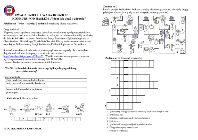 Zadanie nr 2 Pomóż przejść króliczkowi labirynt – omijaj niezdrową żywność, kieruj się drogą, gdzie jest zdrowa (staraj się zebrać wszystką zdrową żywność). UWAGA DZIECI! UWAGA RODZICE! KONKURS POD HASŁEM „Wiem jak dbać o zdrowie” Jeżeli masz 7-9 lat – rozwiąż 3 zadania i przekaż tę ulotkę rodzicowi. Drogi rodzicu! Wypełnij poniższą tabelę, dotyczącą danych uczestnika oraz zgodę przedstawiciela ustawowego dziecka na udział w konkursie, która jest na odwrocie i prześlij tę ulotkę do dnia 11.04.2014r. na adres: Powiatowa Stacja Sanitarno – Epidemiologiczna w Obornikach ul. Piłsudskiego 76, 64-600 Oborniki. Ulotkę można również dostarczyć na pokój nr 26 Powiatowej Stacji Sanitarno – Epidemiologicznej w Obornikach. Spośród prawidłowych odpowiedzi zostaną wylosowane nagrody dla uczestników. Regulamin konkursu dostępny jest na stronie internetowej: http://psseoborniki.pis.gov.pl/?dep=23 . Wyniki konkursu zostaną umieszczone na wyżej wymienionej stronie internetowej dnia 18.04.2014r. Laureaci konkursu zostaną powiadomieni telefonicznie. UWAGA! Jedno dziecko może dostarczyć tylko jedną wypełnioną przez siebie ulotkę! Dane uczestnika: Data urodzenia uczestnika konkursu Imię i nazwisko uczestnika konkursu Numer telefonu rodzica (opiekuna prawnego) Zadanie nr 1. Rozwiąż rebus *ULOTKĘ MOŻNA KOPIOWAĆ Zadanie nr 3. Rozwiąż krzyżówkę