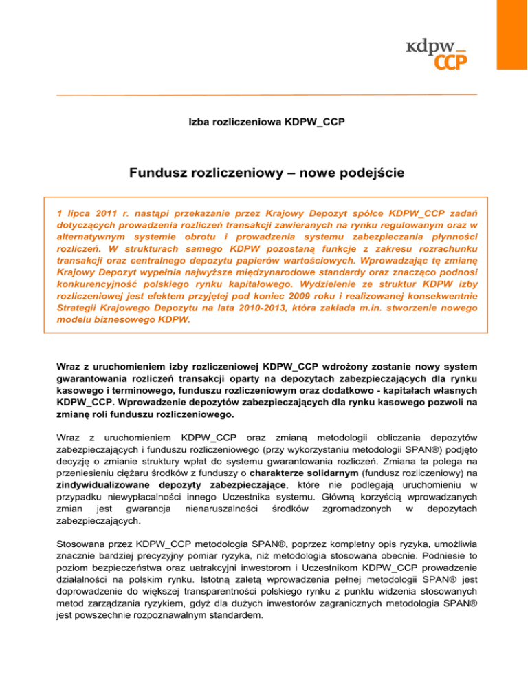 Izba rozliczeniowa KDPW_CCP Fundusz rozliczeniowy – nowe podejście 1 lipca 2011 r. nastąpi przekazanie przez Krajowy Depozyt spółce KDPW_CCP zadań dotyczących prowadzenia rozliczeń transakcji zawieranych na rynku regulowanym oraz w alternatywnym systemie obrotu i prowadzenia systemu zabezpieczania płynności rozliczeń. W strukturach samego KDPW pozostaną funkcje z zakresu rozrachunku transakcji oraz centralnego depozytu papierów wartościowych. Wprowadzając tę zmianę Krajowy Depozyt wypełnia najwyższe międzynarodowe standardy oraz znacząco podnosi konkurencyjność polskiego rynku kapitałowego. Wydzielenie ze struktur KDPW izby rozliczeniowej jest efektem przyjętej pod koniec 2009 roku i realizowanej konsekwentnie Strategii Krajowego Depozytu na lata 2010-2013, która zakłada m.in. stworzenie nowego modelu biznesowego KDPW. Wraz z uruchomieniem izby rozliczeniowej KDPW_CCP wdrożony zostanie nowy system gwarantowania rozliczeń transakcji oparty na depozytach zabezpieczających dla rynku kasowego i terminowego, funduszu rozliczeniowym oraz dodatkowo - kapitałach własnych KDPW_CCP. Wprowadzenie depozytów zabezpieczających dla rynku kasowego pozwoli na zmianę roli funduszu rozliczeniowego. Wraz z uruchomieniem KDPW_CCP oraz zmianą metodologii obliczania depozytów zabezpieczających i funduszu rozliczeniowego (przy wykorzystaniu metodologii SPAN®) podjęto decyzję o zmianie struktury wpłat do systemu gwarantowania rozliczeń. Zmiana ta polega na przeniesieniu ciężaru środków z funduszy o charakterze solidarnym (fundusz rozliczeniowy) na zindywidualizowane depozyty zabezpieczające, które nie podlegają uruchomieniu w przypadku niewypłacalności innego Uczestnika systemu. Główną korzyścią wprowadzanych zmian jest gwarancja nienaruszalności środków zgromadzonych w depozytach zabezpieczających. Stosowana przez KDPW_CCP metodologia SPAN®, poprzez kompletny opis ryzyka, umożliwia znacznie bardziej precyzyjny pomiar ryzyka, niż metodologia stosowana obecnie. Podniesie to poziom bezpieczeństwa oraz uatrakcyjni inwestorom i Uczestnikom KDPW_CCP prowadzenie działalności na polskim rynku. Istotną zaletą wprowadzenia pełnej metodologii SPAN® jest doprowadzenie do większej transparentności polskiego rynku z punktu widzenia stosowanych metod zarządzania ryzykiem, gdyż dla dużych inwestorów zagranicznych metodologia SPAN® jest powszechnie rozpoznawalnym standardem. Jak będzie obliczana wielkość funduszu rozliczeniowego Do tej pory, ze względu na brak depozytów zabezpieczających dla rynku kasowego, to właśnie fundusz rozliczeniowy gromadził „pierwsze” zasoby, które mogłyby zostać wykorzystane solidarnie w przypadku niewypłacalności Uczestnika rozliczającego. Wraz z uruchomieniem KDPW_CCP depozyty zabezpieczające będą głównym elementem systemu gwarantowania rozliczeń. Ich wartość dla każdego Uczestnika izby rozliczeniowej będzie liczona indywidualnie w oparciu o metodologię SPAN® przy założeniu normalnych – standardowych – warunków rynkowych. W przypadku ekstremalnych, jednak możliwych do zaistnienia na rynku zmian, wartość środków zgromadzonych w depozytach zabezpieczających może okazać się jednak niewystarczająca. To dodatkowe ryzyko, określane jako tzw. ryzyko niepokryte, będzie zabezpieczone środkami zgromadzonymi w funduszu rozliczeniowym. Pomiar ryzyka niepokrytego polega na obliczeniu różnicy pomiędzy wartością wymaganych depozytów zabezpieczających w warunkach ekstremalnych (wyrażających się dużą zmianą poziomu cen instrumentów finansowych), a wielkością tych depozytów obliczonych przy standardowych warunkach rynkowych. Przy wprowadzeniu takiej konstrukcji fundusz rozliczeniowy zabezpiecza wyłącznie to ryzyko, które nie jest zabezpieczone wniesionymi przez Uczestników depozytami zabezpieczającymi wraz z wyrównaniem do rynku. Rys. 1. Mechanizm obliczania funduszu rozliczeniowego w oparciu o koncepcję ryzyka niepokrytego Wartość FR UR – uczestnik rozliczający RN – ryzyko niepokryte FR – fundusz rozliczeniowy DZ – depozyt zabezpieczający FR=RN2 Wartość środków zgromadzonych w funduszu rozliczeniowym równa jest wartości najwyższego ryzyka niepokrytego generowanego przez Uczestnika rozliczającego, wyliczonego jako różnica pomiędzy depozytami naliczonymi wg parametrów ekstremalnych i parametrów normalnych. 2 Fundusz rozliczeniowy – najważniejsze zmiany Fundusz rozliczeniowy będzie obejmował wszystkie rynki rozliczane przez KDPW_CCP i nie będzie dzielony na funkcjonalnie wyodrębnione części (obecnie odrębny dla rynku terminowego, kasowego). Podobnie jak w przypadku depozytów zabezpieczających będzie on obliczany przy użyciu metodologii SPAN® na bazie otwartych pozycji z rynku terminowego oraz nierozliczonych transakcji z rynku kasowego (przy użyciu stress-testowego zestawu parametrów z uwzględnieniem potencjalnej niewypłacalności uczestnika o największej ekspozycji). Zmniejszy się częstotliwości dokonywania wpłat do funduszu - do jednej w miesiącu (wartość funduszu będzie jednak obliczana codziennie). Wyjątkiem będzie wniesienie depozytu dodatkowego przez uczestnika na żądanie, w sytuacji kiedy jego ryzyko niepokryte przekroczy wartość Funduszu. Prowadzone będzie kompensowanie zobowiązań i należności uczestników z tytułu regulacji wpłat do funduszu rozliczeniowego z ich zobowiązaniami i należnościami z tytułu regulacji wpłat do funduszy zabezpieczających ASO oraz z tytułu właściwych depozytów zabezpieczających i bieżących rozliczeń. *************** 3