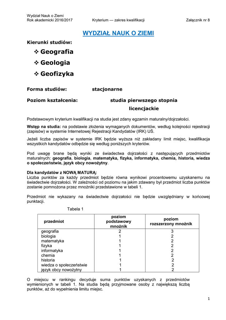 Wydział Nauk o Ziemi Rok akademicki 2016/2017 Kryterium — zakres kwalifikacji Załącznik nr 8 WYDZIAŁ NAUK O ZIEMI Kierunki studiów: Geografia Geologia Geofizyka Forma studiów: stacjonarne Poziom kształcenia: studia pierwszego stopnia licencjackie Podstawowym kryterium kwalifikacji na studia jest zdany egzamin maturalny/dojrzałości. Wstęp na studia: na podstawie złożenia wymaganych dokumentów, według kolejności rejestracji (zapisów) w systemie Internetowej Rejestracji Kandydatów (IRK) UŚ. Jeżeli liczba zapisów w systemie IRK będzie wyższa niż zakładany limit miejsc, kwalifikacja wszystkich kandydatów odbędzie się według poniższych kryteriów. Pod uwagę brane będą wyniki ze świadectwa dojrzałości z następujących przedmiotów maturalnych: geografia, biologia, matematyka, fizyka, informatyka, chemia, historia, wiedza o społeczeństwie, język obcy nowożytny. Dla kandydatów z NOWĄ MATURĄ: Liczba punktów za każdy przedmiot będzie równa wynikowi procentowemu uzyskanemu na świadectwie dojrzałości. W zależności od poziomu na jakim zdawany był przedmiot liczba punktów zostanie pomnożona przez mnożniki przedstawione w tabeli 1. Przedmiot nie wykazany na świadectwie dojrzałości nie będzie uwzględniany w końcowej punktacji. Tabela 1 przedmiot geografia biologia matematyka fizyka informatyka chemia historia wiedza o społeczeństwie język obcy nowożytny poziom podstawowy mnożnik 2 1 1 1 1 1 1 1 1 poziom rozszerzony mnożnik 3 2 2 2 2 2 2 2 2 O miejscu w rankingu decyduje suma punktów uzyskanych z przedmiotów wymienionych w tabeli 1. Na studia będą przyjmowane osoby z największą liczbą punktów, aż do wypełnienia limitu miejsc. 1 Wydział Nauk o Ziemi Rok akademicki 2016/2017 Kryterium — zakres kwalifikacji Załącznik nr 8 Dla kandydatów ze STARĄ MATURĄ: Oceny ze świadectwa dojrzałości zostaną przeliczone na punkty według tabeli 2. Dalszy tryb kwalifikacji będzie prowadzony tak jak dla kandydatów z Nową Maturą. Przedmioty maturalne będą traktowane jako zdane na poziomie rozszerzonym. Tabela 2 Matura do 1991 roku Matura po 1991 roku 6 — 100 % 5 — 100 % 5 — 80 % 4 — 70 % 4 — 75 % 3 — 30 % 3 — 50 % 2 — 30 % Kandydat na studia zobowiązany jest złożyć odpowiednie Zaświadczenie lekarskie o braku przeciwwskazań zdrowotnych do podjęcia studiów na tym kierunku. 2 Wydział Nauk o Ziemi Rok akademicki 2016/2017 Kryterium — zakres kwalifikacji Załącznik nr 8 Kierunek studiów: Geologia stosowana Inżynieria zagrożeń środowiskowych Forma studiów: stacjonarne Poziom kształcenia: studia pierwszego stopnia inżynierskie Podstawowym kryterium kwalifikacji na studia jest zdany egzamin maturalny/dojrzałości. Wstęp na studia: na podstawie złożenia wymaganych dokumentów, według kolejności rejestracji (zapisów) w systemie Internetowej Rejestracji Kandydatów (IRK) UŚ. Jeżeli liczba zapisów w systemie IRK będzie wyższa niż zakładany limit miejsc, kwalifikacja wszystkich kandydatów odbędzie się według poniższych kryteriów. Pod uwagę brane będą wyniki ze świadectwa dojrzałości z następujących przedmiotów maturalnych: geografia, biologia, matematyka, fizyka, informatyka, chemia, historia, wiedza o społeczeństwie, język obcy nowożytny. Dla kandydatów z NOWĄ MATURĄ: Liczba punktów za każdy przedmiot będzie równa wynikowi procentowemu uzyskanemu na świadectwie dojrzałości. W zależności od poziomu na jakim zdawany był przedmiot liczba punktów zostanie pomnożona przez mnożniki przedstawione w tabeli 1. Przedmiot nie wykazany na świadectwie dojrzałości nie będzie uwzględniany w końcowej punktacji. Tabela 1 przedmiot geografia biologia matematyka fizyka informatyka chemia historia wiedza o społeczeństwie język obcy nowożytny poziom podstawowy mnożnik 2 1 1 1 1 1 1 1 1 poziom rozszerzony mnożnik 3 2 2 2 2 2 2 2 2 O miejscu w rankingu decyduje suma punktów uzyskanych z przedmiotów wymienionych w tabeli 1. Na studia będą przyjmowane osoby z największą liczbą punktów, aż do wypełnienia limitu miejsc. 3 Wydział Nauk o Ziemi Rok akademicki 2016/2017 Kryterium — zakres kwalifikacji Załącznik nr 8 Dla kandydatów ze STARĄ MATURĄ: Oceny ze świadectwa dojrzałości zostaną przeliczone na punkty według tabeli 2. Dalszy tryb kwalifikacji będzie prowadzony tak jak dla kandydatów z Nową Maturą. Przedmioty maturalne będą traktowane jako zdane na poziomie rozszerzonym. Tabela 2 Matura do 1991 roku Matura po 1991 roku 6 — 100 % 5 — 100 % 5 — 80 % 4 — 70 % 4 — 75 % 3 — 30 % 3 — 50 % 2 — 30 % Kandydat na studia zobowiązany jest złożyć odpowiednie Zaświadczenie lekarskie o braku przeciwwskazań zdrowotnych do podjęcia studiów na tym kierunku. 4 Wydział Nauk o Ziemi Rok akademicki 2016/2017 Kryterium — zakres kwalifikacji Załącznik nr 8 Kierunek studiów: Geografia Forma studiów: Poziom kształcenia: stacjonarne oraz niestacjonarne studia drugiego stopnia O przyjęcie na studia mogą się ubiegać osoby posiadające dyplom ukończenia studiów z tytułem licencjata, inżyniera lub magistra w zakresie geografii lub dyscyplin pokrewnych. Kandydat ubiegający się o przyjęcie posiada wiedzę, umiejętności oraz kompetencje społeczne niezbędne do podjęcia kształcenia na studiach II stopnia na tym kierunku, a w szczególności: • rozumie podstawowe zjawiska i procesy przyrodnicze; • ma podstawową wiedzę o miejscu i znaczeniu nauk przyrodniczych w systemie nauk oraz ich specyfice przedmiotowej i metodologicznej; • ma uporządkowaną wiedzę ogólną, obejmującą terminologię, teorie i metodologię z zakresu dziedzin nauki i dyscyplin naukowych; • potrafi wyszukiwać, analizować, oceniać, selekcjonować i użytkować informację z wykorzystaniem różnych źródeł i sposobów; • posiada podstawowe umiejętności badawcze, obejmujące formułowanie i analizę problemów badawczych, dobór metod i narz