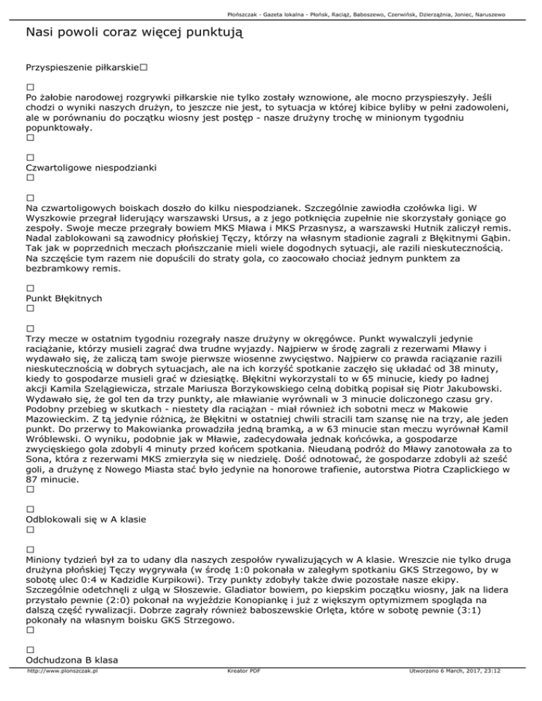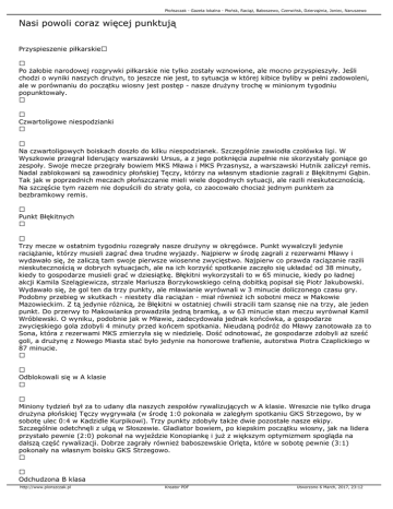 Płońszczak - Gazeta lokalna - Płońsk, Raciąż, Baboszewo, Czerwińsk, Dzierzążnia, Joniec, Naruszewo Nasi powoli coraz więcej punktują Przyspieszenie piłkarskie Po żałobie narodowej rozgrywki piłkarskie nie tylko zostały wznowione, ale mocno przyspieszyły. Jeśli chodzi o wyniki naszych drużyn, to jeszcze nie jest, to sytuacja w której kibice byliby w pełni zadowoleni, ale w porównaniu do początku wiosny jest postęp - nasze drużyny trochę w minionym tygodniu popunktowały. Czwartoligowe niespodzianki Na czwartoligowych boiskach doszło do kilku niespodzianek. Szczególnie zawiodła czołówka ligi. W Wyszkowie przegrał liderujący warszawski Ursus, a z jego potknięcia zupełnie nie skorzystały goniące go zespoły. Swoje mecze przegrały bowiem MKS Mława i MKS Przasnysz, a warszawski Hutnik zaliczył remis. Nadal zablokowani są zawodnicy płońskiej Tęczy, którzy na własnym stadionie zagrali z Błękitnymi Gąbin. Tak jak w poprzednich meczach płońszczanie mieli wiele dogodnych sytuacji, ale razili nieskutecznością. Na szczęście tym razem nie dopuścili do straty gola, co zaocowało chociaż jednym punktem za bezbramkowy remis. Punkt Błękitnych Trzy mecze w ostatnim tygodniu rozegrały nasze drużyny w okręgówce. Punkt wywalczyli jedynie raciążanie, którzy musieli zagrać dwa trudne wyjazdy. Najpierw w środę zagrali z rezerwami Mławy i wydawało się, że zaliczą tam swoje pierwsze wiosenne zwycięstwo. Najpierw co prawda raciązanie razili nieskutecznością w dobrych sytuacjach, ale na ich korzyść spotkanie zaczęło się układać od 38 minuty, kiedy to gospodarze musieli grać w dziesiątkę. Błękitni wykorzystali to w 65 minucie, kiedy po ładnej akcji Kamila Szelągiewicza, strzale Mariusza Borzykowskiego celną dobitką popisał się Piotr Jakubowski. Wydawało się, że gol ten da trzy punkty, ale mławianie wyrównali w 3 minucie doliczonego czasu gry. Podobny przebieg w skutkach - niestety dla raciążan - miał również ich sobotni mecz w Makowie Mazowieckim. Z tą jedynie różnicą, że Błękitni w ostatniej chwili stracili tam szansę nie na trzy, ale jeden punkt. Do przerwy to Makowianka prowadziła jedną bramką, a w 63 minucie stan meczu wyrównał Kamil Wróblewski. O wyniku, podobnie jak w Mławie, zadecydowała jednak końcówka, a gospodarze zwycięskiego gola zdobyli 4 minuty przed końcem spotkania. Nieudaną podróż do Mławy zanotowała za to Sona, która z rezerwami MKS zmierzyła się w niedzielę. Dość odnotować, że gospodarze zdobyli aż sześć goli, a drużynę z Nowego Miasta stać było jedynie na honorowe trafienie, autorstwa Piotra Czaplickiego w 87 minucie. Odblokowali się w A klasie Miniony tydzień był za to udany dla naszych zespołów rywalizujących w A klasie. Wreszcie nie tylko druga drużyna płońskiej Tęczy wygrywała (w środę 1:0 pokonała w zaległym spotkaniu GKS Strzegowo, by w sobotę ulec 0:4 w Kadzidle Kurpikowi). Trzy punkty zdobyły także dwie pozostałe nasze ekipy. Szczególnie odetchnęli z ulgą w Słoszewie. Gladiator bowiem, po kiepskim początku wiosny, jak na lidera przystało pewnie (2:0) pokonał na wyjeździe Konopiankę i już z większym optymizmem spogląda na dalszą część rywalizacji. Dobrze zagrały również baboszewskie Orlęta, które w sobotę pewnie (3:1) pokonały na własnym boisku GKS Strzegowo. Odchudzona B klasa http://www.plonszczak.pl Kreator PDF Utworzono 6 March, 2017, 23:12 Płońszczak - Gazeta lokalna - Płońsk, Raciąż, Baboszewo, Czerwińsk, Dzierzążnia, Joniec, Naruszewo Wiosnę zainaugurowała wreszcie B klasa, choć jej rozgrywki mocno straciły na atrakcyjności. A to z powodu wycofania się aż trzech drużyn (MKS II Ciechanów, GKS Gumino i Wiślanie Czerwińsk) planowane mecze z ich udziałem będą się kończyć walkowerami dla rywali. W pierwszej kolejce dwa nasze zespoły zaprezentowały się nieźle: Jutrzenka Unieck wysoko (5:1) pokonała GKS Pokrzywnicę, a Wkra Sochocin 3:3 zremisowała z Gryfem Kownaty Żędowe. Łukasz Majkowski, Krzysztof Lewandowski, Artur Kołodziejczyk foto: Artur Kołodziejczyk Więcej zdjęć w Galerii IV LIGA 24.04. Tęcza 34 Płońsk - Błękitni Gąbin 0:0 Tęcza: Konrad Topolewski - Damian Makowski, Wojciech Bluszcz, Robert Jadczak, Szymon Piekarzewski, Emil Kuciński, Marcin Bogucki (84, Michał Bogucki), Marcin Konopka, Michał Kłodowski, Łukasz Barankiewicz, Krzysztof Dzięgielewski (69, Hubert Szczeczko). Pozostałe wyniki XXII kolejki (24-25.04.): * Victoria Sulejówek - Przyszłość Włochy Warszawa 2:0 * Okęcie Warszawa - Kryształ Glinojeck 0:0 * MKS Przasnysz - Wkra Żuromin 0:2 * Podlasie Sokołów Podlaski - MKS Mława 3:2 * Hutnik Warszawa - Huragan Wołomin 3:3 * Bug Wyszków - Ursus Warszawa 1:0 * MKS Ciechanów - wolny termin (walkower za mecz z Jutrzenką). W XXIII kolejce (sob.-niedz. 1-2.05.) zagrają: * Bug Wyszków - Victoria Sulejówek * Ursus Warszawa Hutnik Warszawa * Huragan Wołomin - Podlasie Sokołów Podlaski * MKS Mława - MKS Przasnysz * Wkra Żuromin - Okęcie Warszawa * Kryształ Glinojeck - Tęcza 34 Płońsk (Glinojeck, sobota 1.05., g. 11) * Błękitni Gąbin - MKS Ciechanów * Przyszłość Włochy Warszawa - wolny termin (walkower za mecz z Jutrzenką). W XX (odwołanej w trakcie żałoby) kolejce (środa 5.05., wszystkie mecze o g. 17) zagrają: * Victoria Sulejówek - MKS Ciechanów * Tęcza 34 Płońsk - Przyszłość Włochy Warszawa * MKS Przasnysz - Błękitni Gąbin * Podlasie Sokołów Podlaski - Kryształ Glinojeck * Hutnik Warszawa - Wkra Żuromin * Bug Wyszków - MKS Mława * Ursus Warszawa - Huragan Wołomin * Okęcie Warszawa - wolny termin (walkower za mecz z Jutrzenką). Tabela LIGA OKRĘGOWA http://www.plonszczak.pl Kreator PDF Utworzono 6 March, 2017, 23:12 Płońszczak - Gazeta lokalna - Płońsk, Raciąż, Baboszewo, Czerwińsk, Dzierzążnia, Joniec, Naruszewo 21.04. MKS II Mława - Błękitni Raciąż 1:1 (0:0) bramka: Jak