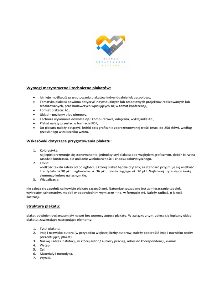 Wymogi merytoryczne i techniczne plakatów: Istnieje możliwośd przygotowania plakatów indywidualnie lub zespołowo, Tematyka plakatu powinna dotyczyd indywidualnych lub zespołowych projektów realizowanych lub zrealizowanych, prac badawczych wpisujących się w temat konferencji, Format plakatu: A1, Układ – poziomy albo pionowy, Technika wykonania dowolna np.: komputerowa, odręczna, wyklejanka itd., Plakat należy przesład w formacie PDF, Do plakatu należy dołączyd, krótki opis graficznie zaprezentowanej treści (max. do 250 słów), według przesłanego w załączniku wzoru. Wskazówki dotyczące przygotowania plakatu: 1. 2. 3. Kolorystyka: najlepiej prezentuje się stonowane tło, jednolity styl plakatu pod względem graficznym, dobór barw na zasadzie kontrastu, ale unikanie wielobarwności i chaosu kolorystycznego. Tekst: wielkośd tekstu zależy od odległości, z której plakat będzie czytany; za standard przyjmuje się wielkośd liter tytułu ok.90 pkt. nagłówków ok. 36 pkt., tekstu ciągłego ok. 20 pkt. Najłatwiej czyta się czcionkę ciemnego koloru na jasnym tle. Wizualizacja: nie zaleca się zapełnid całkowicie plakatu szczegółami. Natomiast pożądane jest zamieszczanie tabelek, wykresów, schematów, modeli w odpowiednim wymiarze – np. w formacie A4. Należy zadbad, o jakośd ilustracji. Struktura plakatu: plakat powinien byd zrozumiały nawet bez pomocy autora plakatu. W związku z tym, zaleca się logiczny układ plakatu, zawierający następujące elementy: 1. 2. 3. 4. 5. 6. 7. Tytuł plakatu. Imię i nazwisko autora (w przypadku większej liczby autorów, należy podkreślid imię i nazwisko osoby prezentującej plakat). Nazwę i adres instytucji, w której autor / autorzy pracują, adres do korespondencji, e-mail. Wstęp. Cel. Materiały i metodyka. Wyniki. 8. 9. Wnioski. Literatura (ewentualnie). Kalendarium: Do 15.11 – nadsyłanie plakatów w formacie PDF wraz z krótkim opisem na adres: [email protected] Do 17.11 – Autorzy nadesłanych plakatów zostaną poinformowani o decyzji organizatorów konferencji. W przypadku znaczącej liczby chętnych, organizatorzy konferencji wybiorą 10 plakatów, które zostaną wydrukowane na koszt organizatora. Autorzy pozostałych plakatów, które nie zostaną wybrane przez organizatorów konferencji, zostaną o tym fakcie poinformowani. Wówczas mogą samodzielnie wydrukowad swoją pracę i dołączyd do sesji plakatowej. Założenia sesji plakatowej: http://pl.wikipedia.org/wiki/Sesja_posterowa Mamy nadzieję, że nadesłane przez Paostwa plakaty staną się dodatkową inspiracją do dyskusji!