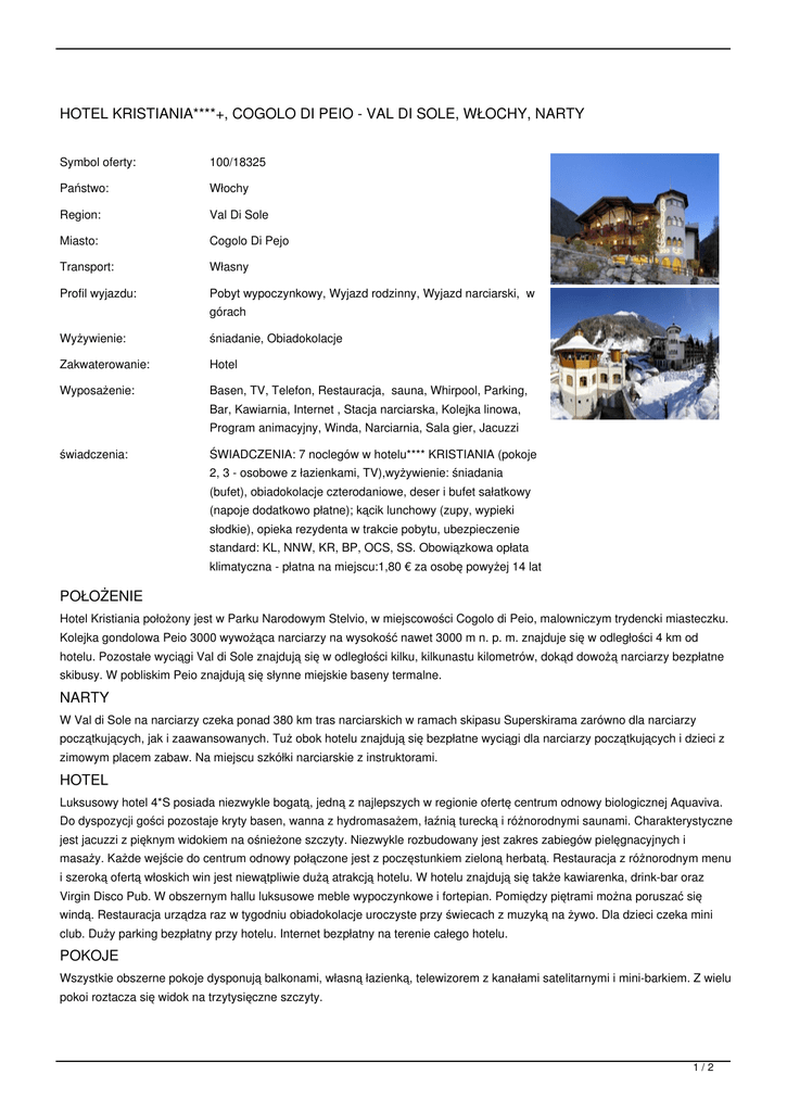 HOTEL KRISTIANIA****+, COGOLO DI PEIO - VAL DI SOLE, WŁOCHY, NARTY Symbol oferty: 100/18325 Państwo: Włochy Region: Val Di Sole Miasto: Cogolo Di Pejo Transport: Własny Profil wyjazdu: Pobyt wypoczynkowy, Wyjazd rodzinny, Wyjazd narciarski, w Wyżywienie: śniadanie, Obiadokolacje Zakwaterowanie: Hotel Wyposażenie: Basen, TV, Telefon, Restauracja, sauna, Whirpool, Parking, górach Bar, Kawiarnia, Internet , Stacja narciarska, Kolejka linowa, Program animacyjny, Winda, Narciarnia, Sala gier, Jacuzzi świadczenia: ŚWIADCZENIA: 7 noclegów w hotelu**** KRISTIANIA (pokoje 2, 3 - osobowe z łazienkami, TV),wyżywienie: śniadania (bufet), obiadokolacje czterodaniowe, deser i bufet sałatkowy (napoje dodatkowo płatne); kącik lunchowy (zupy, wypieki słodkie), opieka rezydenta w trakcie pobytu, ubezpieczenie standard: KL, NNW, KR, BP, OCS, SS. Obowiązkowa opłata klimatyczna - płatna na miejscu:1,80 € za osobę powyżej 14 lat POŁOŻENIE Hotel Kristiania położony jest w Parku Narodowym Stelvio, w miejscowości Cogolo di Peio, malowniczym trydencki miasteczku. Kolejka gondolowa Peio 3000 wywożąca narciarzy na wysokość nawet 3000 m n. p. m. znajduje się w odległości 4 km od hotelu. Pozostałe wyciągi Val di Sole znajdują się w odległości kilku, kilkunastu kilometrów, dokąd dowożą narciarzy bezpłatne skibusy. W pobliskim Peio znajdują się słynne miejskie baseny termalne. NARTY W Val di Sole na narciarzy czeka ponad 380 km tras narciarskich w ramach skipasu Superskirama zarówno dla narciarzy początkujących, jak i zaawansowanych. Tuż obok hotelu znajdują się bezpłatne wyciągi dla narciarzy początkujących i dzieci z zimowym placem zabaw. Na miejscu szkółki narciarskie z instruktorami. HOTEL Luksusowy hotel 4*S posiada niezwykle bogatą, jedną z najlepszych w regionie ofertę centrum odnowy biologicznej Aquaviva. Do dyspozycji gości pozostaje kryty basen, wanna z hydromasażem, łaźnią turecką i różnorodnymi saunami. Charakterystyczne jest jacuzzi z pięknym widokiem na ośnieżone szczyty. Niezwykle rozbudowany jest zakres zabiegów pielęgnacyjnych i masaży. Każde wejście do centrum odnowy połączone jest z poczęstunkiem zieloną herbatą. Restauracja z różnorodnym menu i szeroką ofertą włoskich win jest niewątpliwie dużą atrakcją hotelu. W hotelu znajdują się także kawiarenka, drink-bar oraz Virgin Disco Pub. W obszernym hallu luksusowe meble wypoczynkowe i fortepian. Pomiędzy piętrami można poruszać się windą. Restauracja urządza raz w tygodniu obiadokolacje uroczyste przy świecach z muzyką na żywo. Dla dzieci czeka mini club. Duży parking bezpłatny przy hotelu. Internet bezpłatny na terenie całego hotelu. POKOJE Wszystkie obszerne pokoje dysponują balkonami, własną łazienką, telewizorem z kanałami satelitarnymi i mini-barkiem. Z wielu pokoi roztacza się widok na trzytysięczne szczyty. 1/2 Charakterystyka pokoi Pokój typu Rugiada - powierzchnia 18-24m2. Wszystkie pokoje tego typu umieszczone są w bardzo dobrze nasłonecznionym miejscu. Posiadają piękne widoki oraz TV. WYŻYWIENIE - śniadania kontynentalne w formie bufetu - unch (zupy, wypieki słodkie) - obiadokolacje oparte o czterodaniowe menu kuchni włoskiej i międzynarodowej oraz bufet sałatkowy z ciepłymi i zimnymi warzywami, dostępne także dania wegetariańskie i dania dla dzieci; napoje dodatkowo płatne, bogata enoteka. NASZA OCENA Hotel polecany jest przez nas dla bardzo wymagających klientów, także dla tych, którzy nie spędzają całego dnia na stokach narciarskich. Oferta apres ski zadowoli każdego gościa. Hotel dla amatorów dobrej kuchni. W rankingach uważany za jeden z najlepszych w Val di Sole. UBEZPIECZENIE: TUiA AXA S.A. KL wraz z assistance - 10.000 €, KR - koszty ratownictwa - 5.000 €, NNW -następstw nieszczęśliwych wypadków - 2.000 €, BP - bagaż - 200 €, OCS - odpowiedzialność cywilna związana z uprawianiem sportów 10.000 €, SS - sprzęt sportowy- 700 €. TERMINY: od: 2017-03-11 do: 2017-03-18 (8 dni), miejsca: sprawdź miejsca cena od: 2460 PLN = 559 EUR od: 2017-03-18 do: 2017-03-25 (8 dni), miejsca: sprawdź miejsca cena od: 2460 PLN = 559 EUR od: 2017-03-25 do: 2017-04-01 (8 dni), miejsca: sprawdź miejsca cena od: 2900 PLN = 659 EUR dodatkowe informacje/uwagi: Skipass w cenie od: 2017-04-01 do: 2017-04-08 (8 dni), miejsca: sprawdź miejsca cena od: 2900 PLN = 659 EUR dodatkowe informacje/uwagi: Skipass w cenie CENNIK: Długość pobytu: 8 dni 8 dni Grupa cenowa: A D (-) (-) Ubezpieczenie (obligatoryjne) (*) NNW+KL+bagaż Pobyt w obiekcie (do wyboru) TWN pokój 2 osobowy z dwoma pojedynczymi łóżkami standardowo dla osób: 2 1118 (*) Pokój dwuosobowy z łóżkiem małżeńskim standardowo dla osób: 2 1118 Ubezpieczenie (opcjonalne) ubezp. KR 3% 1318 1318 3% Waluta: EUR Aktualne ceny z systemu S.A.R.T. (-) - cena usługi, podatku kalkulowana przy osobie lub gratis (*) - kwota wliczona w cenę standardową 2/2