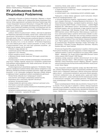 Jerzy Kicki – Przewodniczący Komitetu Organizacyjnego Szkoły Eksploatacji Podziemnej XV Jubileuszowa Szkoła Eksploatacji Podziemnej Tradycyjnie w Szczyrku w Centrum Kongresów i Rekreacji, w dniach 20-24 luty 2006 r. odbyła się XV Jubileuszowa Szkoła Eksploatacji Podziemnej, której organizatorami są Katedra Górnictwa Podziemnego AGH i Instytut Gospodarki Surowcami Mineralnymi i Energią PAN. Szkoła, jak przystało na Jubileusz, zgromadziła rekordową liczbę ponad 450 uczestników i znowu zaskoczeni zostaliśmy ich liczbą, co przysporzyło nam niemałych kłopotów, a największa z sal Centrum Kongresów i Rekreacji z trudem mieściła uczestników. Jubileusz skłania do podsumowań i refleksji. Jakie było te piętnaście lat? Najkrótsza odpowiedź brzmiałaby: bardzo różne. Jednak jest to duże uproszczenie. Zaczynaliśmy w czasach trudnych dla górnictwa, kiedy byliśmy pełni obaw i trosk. Dzisiaj pracujemy spokojniej zgodnie z maksymą Marii Skłodowskiej Curie, iż „człowiek nigdy nie ogląda się na to, co zrobione, ale patrzy na to, co ma do zrobienia”. W Komitecie Organizacyjnym coraz większe grono osób z nowymi pomysłami, to cieszy. A skoro o podsumowaniach mowa, jak mówi stare żydowskie przysłowie, „pochwalić się nie wypada, ale nie zaszkodzi”. W Szkole w ciągu piętnastu lat: – uczestniczyło ponad 4700 osób (niektórzy wielokrotnie), – wygłoszono 1231 referatów, – drukiem wydaliśmy ponad 13 000 stron, – w Bibliotece Szkoły ukazało się ponad 100 książek, poradników i podręczników. W towarzyszącym od kilku lat Szkole przedsięwzięciu International Mining Forum, którego materiały ukazują się w londyńskim wydawnictwie Francis&Taylor (dawniej Balkema AA), wzięło udział ponad 140 osób, drukiem ukazały się 102 referaty. W trakcie tegorocznych obrad Szkoły wygłoszono 118 referatów. Niewątpliwie do największych wydarzeń Szkoły należy zaliczyć wystąpienia w sesji plenarnej, poświęcone tematyce przyszłości górnictwa i węgla, jako paliwa przyszłości, w tym interesujące wystąpienia dotyczące strategii działania w najbliższych latach największych polskich przedsiębiorstw górniczych. Obrady Szkoły odbywały się w następujących sesjach; – nowe techniki i technologie w eksploatacji podziemnej złóż, – eksploatacja złóż w warunkach zagrożeń naturalnych, – wentylacja i klimatyzacja kopalń, – strategia działalności górniczej wobec zmiennych zachowań rynku, – informatyka w przemyśle wydobywczym, – teoretyczne i praktyczne aspekty oddziaływania eksploatacji górniczej na powierzchnię, – zarządzanie bezpieczeństwem pracy w kopalniach, – człowiek i środowisko – wyzwania XXI wieku . Uczestnicy Szkoły wzięli udział w dwóch wyjazdach prezentujących rozwiązania techniczne w kopalniach: – w kopalni Borynia zapoznali się z nowymi rozwiązaniami w zakresie klimatyzacji wyrobisk, – w czeskiej kopalni Lazy z eksploatacją cienkich pokładów węgla. Tradycyjnie w trakcie Szkoły ogłoszono wyniki konkursów, których Szkoła jest współorganizatorem. I tak: – w konkursie Bezpieczna Kopalnia, organizowanym wspólnie z Wyższym Urzędem Górniczym i Fundacją Bezpieczne Górnictwo im. Profesora Wacława Cybulskiego, zwyciężyła kopalnia Jankowice, drugie miejsce przyznano KWK Pniówek, a trzecie exequo – Lubelski Węgiel Bogdanka SA i KWK Bobrek Centrum. Wyróżnieniami uhonorowano pozostałe kopalnie, które nie odnotowały w ciągu ostatnich trzech lat wypadku śmiertelnego: KWK Bolesław Śmiały, KWK Szczygłowice, KWK Kazimierz Juliusz, KWK Krupiński. Wiele wskazuje, iż wyniki konkursu wykorzystane będą w systemie różnicowania składek na ubezpieczenie wypadkowe. Aprobując ostre wymogi rywalizacji konkursu pomoc w takim uhonorowaniu zwycięzców zadeklarowali przedstawiciele Państwowej Inspekcji Pracy oraz Zakładu Ubezpieczeń Społecznych. Piękne dyplomy wręczali w imieniu Wielkiej Kapituły Konkursu: jej przewodniczący Wiceprezes Wyższego Urzędu Górniczego Jan Szczerbiński i Prezydent Fundacji Bezpieczne Górnictwo, Naczelny Dyrektor GIG prof. Józef Dubiński. W konkursie Kopalnia Roku organizowanym wspólnie z Górniczą Izbą Przemysłowo-Handlową, który jest rozgrywany w dwóch kategoriach: – najlepsza kopalnia, w którym zwyciężyła po raz siódmy KWK Lubelski Węgiel – „Bogdanka” SA; drugie miejsce zajęła KWK Ziemowit; trzecie miesce exequo KWK Pniówek i KWK Staszic. – największy postęp (poprawa wyników ekonomicznych rok do roku) zwyciężyły: pierwsze miejsce – KWK Jankowice; drugie miejsce – KWK Halemba; trzecie Południowy Koncern Węglowy. Statuetki i dyplomy wręczał przewodniczący Komisji Konkursowej JM Rektor naszej Uczelni prof. Antoni Tajduś. Całą uroczystość uświetnił wspaniały występ Jazz Band Ball Orchestra, orkiestry Reprezentacyjnej AGH i amerykańskiej wokalistki jazzowej Harriet Lewis w nietypowym repertuarze. Wieczór konkursowy zakończył piękny akcent – uhonorowanie wieloletnich sponsorów Szkoły specjalnymi formami rzeźbiarskimi oraz, jak napisała jedna z gazet pod hasłem „Szkoła w stylu techno”, pokaz możliwości techniki laserowej jako symbolu nowoczesnych rozwiązań, jakimi podąża górnictwo. Pokaz promował nowe przedsięwzięcie Szkoły – czasopismo elektroniczne NOW-E-Górnictwo. Nowym przedsięwzięciem Szkoły stały się szkolenia. Duszą ich był Artur Dyczko. W tym roku były to szkolenia z zakresu obsługi programów informatycznych (SURPAC i AutoCAD) oraz warsztaty antystresowe. Dwa pierwsze zorganizowane przy dużej pomocy absolwentów Wydziału Górnictwa i Geoinżynierii – panów: Gilberta Kalondijego – przedstawiciela fot. Jacek Jarosz Laureaci i organizatorzy konkursu Kopalnia Roku BIP 151 – marzec 2006 r. 9 dr Maria Korzec – Kierownik Ośrodka Historii Techniki z Muzeum fot. Jacek Jarosz Wykład prof. Ryszarda Tadeusiewicza w Zesp