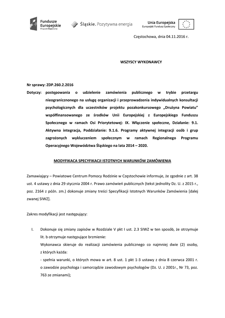 Częstochowa, dnia 04.11.2016 r. WSZYSCY WYKONAWCY Nr sprawy: ZDP.260.2.2016 Dotyczy: postępowania o udzielenie zamówienia publicznego w trybie przetargu nieogranicznonego na usługę organizacji i przeprowadzenia indywidualnych konsultacji psychologicznych dla uczestników projektu pozakonkursowego „Drużyna Powiatu” współfinansowanego ze środków Unii Europejskiej z Europejskiego Funduszu Społecznego w ramach Osi Priorytetowej: IX. Włączenie społeczne, Działanie: 9.1. Aktywna integracja, Poddziałanie: 9.1.6. Programy aktywnej integracji osób i grup zagrożonych wykluczeniem społecznym w ramach Regionalnego Programu Operacyjnego Województwa Śląskiego na lata 2014 – 2020. MODYFIKACA SPECYFIKACJI ISTOTNYCH WARUNKÓW ZAMÓWIENIA Zamawiający – Powiatowe Centrum Pomocy Rodzinie w Częstochowie informuje, że zgodnie z art. 38 ust. 4 ustawy z dnia 29 stycznia 2004 r. Prawo zamówień publicznych (tekst jednolity Dz. U. z 2015 r., poz. 2164 z późn. zm.) dokonuje zmiany treści Specyfikacji Istotnych Warunków Zamówienia [dalej zwanej SIWZ]. Zakres modyfikacji jest następujący: I. Dokonuje się zmiany zapisów w Rozdziale V pkt I ust. 2.3 SIWZ w ten sposób, że otrzymuje lit. b otrzymuje następujące brzmienie: Wykonawca skieruje do realizacji zamówienia publicznego co najmniej dwie (2) osoby, z których każda: - spełnia warunki, o których mowa w art. 8 ust. 1 pkt 1-3 ustawy z dnia 8 czerwca 2001 r. o zawodzie psychologa i samorządzie zawodowym psychologów (Dz. U. z 2001r., Nr 73, poz. 763 ze zmianami); - posiada co najmniej 320 godzinne doświadczenie w zakresie przeprowadzenia indywidualnych konsultacji psychologicznych, w okresie od października 2013r. do października 2016r. Zamawiający oceniając doświadczenie uzna wykazane zarówno godziny dydaktyczne jak i zegarowe konsultacji indywidualnych. Zamawiający uzna zarówno doświadczenie w przeprowadzeniu indywidualnych konsultacji realizowanych w ramach umowy o pracę, jak i umowy cywilnoprawnej. W przypadku osób posiadających doświadczenie w pracy psychologa w ramach stosunku pracy przyjmuje się, że wymiar 1 etatu równa się 40 godzinom indywidualnych konsultacji miesięcznie (liczonych proporcjonalnie w przypadku niepełnego etatu). Natomiast w przypadku umowy cywilnoprawnej należy wykazać faktycznie przeprowadzone indywidualne godziny konsultacji. II. Dokonuje się zmiany treści załącznika nr 6 do formularza oferty do SIWZ, który otrzymuje brzmienie w postaci załączonej do niniejszej modyfikacji. Wiążąca jest treść załącznika nr 6 do formularza oferty do SIWZ zgodna z modyfikacją z dnia 4 listopada 2016 roku. III. Dokonuje się zmiany terminu składania i otwarcia ofert, o którym mowa w Rozdziale XII SIWZ, w ten sposób, że: 1. Ofertę należy złożyć w siedzibie Zamawiającego w Częstochowie, ul. Sobieskiego 9, w pokoju nr 11 (parter), do dnia 09.11.2016 r. do godz. 10:00. 2. Oferty, które wpłyną do Zamawiającego po terminie wyznaczonym w pkt.1 będą niezwłocznie odsyłane bez otwierania. 3. Otwarcie ofert nastąpi w dniu 09.11.2016r. o godz. 10:30 w siedzibie Zamawiającego w Częstochowie, ul. Sobieskiego 9, pokój nr 11. W pozostałym zapisie Specyfikacja Istotnych Warunków Zamówienia pozostaje niezmieniona. Powyższa treść modyfikacji SIWZ jest dostępna na stronie internetowej, na której opublikowana została SIWZ. Modyfikacja SIWZ powoduje zmianę treści ogłoszenia o zamówieniu. Powiatowe Centrum Pomocy Rodzinie w Częstochowie DYREKTOR mgr Katarzyna Buchajczuk Załącznik nr 6 Do Formularza oferty Zamawiający: Powiatowe Centrum Pomocy Rodzinie w Częstochowie ul. Jana III Sobieskiego 9 42-200 Częstochowa Wykonawca: ………………………………………………………………………………………………………………................. ……………………………….........................................................…………………….................... ….................................................................................................................................. …........................................................................................................................... pełna nazwa/firma, adres, w zależności od podmiotu: NIP/PESEL, KRS/CEiDG) reprezentowany przez: ……………………………………………………………………………………………………………… (imię, nazwisko, stanowisko/podstawa do reprezentacji) Dotyczy: postępowania o udzielenie zamówienia publicznego w trybie przetargu nieograniczonego na realizację usługi organizacji i przeprowadzenia indywidualnych konsultacji psychologicznych dla uczestników projektu pozakonkursowego ,Drużyna Powiatu” współfinansowanego ze środków Unii Europejskiej z Europejskiego Funduszu Społecznego w ramach Osi Priorytetowej: IX. Włączenie społeczne, Działanie: 9.1. Aktywna integracja, Poddziałanie: 9.1.6. Programy aktywnej integracji osób i grup zagrożonych wykluczeniem społecznym w ramach Regionalnego Programu Operacyjnego Województwa Śląskiego na lata 2014 – 2020, prowadzonego przez Powiatowe Centrum Pomocy Rodzinie w Częstochowie. WYKAZ OSÓB skierowanych przez wykonawcę do realizacji zamówienia publicznego, w szczególności odpowiedzialnych za świadczenie usług, wraz z informacjami na temat ich kwalifikacji zawodowych, uprawnień, doświadczenia i wykształcenia niezbędnych do wykonania zamówienia publicznego, a także zakresu wykonywanych przez nie czynności oraz informacją o podstawie do dysponowania tymi osobami (zawierający co najmniej dane niezbędne do potwierdzenia spełniania warunku, o którym mowa w Części I, rozdz. V SIWZ) Imię i nazwisko 1 Kwalifikacje zawodowe i uprawnienia Doświadczenie (należy wykazać doświadczenie w zawodzie psychologa w okresie od października 2013r. do października 2016r. obejmujące usługi wymagane w SIWZ, t