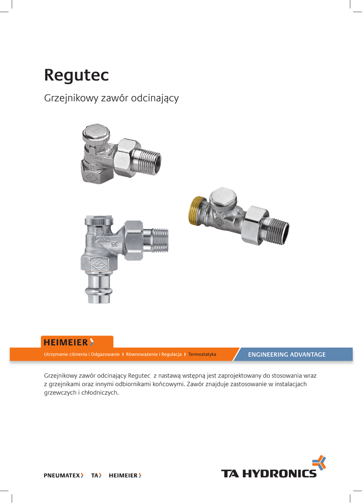 Regutec Grzejnikowy zawór odcinający Grzejnikowe zawory odcinające Utrzymanie ciśnienia i odgazowanie równoważenie i regulacja Termostatyka eNgINeeRINg ADVANtAge Grzejnikowy zawór odcinający Regutec z nastawą wstępną jest zaprojektowany do stosowania wraz z grzejnikami oraz innymi odbiornikami końcowymi. Zawór znajduje zastosowanie w instalacjach grzewczych i chłodniczych. Grzejnikowe zawory odcinające - Regutec Opis techniczny Grzejnikowy zawór odcinający z nastawą wstępną. Obsługa za pomocą klucza imbusowego 5 mm. Wersje z gwintem wewnętrznym DN 10 do DN 20, z gwintem zewnętrznym G3/4 DN 15 oraz złączkami zaprasowywanymi Viega 15 mm / DN15 zarówno proste jak i kątowe. Wymiary zgodne z DIN 3842. Uszczelnienie trzpienia za pomocą O-ringów z EPDM. Korpus z odpornego na korozję niklowanego brązu z przyłączem z gwintem wewnętrznym. Podłączenie do rury gwintowanej lub za pomocą złączki zaciskowej do rury miedzianej, ze stali cienkościennej czy rury wielowarstwowej. W modelu z gwintem wewnętrznym istnieje możliwość wykonania połączenia z rurą z tworzywa za pomocą złączek zaciskowych. Wersja z zaprasowywanymi złączkami Viega (15 mm) jest odpowiednia do miedzi, rur Viega Sanpress ze stali nierdzewnej i Prestabo ze stali cynkowanej. Doskonały wygląd dzięki zastosowaniu estetycznych obudów z programu DESIGN-LINE zwłaszcza przy równoczesnym zastosowaniu obudów do termostatycznych zaworów grzejnikowych. Dopuszczalna temperatura robocza TB 120°C, z obudową TB 90 °C, ze złączką zaciskową TB 110 °C. Dopuszczalne ciśnienie robocze PB 10 bar. Budowa Regutec • Łatwa obsługa za pomocą klucza imbusowego 5 mm • Odtwarzalna nastawa wstępna za pomocą grzybka odcinającego/regulacyjnego • Korpus z odpornego na korozję niklowanego brązu • Dostępne modele z gwintem zewnętrznym G3/4 • Możliwość wyposażenia w obudowy z programu Design-Line • Dostępne również w serii Press-Line wersja ze złączkami Viega SC-Contur 1. Kołpak 2. Uszczelka O-ring z EPDM 3. Grzybek zamykająco-regulacyjny 4. Korpus z odpornego na korozję niklowanego brązu Zastosowanie Regutec jest stosowany w instalacjach grzewczych i chłodniczych z gwintem wewnętrznym DN 10 do DN 20, z gwintem zewnętrznym G¾ DN15 oraz złączkami zaprasowywanymi Viega 15 mm / DN 15 zarówno proste jak i kątowe stwarzają różne możliwości ich zastosowania. Regutec umożliwia oddzielne odcięcie np. grzejników, dzięki czemu wszystkie prace serwisowe i dekoracyjne mogą być wykonywane bez przerywania pracy pozostałych grzejników. Specjalny dobór grzybka odcinająco/regulacyjnego i gniazda zaworu umożliwia zastosowanie zaworu zarówno do odcięcia jak i do równoważenia hydraulicznego. Celem jest zasilanie wszystkich grzejników zgodnie z ich zapotrzebowaniem na ciepło. 2 Grzejnikowe zawory odcinające - Regutec Przykład zastosowania 1. Regutec 2. Zawór termostatyczny Przyłącza zaprasowywane ze złączkami SC-Contur Viega Zawór grzejnikowy odcinający Regutec z 15 mm przyłączem zaprasowywanym Viega jest odpowiedni do rur miedzianych zgodny z EN 1057 oraz rur ze stali nierdzewnej Viega Sanpress i rur Prestabo ze stali cynkowanej. Wszystkie przyłącza zaprasowywane oraz zawory wykonane są z odpornego na korozje brązu. Przez to, że są to przyłącza zaprasowywane Viega wszystkie szczęki i pierścienie zaciskowe mogą być używane. Oznacza to, że nie ma potrzeby nabywania kosztownych narzędzi i szczęk do złączek zaprasowywanych. W trakcie zaprasowywania zacisk jest wykonywany jednocześnie przed i za karbem kształtki i daje połączeniu zaprasowywanemu wymaganą siłę i odporność. Dodatkowo, zacisk na złączce zaprasowywanej jest specjalnie uformowany tak aby dać wysokiej jakości uszczelnienie elementem EPDM w zdefiniowanym kształcie. W interesie ochrony, złącze zaprasowywane jest wyposażone w SC-Contur, który daje możliwość wykrycia nie zaprasowanego połączenia przez widoczny przeciek. Podczas operacji zaprasowywania SC-Contur jest praktycznie deformowany i tracony w efekcie procesu zaprasowywania tworząc w ten sposób ciasne i trwałe połączenie. Początkowo, przyłącze zaprasowywane nie mające cech SC-Contur może okazać się ciasne przed zaprasowywaniem, jednakże, one mogą osuwać się częściowo podczas pracy układu. Sześciokąt na zaworze jest praktycznie wykorzystywany do przytrzymywania złączki podczas dokręcania nakrętki. Do zaprasowywania mogą być użyte następujące urządzenia: - Viega: Typ 2, PT3-H, PT3-EH, PT3-AH,4E/4B - Geberit: PWH 75 - Geberit /Novopress: Typ N 230V, Typ N - Mapress/Novopress: EFP 2, ACO 1/ ECO 1 - Klauke: UAP 2 Prawidłowe narzędzia do zaciskania i zaprasowywania powinny być zatwierdzone przez odpowiedniego producenta. Rekomendujemy używania narzędzi do zaprasowywania Viega. Uwaga Skład medium przenoszącego ciepło powinien odpowiadać dyrektywie VDI wytyczna 2035, dotyczącej zapobiegania uszkodzeniom i tworzeniu się kamienia w systemach centralnego ogrzewania. W przypadku instalacji przemysłowych lub zasilanych z sieci ciepłowniczej należy przestrzegać instrukcji VDTÜV i 1466/AGFW 5/15. Oleje mineralne, środki smarne zawierające oleje mineralne zawarte w medium prowadzą najczęściej do uszkodzenia uszczelnień EPDM. W przypadku stosowania środków bezazotanowych zapobiegających zamarzaniu i korozji na bazie glikolu etylenowego i propylenowego należy sprawdzić w dokumentacji producenta odpowiednie dane, w szczególności dotyczące koncentracji poszczególnych dodatków. Obsługa Odcięcie Regutec obsługuje się za pomocą klucza imbusowego 5 mm. Obrót w kierunku ruchu wskazówek zegara zamyka Regutec. Jeżeli Regutec został założony w celu hydraulicznego zrównoważenia, to należy określić odpowiednią ilość obrotów podczas zamykania. Umożliwi to powrót do początkowych nastaw. Regulacja W celu uzyskania nastawy bezstopniowej ciągłej 