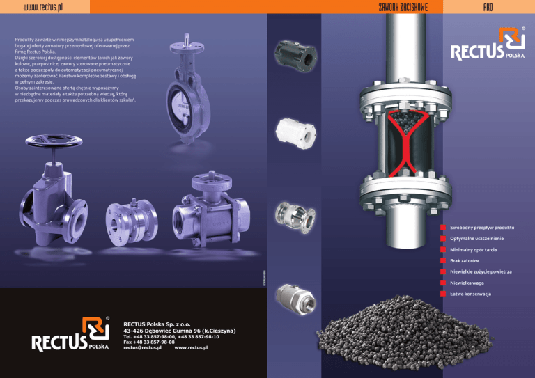w w w . r e c t u s . p l Z A W O R Y Z A C I S K O W E A K O R Produkty zawarte w niniejszym katalogu są uzupełnieniem bogatej oferty armatury przemysłowej oferowanej przez firmę Rectus Polska. Dzięki szerokiej dostępności elementów takich jak zawory kulowe, przepustnice, zawory sterowane pneumatycznie a także podzespoły do automatyzacji pneumatycznej możemy zaoferować Państwu kompletne zestawy i obsługę w pełnym zakresie. Osoby zainteresowane ofertą chętnie wyposażymy w niezbędne materiały a także potrzebną wiedzę, którą przekazujemy podczas prowadzonych dla klientów szkoleń. Swobodny przepływ produktu Optymalne uszczelnienie Minimalny opór tarcia R E C T U S P O L S K A 1 0 . 2 0 0 9 Brak zatorów Niewielkie zużycie powietrza Niewielka waga Łatwa konserwacja R RECTUS Polska Sp. z o.o. 43-426 Dębowiec Gumna 96 (k.Cieszyna) Tel. +48 33 857-98-00, +48 33 857-98-10 Fax +48 33 857-98-08 [email protected] www.rectus.pl Armaturen & Separations GmbH 5. Dostępne akcesoria Armaturen & Separations GmbH Innowacje w zakresie zaworów zaciskowych. Rozwiązanie w zakresie armatury dla produktów ściernych, korozyjnych i włóknistych, jak np. granulaty, proszki i ciecze. Zalety: Funkcjonowanie zaworu: - Swobodny przepływ produktu - Optymalne uszczelnienie - Minimalny opór tarcia - Brak zatorów - Niewielkie zużycie powietrza - Niewielka waga - Łatwość konserwacji Doprowadzenie powietrza / cieczy* pod ciśnieniem (P min. 2 bary) do korpusu zaworu powoduje zaciśnięcie się specjalnie zaprojektowanego rękawa węża o wysokiej elastyczności. W ten sposób zawór się zamyka, umożliwiając 100% uszczelnienie w trakcie przepływu produktu. Maksymalne ciśnienie robocze: 2-6 barów (w zależności od średnicy nominalnej). Wizualny wskaźnik ciśnienia Zawór przeciwzwrotny typu RFS Możliwy także montaż wielu akcesoriów Zawór elektromagnetyczny Zawór przelewowy typu LNV Zawory szybkiego spustu Wyłącznik krańcowy indukcyjny Presostat cyfrowy Pompa powietrza typu LP Układ sterujący do zastosowań próżniowych AKOVAC Układ zabezpieczający Zawór przelewowy typu LV Typy konstrukcyjne: Różnorodne typy konstrukcyjne materiałów, kołnierzy i rękawów umożliwiają szeroką gamę zastosowań. Opcjonalne systemy kontrolne umożliwiają zastosowanie np. w obszarze próżniowym i zwiększają bezpieczeństwo np. w razie przerwy w dopływie energii elektrycznej / powietrza. Dostępne także specjalne wersje do stref zagrożonych wybuchem (EX). Konserwacja: Łatwa wymiana rękawa zaworu. Przykładowe aplikacje: Transport pneumatyczny Cement, silosy Pigmenty i granulaty Przemysł ceramiczny / szklarski / tworzyw sztucznych Oczyszczalnie ścieków Przemysł farmaceutyczny / spożywczy Produkcja winiarska Próżniowe systemy toaletowe Systemy dozowania i ważenia Urządzenia do lakierowania proszkowego Transport próżniowy * proszę uzyskać informacje na temat odpowiedniej cieczy 2 11 Armaturen & Separations GmbH Seria V/VF - przyłącze kołnierzowe 3. Wymiary kołnierzy 1.Typy konstrukcyjne kołnierza l k 1 D DIN EN 1092-1 3 2 4 Typy konstrukcyjne kołnierza ANSI B 16.5 - 150 lbs NW (mm) PN D (mm) k (mm) l (mm) Liczba otworów DN cale (mm) D (mm) k (mm) l (mm) Liczba otworów 40 50 65 80 100 125 150 200 250 40 16 16 16 16 16 16 10 10 150 165 185 200 220 250 285 340 395 110 125 145 160 180 210 240 295 350 18 18 18 18 18 18 22 22 22 4 4 4* 8 8 8 8 8 12 1½" (40) 2" (50) 2½" (65) 3" (80) 4" (100) 5" (125) 6" (150) 8" (200) 10" (250) 127,0 152,4 177,8 190,5 228,6 254,0 279,4 342,9 406,4 98,6 120,7 139,7 152,4 190,5 215,9 241,3 298,5 362,0 15,7 19,1 19,1 19,1 19,1 22,4 22,4 22,4 25,4 4 4 4 4 8 8 8 8 12 1) Aluminium 2) Stal / stal nierdzewna 3) Gwint wewnętrzny GT 4) Z rękawem kołnierza *** * Wyjątek w oparciu o DIN 2633 2. Wymiary 4. Wykaz materiałów stosowanych na rękawy Kod AKO Oznaczenie skrótowe 01X 02X 03X 03H 04 04LS 04LW 05 06 07X 07LS 07LW 08X 09X CR NR / LW NR NR / H EPDM EPDM / LS EPDM / LW FPM VMQ NBR NBR / LS NBR / LW CSM IIR Nazwa materiału Neopren Guma naturalna do artykułów spożywczych - jasna Guma naturalna odporna na ścieranie Guma naturalna odporna na wysokie temperatury EPDM EPDM do artykułów spożywczych - czarny EPDM do artykułów spożywczych - jasny Viton Silikon Nitryl Nitryl do artykułów spożywczych - czarny Nitryl do artykułów spożywczych - jasny Hypalon Butyl Podane temperatury są wartościami orientacyjnymi i zależą od medium oraz zastosowania. 10 DN DI DA DD TK L H E d (mm) (mm) (mm) (mm) (mm) Śruby (mm) (mm) (mm) (mm) Temperatura maksymalna 800C 800C 800C 900C 0 0 80 C / 90 C / 1200C 800C / 900C / 1200C 800C / 900C / 1200C 1200C 1300C 800C 800C 800C 800C 800C 40 50 65 80 100 125 150 200 250 40 50 65 80 100 125 145 190 250 150 165 180 200 220 250 285 340 395 88 102 122 138 158 184 212 268 320 18 18 18 18 18 18 22 22 22 4 4 4 8 8 8 8 8 12 110 125 145 160 180 210 240 295 350 155 183 183 228 281 350 420 560 610 51 60 76 90 107 130 155 200 258 28 30 28 31 35 40 43 60 49 Waga (kg) (ok.) 2,9 3,7 4,3 5,6 8,4 12,0 17,0 35,0 84,0 (stal) PS Objętość (l)* max Wewnętrzny gwint (ok.) (bar) 0,20 0,30 0,45 0,95 1,70 3,50 7,00 15,50 30,00 6 6 6 6 6 6 6 4 2 G 1 ½" G 2" G 2 ½" G 3" G 4" - GT Głębokość (mm) 19 24 22 22 20 - * Objętość = Objętość kontrolna w przypadku zamkniętej tulei Złącze kołnierza zgodne z DIN PN 10. ANSI na zamówienie ** Standardowe przyłącze powietrza standard G 1/4" do 150 mm, DN200-3/8", DN250-1/2" *** Uszczelnienie tulei kołnierza powiększa wymiar L (DN 40-100) 3. Materiały konstrukcyjne Korpus: Odlew aluminiowy, stal nierdzewna, stal (DN250) Kołnierz: Odlew aluminiowy, odlew aluminiowy z wkładką ze stali / stali nierdzewnej, stal nierdzewna, stal (DN250) Rękaw: Naturalna guma antyścierna, naturalna guma spożywcza, naturalna guma dla wysokich temperatur, nitryl, EPDM, viton, silikon, neopren, hypalon, butyl (inne materiały na zamówienie) Osprzęt: Zawory elektromag
