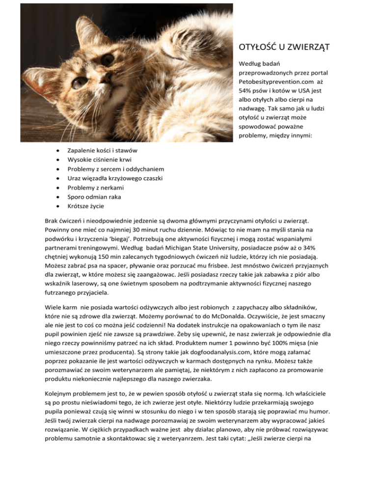OTYŁOŚĆ U ZWIERZĄT Według badań przeprowadzonych przez portal Petobesityprevention.com aż 54% psów i kotów w USA jest albo otyłych albo cierpi na nadwagę. Tak samo jak u ludzi otyłość u zwierząt może spowodować poważne problemy, między innymi: Zapalenie kości i stawów Wysokie ciśnienie krwi Problemy z sercem i oddychaniem Uraz więzadła krzyżowego czaszki Problemy z nerkami Sporo odmian raka Krótsze życie Brak ćwiczeń i nieodpowiednie jedzenie są dwoma głównymi przyczynami otyłości u zwierząt. Powinny one mieć co najmniej 30 minut ruchu dziennie. Mówiąc to nie mam na myśli stania na podwórku i krzyczenia ‘biegaj’. Potrzebują one aktywności fizycznej i mogą zostać wspaniałymi partnerami treningowymi. Według badań Michigan State University, posiadacze psów aż o 34% chętniej wykonują 150 min zalecanych tygodniowych ćwiczeń niż ludzie, którzy ich nie posiadają. Możesz zabrać psa na spacer, pływanie oraz porzucać mu frisbee. Jest mnóstwo ćwiczeń przyjaznych dla zwierząt, w które możesz się zaangażowac. Jeśli posiadasz rzeczy takie jak zabawka z piór albo wskaźnik laserowy, są one świetnym sposobem na podtrzymanie aktywności fizycznej naszego futrzanego przyjaciela. Wiele karm nie posiada wartości odżywczych albo jest robionych z zapychaczy albo składników, które nie są zdrowe dla zwierząt. Możemy porównać to do McDonalda. Oczywiście, że jest smaczny ale nie jest to coś co można jeść codzienni! Na dodatek instrukcje na opakowaniach o tym ile nasz pupil powinien zjeść nie zawsze są prawdziwe. Żeby się upewnić, że nasz zwierzak je odpowiednie dla niego rzeczy powinniśmy patrzeć na ich skład. Produktem numer 1 powinno być 100% mięsa (nie umieszczone przez producenta). Są strony takie jak dogfoodanalysis.com, które mogą załamać poprzez pokazanie ile jest wartości odżywczych w karmach dostępnych na rynku. Możesz także porozmawiać ze swoim weterynarzem ale pamiętaj, że niektórym z nich zapłacono za promowanie produktu niekoniecznie najlepszego dla naszego zwierzaka. Kolejnym problemem jest to, że w pewien sposób otyłość u zwierząt stała się normą. Ich właściciele są po prostu nieświadomi tego, że ich zwierze jest otyłe. Niektórzy ludzie przekarmiają swojego pupila ponieważ czują się winni w stosunku do niego i w ten sposób starają się poprawiać mu humor. Jeśli twój zwierzak cierpi na nadwage porozmawiaj ze swoim weterynarzem aby wypracować jakieś rozwiązanie. W ciężkich przypadkach ważne jest aby działac planowo, aby nie próbwać rozwiązywac problemu samotnie a skontaktowac się z weteryanrzem. Jest taki cytat: „Jeśli zwierze cierpi na nadwage to oznacza, że TY nie masz wystarczająco dużo wysiłku fizycznego”. Więc lepiej wstań z kanapy i zrób coś śmiesznego! Jakie jest twoje ulubione ćwiczenie dzięki któremu ty i on trzymacie sylwetke? Jeśli jednak twój zwierzak nie jest otyły to najlepszym sposobem aby tak pozostało jest wspolne wychodzenie na spacer! Mateusz Galiński http://www.isfoundation.com/news/obesity-pets