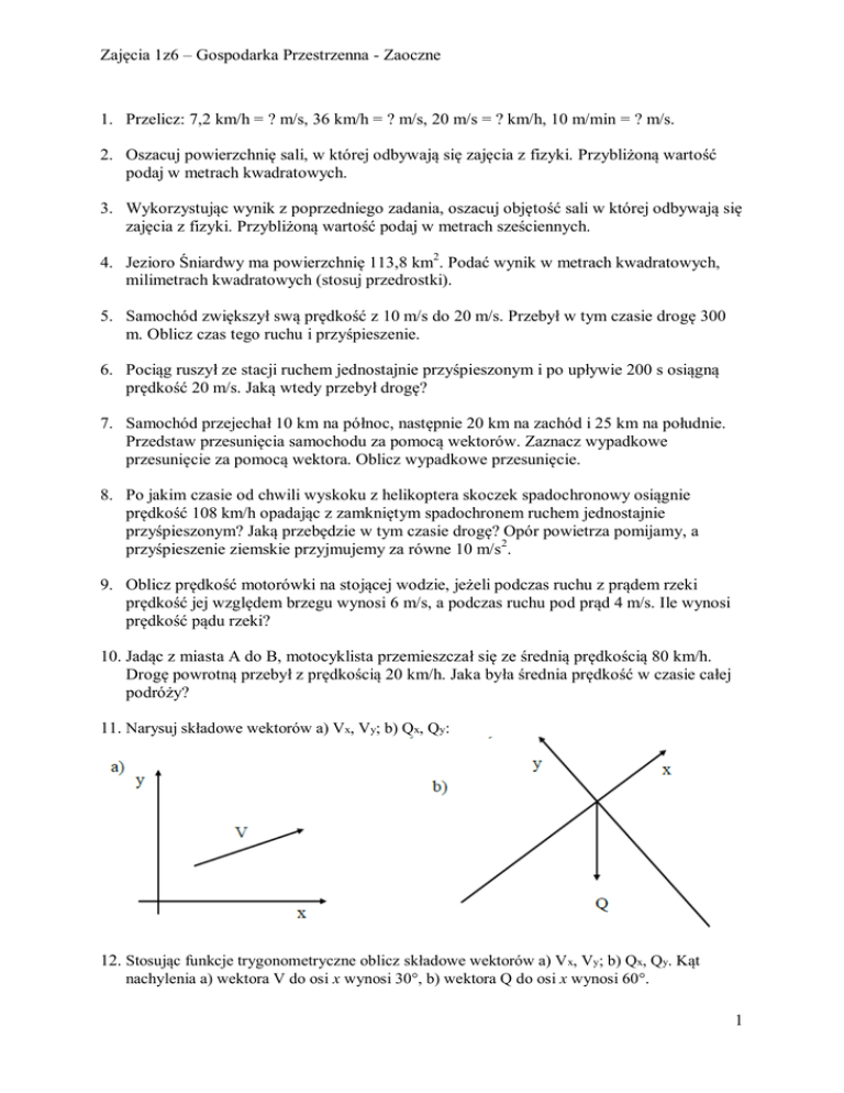 Zajęcia 1z6 – Gospodarka Przestrzenna - Zaoczne 1. Przelicz: 7,2 km/h = ? m/s, 36 km/h = ? m/s, 20 m/s = ? km/h, 10 m/min = ? m/s. 2. Oszacuj powierzchnię sali, w której odbywają się zajęcia z fizyki. Przybliżoną wartość podaj w metrach kwadratowych. 3. Wykorzystując wynik z poprzedniego zadania, oszacuj objętość sali w której odbywają się zajęcia z fizyki. Przybliżoną wartość podaj w metrach sześciennych. 4. Jezioro Śniardwy ma powierzchnię 113,8 km2. Podać wynik w metrach kwadratowych, milimetrach kwadratowych (stosuj przedrostki). 5. Samochód zwiększył swą prędkość z 10 m/s do 20 m/s. Przebył w tym czasie drogę 300 m. Oblicz czas tego ruchu i przyśpieszenie. 6. Pociąg ruszył ze stacji ruchem jednostajnie przyśpieszonym i po upływie 200 s osiągną prędkość 20 m/s. Jaką wtedy przebył drogę? 7. Samochód przejechał 10 km na północ, następnie 20 km na zachód i 25 km na południe. Przedstaw przesunięcia samochodu za pomocą wektorów. Zaznacz wypadkowe przesunięcie za pomocą wektora. Oblicz wypadkowe przesunięcie. 8. Po jakim czasie od chwili wyskoku z helikoptera skoczek spadochronowy osiągnie prędkość 108 km/h opadając z zamkniętym spadochronem ruchem jednostajnie przyśpieszonym? Jaką przebędzie w tym czasie drogę? Opór powietrza pomijamy, a przyśpieszenie ziemskie przyjmujemy za równe 10 m/s2. 9. Oblicz prędkość motorówki na stojącej wodzie, jeżeli podczas ruchu z prądem rzeki prędkość jej względem brzegu wynosi 6 m/s, a podczas ruchu pod prąd 4 m/s. Ile wynosi prędkość pądu rzeki? 10. Jadąc z miasta A do B, motocyklista przemieszczał się ze średnią prędkością 80 km/h. Drogę powrotną przebył z prędkością 20 km/h. Jaka była średnia prędkość w czasie całej podróży? 11. Narysuj składowe wektorów a) Vx, Vy; b) Qx, Qy: 12. Stosując funkcje trygonometryczne oblicz składowe wektorów a) V x, Vy; b) Qx, Qy. Kąt nachylenia a) wektora V do osi x wynosi 30, b) wektora Q do osi x wynosi 60. 1 Zajęcia 1z6 – Gospodarka Przestrzenna - Zaoczne 13. Lokomotywa manewrowa pchnęła wagon o masie 40 ton, nadając mu prędkość początkową o wartości 5 m/s. Wagon, poruszając się ruchem jednostajnie opóźnionym, zatrzymał się po upływie 20 s. Oblicz wartość siły hamującej wagon. 14. Jeżeli pominiemy tarcie i masę bloczków, to ile wynosi przyspieszenie klocków i siła naciągu liny łączącej klocki? m = 1 kg m 2m 15. Piłka o masie 0,2 kg porusza się z prędkością 4 m/s i uderza w ścianę pod kątem prostym. Po odbiciu zmianie ulega tylko zwrot prędkości. Jaką średnią siłą piłka działała na ścianę podczas zderzenia, jeśli zderzenie trwało 0,1 s? (-16 N) 16. Jaką najmniejszą wartość ma pozioma siła, którą należy docisnąć klocek o masie 0,5 kg do pionowej ściany, aby dzięki tarciu nie zsunął się? Współczynnik tarcia statycznego pomiędzy klockiem a ścianą wynosi 0,1. (50 N) 17. Z równi pochyłej o kącie nachylenia 30 stopni zsuwa się skrzynia. Jaką wartość ma przyspieszenie skrzyni, jeśli współczynnik tarcia kinetycznego wynosi 0,01? 18. Ciało swobodnie zsuwa się z wierzchołka równi pochyłej, której kąt nachylenia do poziomu wynosi α = 30 stopni. Wyznaczyć czas ruchu ciała na równi, jeżeli wysokość równi pochyłej wynosi h = 1 m, współczynnik tarcia f = 0,5. (2,5 s) 19. W ciągu t = 10 s od początku ruchu jednostajnie przyśpieszonego po linii prostej ciało o masie m = 2 kg osiągnęło prędkość V = 5 m/s. Oblicz siłę wypadkową oraz siłę działającą na ciało, jeżeli siła tarcia wynosi 4 N. 20. Oblicz pracę wykonaną przez osobę niosącą torbę z zakupami o masie 5 kg, gdy osoba ta a) idzie po poziomym chodniku o długości 200 m, b) wchodzi po schodach na wysokość 10 m. (a) 0 J, b) 500 J) 21. Samochód, którego silnik pracuje z mocą 30 kW, jedzie ze stałą prędkością 20 m/s. Ile wynosi siła napędowa samochodu? 22. Pocisk o masie 20 kg, lecący poziomo z prędkością 1000 m/s, trafia w platformę z piaskiem o masie 1 tona i grzęźnie w piasku. Z jaką prędkością v2 zacznie poruszać się platforma? 23. Skoczek pokonał poprzeczkę umieszczoną na wysokości 125 cm. Jaką prędkość musiał uzyskać w wyniku odbicia się? 2
