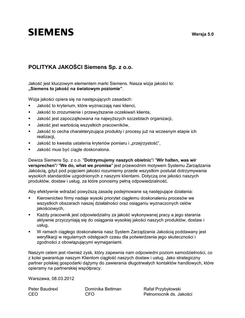 Wersja 5.0 POLITYKA JAKOŚCI Siemens Sp. z o.o. Jakość jest kluczowym elementem marki Siemens. Nasza wizja jakości to: „Siemens to jakość na światowym poziomie”. Wizja jakości opiera się na następujących zasadach: Jakość to kryterium, które wyznaczają nasi klienci, Jakość to zrozumienie i przewyższanie oczekiwań klienta, Jakość jest zapoczątkowana na najwyższych szczeblach organizacji, Jakość jest wartością wszystkich pracowników, Jakość to cecha charakteryzująca produkty i procesy już na wczesnym etapie ich realizacji, Jakość to kwestia ustalenia kryteriów pomiaru i „przejrzystość”, Jakość musi być ciągle doskonalona. Dewiza Siemens Sp. z o.o. "Dotrzymujemy naszych obietnic"/ "Wir halten, was wir versprechen"/ "We do, what we promise" jest przewodnim motywem Systemu Zarządzania Jakością, gdyż pod pojęciem jakości rozumiemy przede wszystkim postulat dotrzymywania wysokich standardów uzgodnionych z naszymi klientami. Dotyczą one jakości naszych produktów, dostaw i usług, za które ponosimy pełną odpowiedzialność. Aby efektywnie wdrażać powyższą zasadę podejmowane są następujące działania: Kierownictwo firmy nadaje wysoki priorytet ciągłemu doskonaleniu procesów we wszystkich obszarach naszej działalności oraz osiąganiu wyznaczonych celów jakościowych, Każdy pracownik jest odpowiedzialny za jakość wykonywanej pracy a jego starania aktywnie przyczyniają się do osiągania wysokiej jakości naszych produktów, dostaw i usług, W ramach ciągłego doskonalenia nasz System Zarządzania Jakością poddawany jest weryfikacji w regularnych odstępach czasu dla potwierdzenia jego skuteczności i zgodności z obowiązującymi wymaganiami. Naszym celem jest również zysk, który zapewnia nam odpowiedni poziom samodzielności, co z kolei gwarantuje naszym Klientom ciągłość naszych dostaw i usług. Jako strategiczny partner polskiej gospodarki dążymy do zawierania długotrwałych kontaktów handlowych, które opieramy na partnerskiej współpracy. Warszawa, 08.03.2012 Peter Baudrexl CEO Dominika Bettman CFO Rafał Przybyłowski Pełnomocnik ds. Jakości