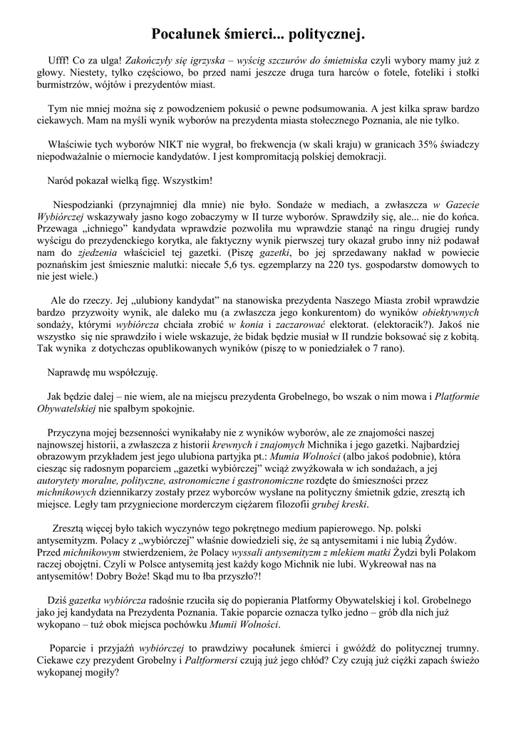 Pocałunek śmierci... politycznej. Ufff! Co za ulga! Zakończyły się igrzyska – wyścig szczurów do śmietniska czyli wybory mamy już z głowy. Niestety, tylko częściowo, bo przed nami jeszcze druga tura harców o fotele, foteliki i stołki burmistrzów, wójtów i prezydentów miast. Tym nie mniej można się z powodzeniem pokusić o pewne podsumowania. A jest kilka spraw bardzo ciekawych. Mam na myśli wynik wyborów na prezydenta miasta stołecznego Poznania, ale nie tylko. Właściwie tych wyborów NIKT nie wygrał, bo frekwencja (w skali kraju) w granicach 35% świadczy niepodważalnie o miernocie kandydatów. I jest kompromitacją polskiej demokracji. Naród pokazał wielką figę. Wszystkim! Niespodzianki (przynajmniej dla mnie) nie było. Sondaże w mediach, a zwłaszcza w Gazecie Wybiórczej wskazywały jasno kogo zobaczymy w II turze wyborów. Sprawdziły się, ale... nie do końca. Przewaga „ichniego” kandydata wprawdzie pozwoliła mu wprawdzie stanąć na ringu drugiej rundy wyścigu do prezydenckiego korytka, ale faktyczny wynik pierwszej tury okazał grubo inny niż podawał nam do zjedzenia właściciel tej gazetki. (Piszę gazetki, bo jej sprzedawany nakład w powiecie poznańskim jest śmiesznie malutki: niecałe 5,6 tys. egzemplarzy na 220 tys. gospodarstw domowych to nie jest wiele.) Ale do rzeczy. Jej „ulubiony kandydat” na stanowiska prezydenta Naszego Miasta zrobił wprawdzie bardzo przyzwoity wynik, ale daleko mu (a zwłaszcza jego konkurentom) do wyników obiektywnych sondaży, którymi wybiórcza chciała zrobić w konia i zaczarować elektorat. (elektoracik?). Jakoś nie wszystko się nie sprawdziło i wiele wskazuje, że bidak będzie musiał w II rundzie boksować się z kobitą. Tak wynika z dotychczas opublikowanych wyników (piszę to w poniedziałek o 7 rano). Naprawdę mu współczuję. Jak będzie dalej – nie wiem, ale na miejscu prezydenta Grobelnego, bo wszak o nim mowa i Platformie Obywatelskiej nie spałbym spokojnie. Przyczyna mojej bezsenności wynikałaby nie z wyników wyborów, ale ze znajomości naszej najnowszej historii, a zwłaszcza z historii krewnych i znajomych Michnika i jego gazetki. Najbardziej obrazowym przykładem jest jego ulubiona partyjka pt.: Mumia Wolności (albo jakoś podobnie), która ciesząc się radosnym poparciem „gazetki wybiórczej” wciąż zwyżkowała w ich sondażach, a jej autorytety moralne, polityczne, astronomiczne i gastronomiczne rozdęte do śmieszności przez michnikowych dziennikarzy zostały przez wyborców wysłane na polityczny śmietnik gdzie, zresztą ich miejsce. Legły tam przygniecione morderczym ciężarem filozofii grubej kreski. Zresztą więcej było takich wyczynów tego pokrętnego medium papierowego. Np. polski antysemityzm. Polacy z „wybiórczej” właśnie dowiedzieli się, że są antysemitami i nie lubią Żydów. Przed michnikowym stwierdzeniem, że Polacy wyssali antysemityzm z mlekiem matki Żydzi byli Polakom raczej obojętni. Czyli w Polsce antysemitą jest każdy kogo Michnik nie lubi. Wykreował nas na antysemitów! Dobry Boże! Skąd mu to łba przyszło?! Dziś gazetka wybiórcza radośnie rzuciła się do popierania Platformy Obywatelskiej i kol. Grobelnego jako jej kandydata na Prezydenta Poznania. Takie poparcie oznacza tylko jedno – grób dla nich już wykopano – tuż obok miejsca pochówku Mumii Wolności. Poparcie i przyjaźń wybiórczej to prawdziwy pocałunek śmierci i gwóźdź do politycznej trumny. Ciekawe czy prezydent Grobelny i Paltformersi czują już jego chłód? Czy czują już ciężki zapach świeżo wykopanej mogiły? Cóż, jest taka krótka modlitwa: Dobry Boże, zachowaj mnie od przyjaciół moich – z wrogami sam sobie poradzę. Zwłaszcza od takich przyjaciół.....