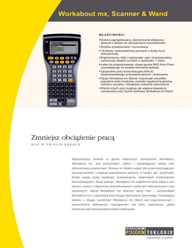 Workabout mx, Scanner & Wand W£AŒCIWOŒCI · Dobrze zaprojektowany, ekonomicznie efektywny terminal z ³atwym do odczytywania wyœwietlaczem · Szybkie przetwarzanie i komunikacja · 16-bitowy, wielozadaniowy procesor o du¿ej mocy obliczeniowej · Ergonomiczny, lekki i wytrzyma³y: py³o i kroploszczelny; wytrzymuje upadek na beton z wysokoœci 1 metra · £atwy do programowania: u¿ywa jêzyka RAD firmy Psion pozwalaj¹cego na szybkie tworzenie aplikacji · Opcjonalne porty komunikacyjne IrDA do bezprzewodowego przesy³ania danych i drukowania · Opcja Workabout mx Skaner rozpoznaje wszystkie popularne kody kreskowe; posiada regulowan¹ g³owicê skanera; wizualny i dŸwiêkowy wskaŸnik skanowania · Wœród innych opcji znajduje siê wiêksza klawiatura numeryczna oraz czytnik piórkowy Workabout mx Wand Najważniejszy produkt w gamie naręcznych komputerów Workabout, Workabout mx, jest wytrzymałym, lekkim i posiadającym wielką moc obliczeniową urządzeniem. Stanowi on idealny wybór dla przemieszczających się pracowników i znajduje zastosowanie zarówno w handlu, jak i przemyśle. Dzięki swojej dużej prędkości przetwarzania, doskonałym możliwościom komunikacyjnym i dużej pamięci, Workabout mx znakomicie radzi sobie w tym samym czasie z najbardziej skomplikowanymi zadaniami obliczeniowymi oraz użytkowymi. Opcja Workabout mx Scanner łączy moc i wytrzymałość Workabout mx z najnowszą technologią skanowania laserowego. Posiadający baterie o długiej żywotności Workabout mx Wand jest ergonomicznym i ekonomicznie efektywnym rozwiązaniem dla wielu zastosowań, gdzie konieczne jest odczytywanie kodów kreskowych. Workabout mx, Scanner & Wand · Procesor: 16−bitowy NEC V30MX (zgodny z 80C86), zegar 27,684 MHz · Pamięć wewnętrzna RAM: 2 MB · Pamięć wewnętrzna ROM: 2 MB, zawierająca system operacyjny, biblioteki języka OVAL oraz inne aplikacje · Dyski SSD: dwie kieszenie na pamięci Flash lub RAM Workabout mx pozwalające zwiększyć dostępną pamięć o 16 MB · Wyświetlacz: 240 × 100 pikseli, ciekłokrystaliczny, mono−chromatyczny, graficzny, standardowo podświetlany, do 39 znaków w 12 liniach · Klawiatura: standardowo 57 klawiszy alfanumerycznych, opcjonalnie 37 klawiszy numerycznych i funkcyjnych · Dźwięk: brzęczyk piezoelektryczny · ID: indywidualny, możliwość odczytu przez aplikacje · Zasilanie: wewnętrzne: 2 ogniwa alkaliczne AA (R6) albo zestaw akumulatorów NiCd lub NiMH bateria podtrzymania pamięci: ogniwo litowe CR 1620 Workabout mx Scanner zewnętrzne: z różnych urządzeń zewnętrznych typu stacje dokujące pojedyńcze i wielostanowiskowe oraz uchwyty dokujące. Urządzenia te pozwalają również na ładowanie akumulatorów. · Zewnętrzne porty rozszerzające: gniazdo (LIF−PFS) we współpracy z uchwytem lub stacją dokującą daje dodatkowy port RS 232 do komunikacji oraz umożliwia zasilanie komputera i ładowanie akumulatorów · Wśród opcji znajdują się: porty: RS232, TTL, barcode oraz IrDA klawiatura numeryczna z powiększonymi klawiszami numerycznymi w celu łatwiejszego wprowadzania danych Workabout mx Wand z wbudowanym czytnikiem piórkowym Workabout mx Scanner z wbudowanym skanerem laserowym · Workabout mx posiada możliwość współpracy z szeregiem urządzeń peryferyjnych ułatwiających przesyłanie i drukowanie danych oraz inteligentne zarządzanie zasilaniem. · System operacyjny: SIBO zapewniający wielozadanio− wość, wsparcie trybu graficznego, graficzny interfejs użytkownika oraz podobny do DOS−owego procesor komend · System plików: format i struktura plików kompatybilna z MS−DOS · Komunikacja: wbudowane opcje komunikacyjne obejmują: TCP/IP, IrDA oraz w standardzie język skryptów. · Programowanie: standardowo wbudowany run−time języka OVAL, edytor i kompilator języka OPL. Zintegrowane środowisko Windows do tworzenia aplikacji na komputerze PC dla języków OVAL, OPL i C · Stałe aplikacje: arkusz kalkulacyjny zgodny z Lotus 1−2− 3, baza danych, kalkulator, moduł komunikacyjny. Aplikacje demonstracyjne dla protokołów TCP/IP, IrDA i skanowania kodów kreskowych · Wymiary: 189 × 92 × 35 mm wesja ze skanerem: 223 × 92 × 35 mm · Waga: 325g z bateriami wersja ze skanerem: 436g z bateriami Workabout mx Wand · rodzina produktów Workabout mx obejmuje szereg modeli przeznaczonych do różnych zastosowań · Rozdzielczość kodów kreskowych: odległość skanowania 5 mil 83 do 125 mm 10 mil 63 do 330 mm 55 mil do 915 mm · Zakres temperatur: O O pracy: −20 C do 60 C O O magazynowania: −25 C do 70 C, wersja ze skanerem pracy: −15OC do 55OC magazynowania: −20OC do 60OC · Dopuszczalna wilgotność: od 0% do 95%, bez kondensacji · Odporność na warunki zewnętrzne: standardowo IP 54, pyło i kroploszczelny ze wszystkich stron · Odporność na upadek: wytrzymuje upadek dowolną powierzchnią z wysokości 1,0 m na beton · Normy bezpieczeństwa: zgodnie z EN 60950 (Europa) · Odczytywane kody kreskowe: EAN/JAN 8, EAN/JAN 13, UPC A, UPC E, CODEABAR, CODE 39 STANDARD, CODE 39 EXTENDED, INTERLEAVED 2 of 5, CODE 128, CODE 93, MSI, USS−128, UCC/EAN 128, ISTB−128 · Częstość skanowania: 36 na minutę (średnio) · Kontrast kodu: minimum 20% · Emisja:Europa: EN 55022 klasa B USA: FCC część 15, klasa B · Odczytywane kody kreskowe: EAN/JAN 8, EAN/JAN 13, UPC A, UPC E, CODEABAR, CODE 39 STANDARD, CODE 39 EXTENDED, INTERLEAVED 2 of 5, CODE 128 · Odporność na przebicie: zgodnie z IEC 801−2 (8kV) O O · Kąt odczytu: od 0 do 35 · Odporność na pola RF: zgodnie z IEC 801−3 · Odległość odczytu: od 0 do 1,6 mm · Odporność na szybkie, przejściowe przebiegi (EFT): zgodnie z IEC 801−4 · Prędkość skanowania: od 7.6 do 79 cm na sekundę, widoczne źródło lasera z 6 mm przesłoną, szafirowa końcówka o długiej żywotności (ponad 10 milionów odczytów). O FIRMIE PSION TEKLOGIX Psion Teklogix projektuje i dostarcza mobilne systemy komputer