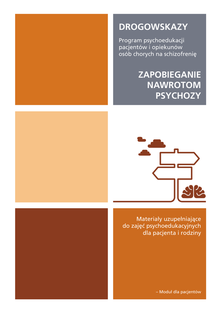 DROGOWSKAZY Program psychoedukacji pacjentów i opiekunów osób chorych na schizofrenię ZAPOBIEGANIE NAWROTOM PSYCHOZY Materiały uzupełniające do zajęć psychoedukacyjnych dla pacjenta i rodziny – Modułdla pacjentów 01 02 ZAPOBIEGANIE NAWROTOM PSYCHOZY Schizofrenia jest chorobą przewlekłą i nawracającą. W tym kontekście jest podobna do takich chorób, jak nadciśnienie tętnicze, czy cukrzyca. Co to znaczy? Przewlekłość, to znaczy, że czas, w którym pacjent odczuwa nasilone objawy może się wydłużać i trwać 4-6 tygodni. W tym okresie dochodzić może do zaburzeń zachowania, poważnych zaburzeń funkcjonowania, w tym hospitalizacji. Nawracanie objawów to sytuacja, w której nawet podczas przyjmowania leków, objawy choroby pojawiają się. Między okresami nawrotów są czasem nawet bardzo długie stany dobrego samopoczucia bez objawów, czyli okresy remisji. Celem tej części programu psychoedukacyjnego jest przedstawienie informacji, które dotyczą rozpoznawania i zapobiegania nawrotom psychozy. Ryzyko pojawienia się nawrotów choroby jest wysokie. Statystyki podają, że w ciągu 12 miesięcy objawy choroby wracają u 75% chorych. Badania wykazały, że objawy świadczące o takiej sytuacji są charakterystyczne dla danego pacjenta. Można powiedzieć, że są wprost jak „odcisk palca”, „autograf choroby”. Dlatego, aby dobrze funkcjonować pomimo choroby, warto zapoznać się zarówno z czynnikami, które mogą doprowadzić do nawrotu objawów, jak i poznać te objawy, zwane „objawami zwiastunowymi”. Twoja choroba dotyczy również Twoich bliskich, może destabilizować system rodzinny, doprowadzać do niepotrzebnych konfliktów, a jednocześnie powoduje, że każdy nawrót choroby trwa dłużej i leczenie go może być trudniejsze. 03 W przebiegu każdej schizofrenii można wyróżnić trzy zasadnicze okresy. Są to: – Okres zaostrzenia: jest to czas ze znacznym nasileniem objawów, zwykle pozytywnych. Może rozpoczynać się nagle, lub powoli – w przeciągu kilku, czy nawet kilkunastu miesięcy. Im wcześniej objawy choroby zostaną wykryte, im wcześniej w wyniku tego zastosowane będą leki, tym szybciej chory wyjdzie z okresu zaostrzenia schizofrenii i przejdzie do okresu następnego – okresu stabilizacji. – Okres stabilizacji: w okresie tym, w wyniku stosowanych leków dochodzi do stopniowego zmniejszania objawów schizofrenii, a chory powoli powraca do normalnego funkcjonowania. – Okres remisji: Objawy schizofrenii występują w tym okresie w niewielkim nasileniu, albo nie występują w ogóle. W czasie tego okresu chory przyjmuje zmniejszone (podtrzymujące) dawki leków. W przebiegu remisji dochodzi zwykle do stopniowej poprawy samopoczucia chorego. Ilość i czas zaostrzeń może być różny: pierwsza psychoza druga psychoza trzecia psychoza remisja - brak nawrotów psychozy 04 Dlaczego ważne jest zapobieganie nawrotom? Wiele badań odnoszących się do różnych chorób przewlekłych i nawracających podkreśla, że ważne jest by nie dopuścić, aby wróciły objawy choroby. Podobnie jest i w schizofrenii. Konsekwencjami nawrotu choroby są: – Tak zwana „neurotoksyczność” psychozy. Okazuje się, że w trakcie ostrej psychozy dochodzi do większej aktywności różnych substancji w mózgu, co prowadzi do uszkodzenia komórek nerwowych. Obserwujemy wtedy m.in. pogorszenie pamięci, koncentracji uwagi. – Ubytek istoty szarej (ilość komórek nerwowych w mózgu, związana z neurotoksycznością) w każdym kolejnym epizodzie i w efekcie - coraz gorsze funkcjonowanie mózgu (objawy wytwórcze są trudniejsze do eliminacji, mogą utrzymywać się stale, choć w minimalnym natężeniu). – Konieczność zwiększania dawek leków, ale też czasami ilości leków (2, różne, do tego zastrzyki) przy kolejnych epizodach. Może być więcej leków i w wyższych dawkach. To także jest konsekwencją uszkodzenia komórek nerwowych w mózgu. – Zachowania samobójcze. – Agresja, pobudzenie, trudności w kontrolowaniu emocji. – Hospitalizacja, korzystanie z innych form interwencji w sytuacji kryzysowej jak Pogotowie Ratunkowe, szpitalna Izba Przyjęć, niekiedy Policja. – Przyjęcia do szpitala bez zgody. – Pogorszenie dalszego przebiegu choroby (więcej nawrotów, dłuższy czas ich trwania). 05 – Konsekwencje dla nauki, pracy, finansowe (niemożność ukończenia nauki, utrata pracy, utrata niezależności finansowej i w końcu uzależnienie od opieki społecznej). – Zmienione relacje społeczne. Często dochodzi do ograniczenia kontaktów z rówieśnikami (długie pobyty w szpitalu, nasilenie objawów negatywnych choroby), co skutkuje bezczynnością, „zapadaniem się”. – Pogorszenie relacji z osobami bliskimi (rodziną, innymi osobami bliskimi). – Konsekwencje dla innych (bliskich) osób, często konieczność zmiany pracy, podporządkowanie życia chorobie, utrata możliwości realizacji własnych celów, pogorszenie ich stanu zdrowia. Można powiedzieć, że na wszystkie te konsekwencje możesz mieć wpływ w większym lub mniejszym stopniu. Nawet, jeśli one wystąpią, to można je ograniczać lub eliminować. Celem terapii (nie tylko leczenia farmakologicznego) jest zapobieganie kolejnym nawrotom psychozy, a przez to uzyskanie remisji i dobrego funkcjonowania w długim czasie. Wiele doświadczeń pacjentów i ich psychiatrów oraz wiele badań naukowych wskazuje, że jest to możliwe. Określono zarówno czynniki, które powodują nawroty choroby, jak i działania, które trzeba podejmować, aby uzyskanie remisji było szybkie i trwało jak najdłużej. 06 Możesz sobie pomóc w powrocie do zdrowia po epizodzie psychotycznym – Przyjmuj leki regularnie i zgodnie z zaleceniami lekarza. Leczenie farmakologiczne jest podstawową terapią i jeśli jest kontynuowane odpowiednio długo w największym stopniu, pomaga zapobiec nawrotom choroby. Wykazano, że leki przeciwpsychotyczne przyjmowane regula