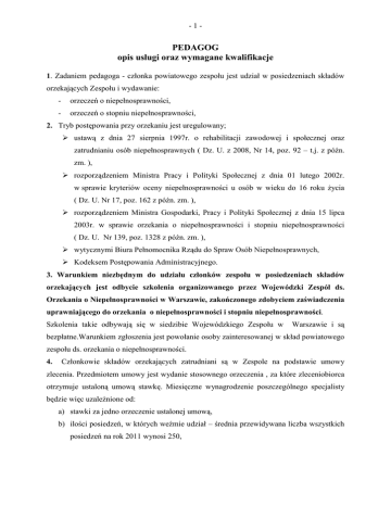 -1- PEDAGOG opis usługi oraz wymagane kwalifikacje 1. Zadaniem pedagoga - członka powiatowego zespołu jest udział w posiedzeniach składów orzekających Zespołu i wydawanie: - orzeczeń o niepełnosprawności, - orzeczeń o stopniu niepełnosprawności, 2. Tryb postępowania przy orzekaniu jest uregulowany; ustawą z dnia 27 sierpnia 1997r. o rehabilitacji zawodowej i społecznej oraz zatrudnianiu osób niepełnosprawnych ( Dz. U. z 2008, Nr 14, poz. 92 – t.j. z późn. zm. ), rozporządzeniem Ministra Pracy i Polityki Społecznej z dnia 01 lutego 2002r. w sprawie kryteriów oceny niepełnosprawności u osób w wieku do 16 roku Ŝycia ( Dz. U. Nr 17, poz. 162 z późn. zm. ), rozporządzeniem Ministra Gospodarki, Pracy i Polityki Społecznej z dnia 15 lipca 2003r. w sprawie orzekania o niepełnosprawności i stopniu niepełnosprawności ( Dz. U. Nr 139, poz. 1328 z późn. zm. ), wytycznymi Biura Pełnomocnika Rządu do Spraw Osób Niepełnosprawnych, Kodeksem Postępowania Administracyjnego. 3. Warunkiem niezbędnym do udziału członków zespołu w posiedzeniach składów orzekających jest odbycie szkolenia organizowanego przez Wojewódzki Zespół ds. Orzekania o Niepełnosprawności w Warszawie, zakończonego zdobyciem zaświadczenia uprawniającego do orzekania o niepełnosprawności i stopniu niepełnosprawności. Szkolenia takie odbywają się w siedzibie Wojewódzkiego Zespołu w Warszawie i są bezpłatne.Warunkiem zgłoszenia jest powołanie osoby zainteresowanej w skład powiatowego zespołu ds. orzekania o niepełnosprawności. 4. Członkowie składów orzekających zatrudniani są w Zespole na podstawie umowy zlecenia. Przedmiotem umowy jest wydanie stosownego orzeczenia , za które zleceniobiorca otrzymuje ustaloną umową stawkę. Miesięczne wynagrodzenie poszczególnego specjalisty będzie więc uzaleŜnione od: a) stawki za jedno orzeczenie ustalonej umową, b) ilości posiedzeń, w których weźmie udział – średnia przewidywana liczba wszystkich posiedzeń na rok 2011 wynosi 250, -2c) liczby wniosków skierowanych na posiedzenie i przez niego rozpatrzonych – liczba ta kształtuje się w przedziale 10 – 20 spraw. 5. Składy orzekające Zespołu zbierają się w siedzibie ( Płock, ul Wolskiego 4, pok. nr 1), w godzinach przedpołudniowych i popołudniowych, od poniedziałku do piątku. Posiedzenia poszczególnych specjalistów ustalane są indywidualnie, na tydzień przed terminem. 6. Powiatowy Zespół w Płocku poszukuje 1 pedagoga. Przewidywana w 2011r. liczba spraw dla pedagoga – 150. A - wymagania kwalifikacyjne: ukończone magisterskie studia na kierunku pedagogika. B – wymagane dokumenty ( wynikające z Rozporządzenia MG,PiPS z dnia 15.07.2003r. w sprawie orzekania o niepełnosprawności i stopniu niepełnosprawności – Dz. U. Nr 139, poz. 1328 z późn. zm. ) kserokopia, potwierdzona za zgodność z oryginałem przez zainteresowanego, dyplomu magistra pedagogiki. C - zadania pedagoga w Zespole : wypełnienie oceny pedagogicznej orzekanego na podstawie przeprowadzonego wywiadu z orzekanym i jego opiekunem prawnym – w trakcie posiedzenia składu orzekającego. Ofertę wraz z niezbędnymi załącznikami naleŜy złoŜyć w siedzibie Miejskiego Ośrodka Pomocy Społecznej w Płocku przy ul. Wolskiego 4, pok nr 1 ( przybudówka ) lub 206 ( sekretariat ). Koperta zawierająca ofertę powinna być zaklejona i opisana: „Nabór członków Powiatowego Zespołu ds. Orzekania o Niepełnosprawności w Płocku”. Termin składania ofert – do dnia 20.12.2010r. -3- OFERTA PEDAGOGA Wykształcenie.............................................................................................................................. Imię i nazwisko ............................................................................................................................ Adres zameldowania.. ................................................................................................................. Adres korespondencyjny .............................................................................................................. Telefon kontaktowy ..................................................................................................................... Obecne miejsce zatrudnienia .................................................................................................... Doświadczenie zawodowe: ........................................................................................................ ....................................................................................................................................................... ....................................................................................................................................................... ....................................................................................................................................................... Wnioskowana przez oferenta stawka –............................................,- zł brutto/ 1 orzeczenie, Dyspozycyjność - dni tygodnia oraz godziny, w których oferent moŜe uczestniczyć w składach orzekających Zespołu: poniedziałek ......................................, czwartek ................................................., wtorek .............................................., piątek ....................................................., środa................................................., -4Dodatkowe specjalizacje, stopnie naukowe, uprawnienia: specjalizacje ........................................................ data stopnie naukowe uprawnienia ........................................................ podpis oferenta Załączniki: A. obowiązkowe: kserokopia, potwierdzona za zgodność z oryginałem przez zainteresowanego, dyplomu magistra pedagogiki, B. dodatkowe: ........................................................................................................