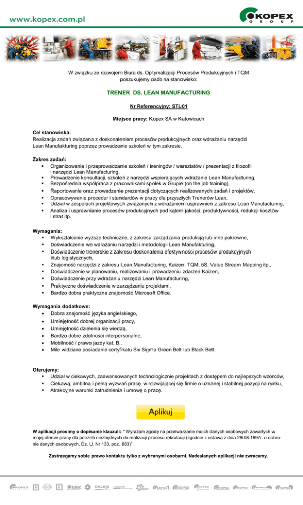 W związku ze rozwojem Biura ds. Optymalizacji Procesów Produkcyjnych i TQM poszukujemy osób na stanowisko: TRENER DS. LEAN MANUFACTURING Nr Referencyjny: STL01 Miejsce pracy: Kopex SA w Katowicach Cel stanowiska: Realizacja zadań związana z doskonaleniem procesów produkcyjnych oraz wdrażaniu narzędzi Lean Manufakturing poprzez prowadzenie szkoleń w tym zakresie. Zakres zadań: Organizowanie i przeprowadzanie szkoleń / treningów / warsztatów / prezentacji z filozofii i narzędzi Lean Manufacturing, Prowadzenie konsultacji, szkoleń z narzędzi wspierających wdrażanie Lean Manufacturing, Bezpośrednia współpraca z pracownikami spółek w Grupie (on the job training), Raportowanie oraz prowadzenie prezentacji dotyczących realizowanych zadań i projektów, Opracowywanie procedur i standardów w pracy dla przyszłych Trenerów Lean, Udział w zespołach projektowych związanych z wdrażaniem usprawnień z zakresu Lean Manufacturing, Analiza i usprawnianie procesów produkcyjnych pod kątem jakości, produktywności, redukcji kosztów i strat itp. Wymagania: Wykształcenie wyższe techniczne, z zakresu zarządzania produkcją lub inne pokrewne, Doświadczenie we wdrażaniu narzędzi i metodologii Lean Manufakturing, Doświadczenie trenerskie z zakresu doskonalenia efektywności procesów produkcyjnych i/lub logistycznych, Znajomość narzędzi z zakresu Lean Manufacturing, Kaizen. TQM, 5S, Value Stream Mapping itp., Doświadczenie w planowaniu, realizowaniu i prowadzeniu zdarzeń Kaizen, Doświadczenie przy wdrażaniu narzędzi Lean Manufacturing, Praktyczne doświadczenie w zarządzaniu projektami, Bardzo dobra praktyczna znajomość Microsoft Office. Wymagania dodatkowe: Dobra znajomość języka angielskiego, Umiejętność dobrej organizacji pracy, Umiejętność dzielenia się wiedzą, Bardzo dobre zdolności interpersonalne, Mobilność / prawo jazdy kat. B., Mile widziane posiadanie certyfikatu Six Sigma Green Belt lub Black Belt. Oferujemy: Udział w ciekawych, zaawansowanych technologicznie projektach z dostępem do najlepszych wzorców, Ciekawą, ambitną i pełną wyzwań pracę w rozwijającej się firmie o uznanej i stabilnej pozycji na rynku, Atrakcyjne warunki zatrudnienia i umowę o pracę. W aplikacji prosimy o dopisanie klauzuli: " Wyrażam zgodę na przetwarzanie moich danych osobowych zawartych w mojej ofercie pracy dla potrzeb niezbędnych do realizacji procesu rekrutacji (zgodnie z ustawą z dnia 29.08.1997r. o ochronie danych osobowych, Dz. U. Nr 133, poz. 883)". Zastrzegamy sobie prawo kontaktu tylko z wybranymi osobami. Nadesłanych aplikacji nie zwracamy.