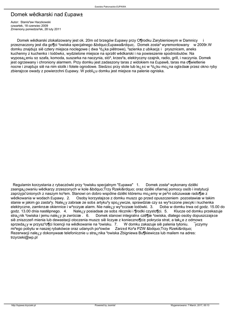 £owisko Patronackie £UPAWA Domek wêdkarski nad £upaw± Autor: Stanis³aw Haczkowski czwartek, 18 czerwiec 2009 Zmieniony poniedzia³ek, 28 luty 2011 Domek wêdkarski zlokalizowany jest ok. 20m od brzegów £upawy przy O¶rodku Zarybieniowym w Damnicy i przeznaczony jest dla go¶ci ³owiska specjalnego „£upawa”. Domek zosta³ wyremontowany w 2009r.W domku znajduj± siê cztery miejsca noclegowe ( dwa ³ó¿ka piêtrowe), ³azienka z ubikacj± i prysznicem, aneks kuchenny z kuchenk± i lodówk±, wydzielone miejsce na sprzêt wêdkarski i na powieszenie spodniobutów. Na wyposa¿eniu s± szafa, komoda, suszarka na naczynia, stó³, krzes³a, elektryczny czajnik, radio, grill, i naczynia. Domek jest ogrzewany i chroniony alarmem. Przy domku jest zadaszony taras z widokiem na £upawê, taras ma o¶wietlenie nocne i znajduj± siê na nim stolik i fotele ogrodowe. Siedz±c przy stole lub le¿±c w ³ó¿ku mo¿na ogl±daæ przez okno ryby zbieraj±ce owady z powierzchni £upawy. W pobli¿u domku jest miejsce na palenie ogniska. Regulamin korzystania z rybaczówki przy ³owisku specjalnym "£upawa" 1. Domek zosta³ wykonany dziêki zaanga¿owaniu wêdkarzy zrzeszonych w kole „Trzy Rzeki” oraz dziêki ofiarnej pomocy osób i instytucji zaprzyja¼nionych z naszym ko³em. Stanowi on dobro wspólne dziêki któremu mo¿emy w pe³ni odczuwaæ rado¶æ z wêdkowania w wodach £upawy. 2. Osoby korzystaj±ce z domku musz± go przed opuszczeniem pozostawiæ w takim stanie w jakim go zasta³y. Nale¿y zabraæ ze sob± artyku³y spo¿ywcze, sprawdziæ czy s± wy³±czone piecyki i kuchenka elektryczne, zamkn±æ okiennice i w³±czyæ alarm. Nie nale¿y wy³±czaæ lodówki. 3. Doba w domku trwa od godz. 15.00 do godz. 13.00 dnia nastêpnego. 4. Nale¿y posiadaæ ze sob± rêczniki i ¶rodki czysto¶ci. 5. Klucze od domku przekazuje stra¿nik ³owiska i jemu nale¿y je zwróciæ . 6. Domek stanowi integraln± czê¶æ ³owiska, dlatego osoby dopuszczaj±ce siê zniszczeñ mienia lub dewastacji otoczenia musz± siê liczyæ z konieczno¶ci± pokrycia strat, a tak¿e z odmow± sprzeda¿y w przysz³o¶ci licencji na wêdkowanie na ³owisku. 7. W domku zakazuje siê palenia tytoniu. ¯yczymy mi³ego pobytu w naszej rybakówce oraz udanych po³owów Zarz±d Ko³a PZW „Trzy Rzeki” Rezerwacji nale¿y dokonywaæ telefonicznie u stra¿nika ³owiska Zbigniewa Bu¶kiewicza lub mailem na adres: [email protected] http://lupawa.trzyrzeki.pl Powered by Joomla! Wygenerowano: 7 March, 2017, 00:13