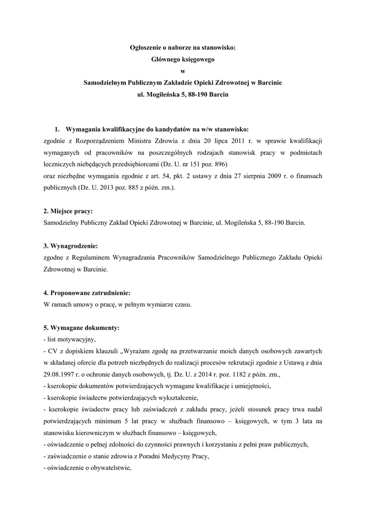 Ogłoszenie o naborze na stanowisko: Głównego księgowego w Samodzielnym Publicznym Zakładzie Opieki Zdrowotnej w Barcinie ul. Mogileńska 5, 88-190 Barcin 1. Wymagania kwalifikacyjne do kandydatów na w/w stanowisko: zgodnie z Rozporządzeniem Ministra Zdrowia z dnia 20 lipca 2011 r. w sprawie kwalifikacji wymaganych od pracowników na poszczególnych rodzajach stanowisk pracy w podmiotach leczniczych niebędących przedsiębiorcami (Dz. U. nr 151 poz. 896) oraz niezbędne wymagania zgodnie z art. 54, pkt. 2 ustawy z dnia 27 sierpnia 2009 r. o finansach publicznych (Dz. U. 2013 poz. 885 z późn. zm.). 2. Miejsce pracy: Samodzielny Publiczny Zakład Opieki Zdrowotnej w Barcinie, ul. Mogileńska 5, 88-190 Barcin. 3. Wynagrodzenie: zgodne z Regulaminem Wynagradzania Pracowników Samodzielnego Publicznego Zakładu Opieki Zdrowotnej w Barcinie. 4. Proponowane zatrudnienie: W ramach umowy o pracę, w pełnym wymiarze czasu. 5. Wymagane dokumenty: - list motywacyjny, - CV z dopiskiem klauzuli „Wyrażam zgodę na przetwarzanie moich danych osobowych zawartych w składanej ofercie dla potrzeb niezbędnych do realizacji procesów rekrutacji zgodnie z Ustawą z dnia 29.08.1997 r. o ochronie danych osobowych, tj. Dz. U. z 2014 r. poz. 1182 z późn. zm., - kserokopie dokumentów potwierdzających wymagane kwalifikacje i umiejętności, - kserokopie świadectw potwierdzających wykształcenie, - kserokopie świadectw pracy lub zaświadczeń z zakładu pracy, jeżeli stosunek pracy trwa nadal potwierdzających minimum 5 lat pracy w służbach finansowo – księgowych, w tym 3 lata na stanowisku kierowniczym w służbach finansowo – księgowych, - oświadczenie o pełnej zdolności do czynności prawnych i korzystaniu z pełni praw publicznych, - zaświadczenie o stanie zdrowia z Poradni Medycyny Pracy, - oświadczenie o obywatelstwie, - zaświadczenie o niekaralności. Kopie załączonych dokumentów aplikacyjnych powinny zostać opatrzone klauzulą: „Za zgodność z oryginałem” i podpisem kandydata. 6. Termin i miejsce składania dokumentów: do dnia 19 czerwca 2015 r. do godz. 12.00 w pokoju administracji Samodzielnego Publicznego Zakładu Opieki Zdrowotnej w Barcinie, ul. Mogileńska 5, 88-190 Barcin. 7. Sposób składania dokumentów: w kopercie zamkniętej z dopiskiem „Konkurs na stanowisko Głównego księgowego”. 8. Dodatkowe informacje: 1. Kontakt: Dyrektor SPZOZ w Barcinie – mgr Alicja Wiczewska tel. 609-071-410 lub Starszy specjalista ds. zasobów ludzkich, organizacji i rozliczeń – mgr Magdalena Paszkiet (52) 383-28-54. 2. Aplikacje, które wpłyną po wskazanym terminie nie będą rozpatrywane (o zachowaniu terminu decyduje data wpływu). Za datę wpływu uważa się datę i godzinę złożenia aplikacji w miejscu określonym w pkt. 6. 3. Kandydaci spełniający wymagania formalne zobowiązani są do poddania się rozmowie kwalifikacyjnej, o której zostaną powiadomieni telefonicznie dnia 19.06.2015 r. 4. Informacja o wynikach rekrutacji: na stronie internetowej spzozbip.barcin.pl oraz telefonicznie. 5. Dokumenty aplikacyjne kandydatów, którzy nie zakwalifikowali się do postępowania nie zostaną zwrócone. 6. Dyrektor może odstąpić od postępowania – naboru na stanowisko głównego księgowego – bez podania przyczyny.